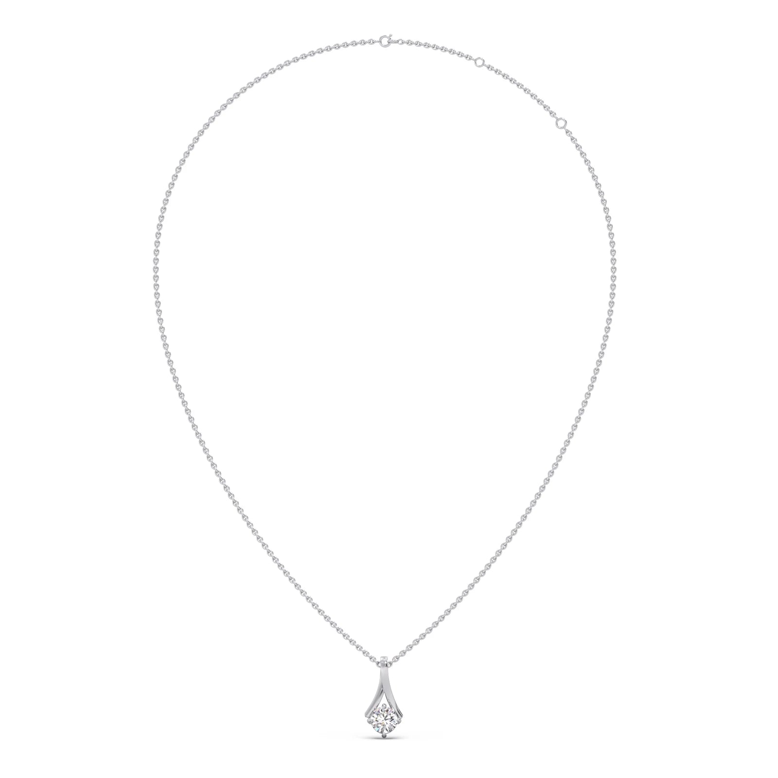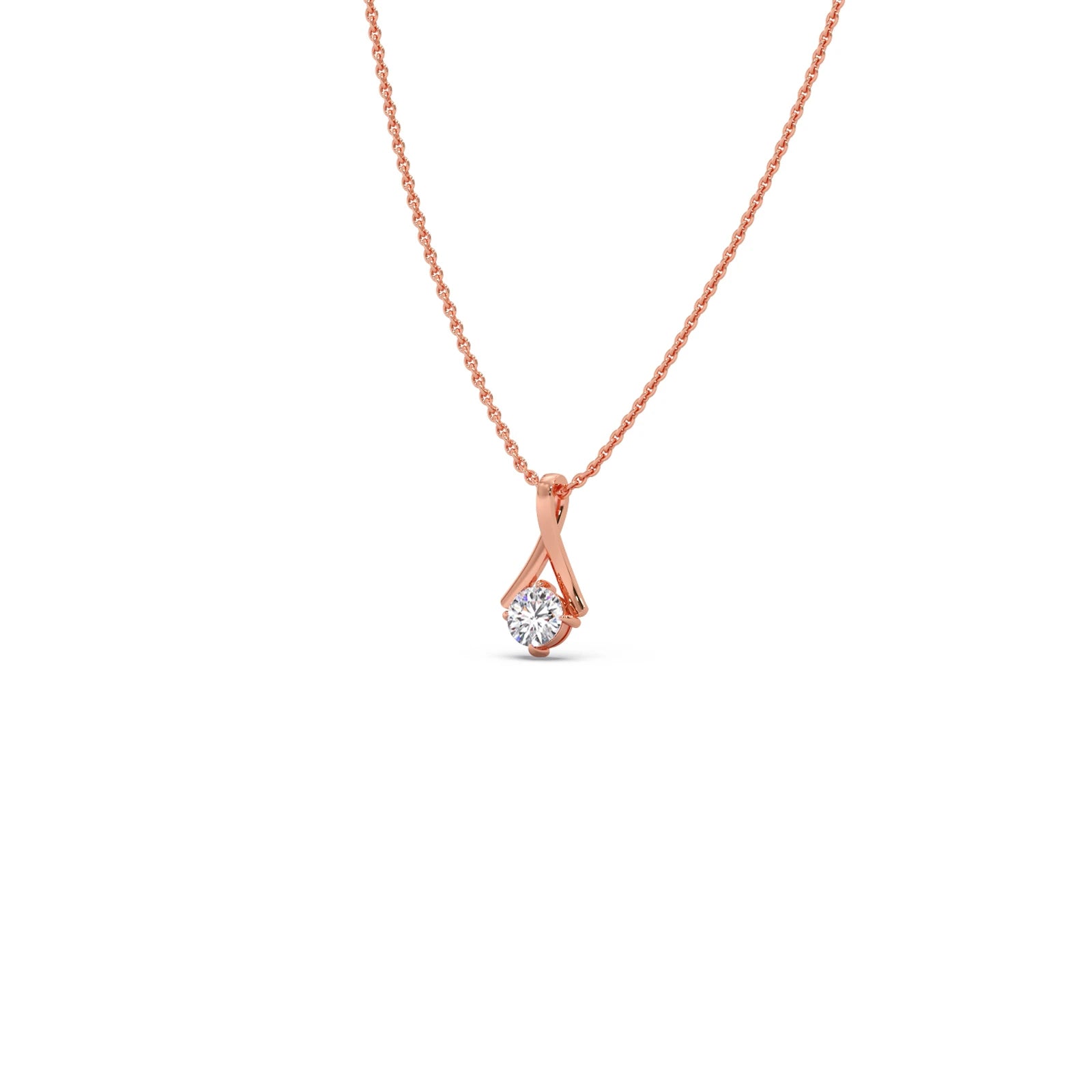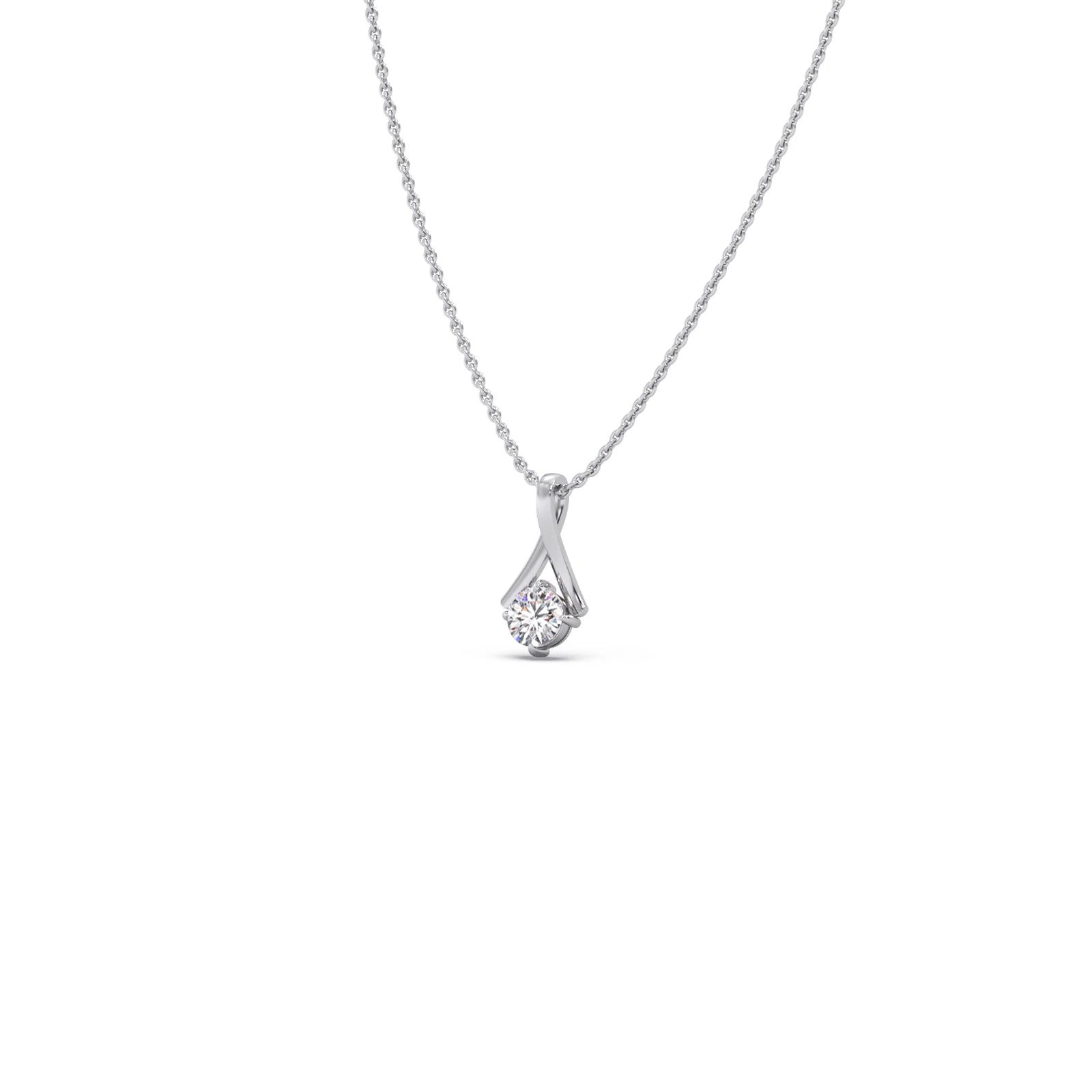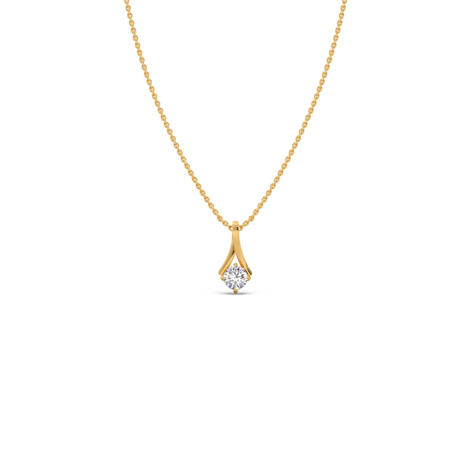 A beautiful round solitaire pendant, crafted with a unique twist. The central round diamond is set within a partial bezel, allowing maximum light to enter and enhance its brilliance. The elegant metalwork curves gracefully upward, adding a touch of modern flair to the classic design.