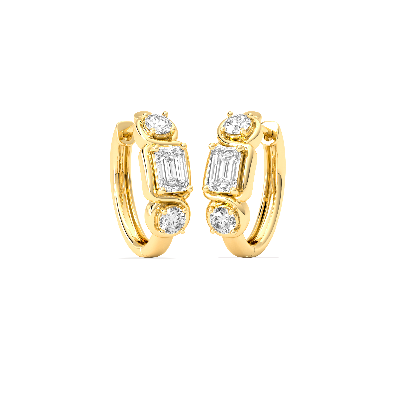 These stylish hoop earrings feature a captivating combination of elegant emerald-cut diamonds and brilliant round-cut diamonds. The contrasting shapes and sparkle create a unique and eye-catching design, perfect for adding a touch of modern sophistication to any ensemble.