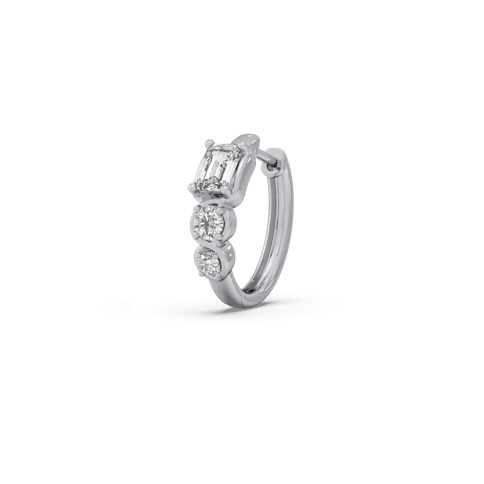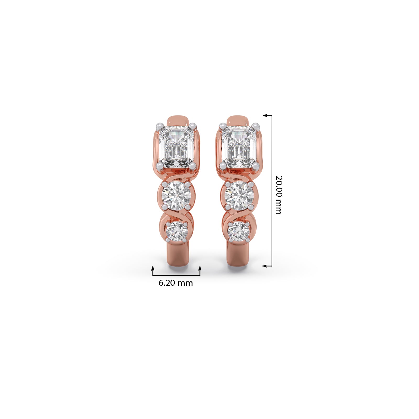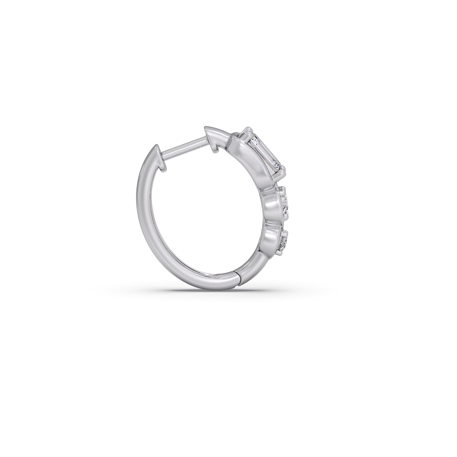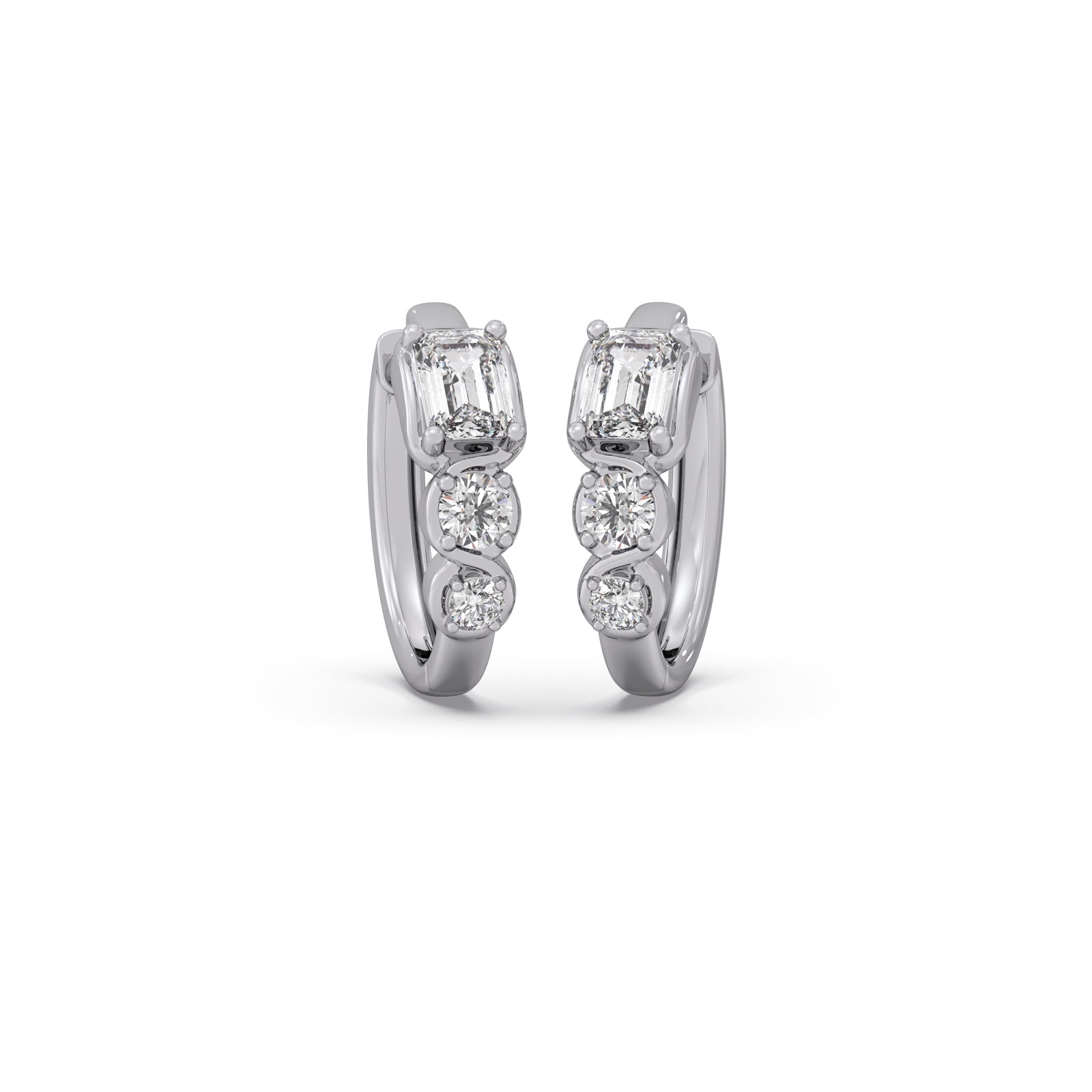 These stylish hoop earrings feature a captivating combination of elegant emerald-cut diamonds and brilliant round-cut diamonds. The contrasting shapes and sparkle create a unique and eye-catching design, perfect for adding a touch of modern sophistication to any ensemble.