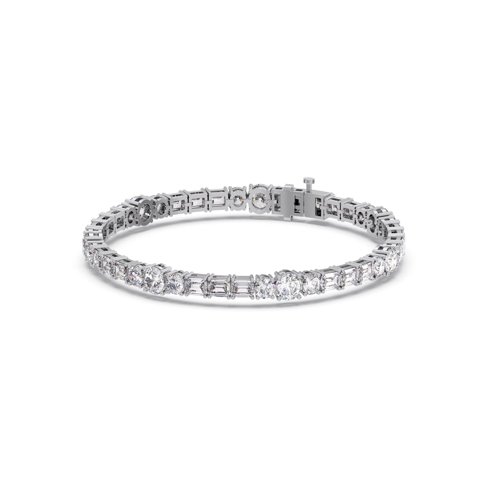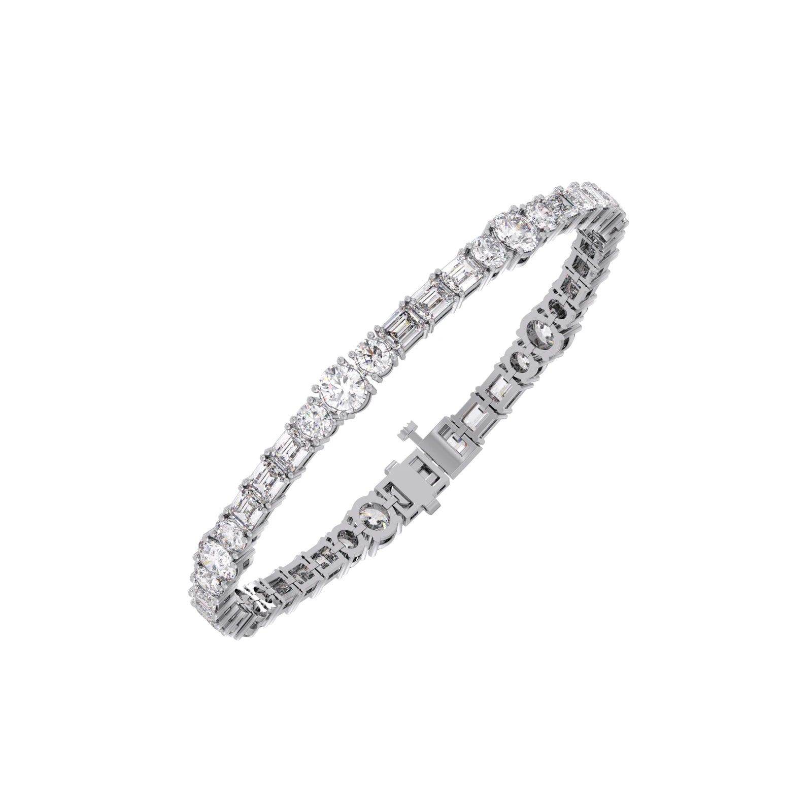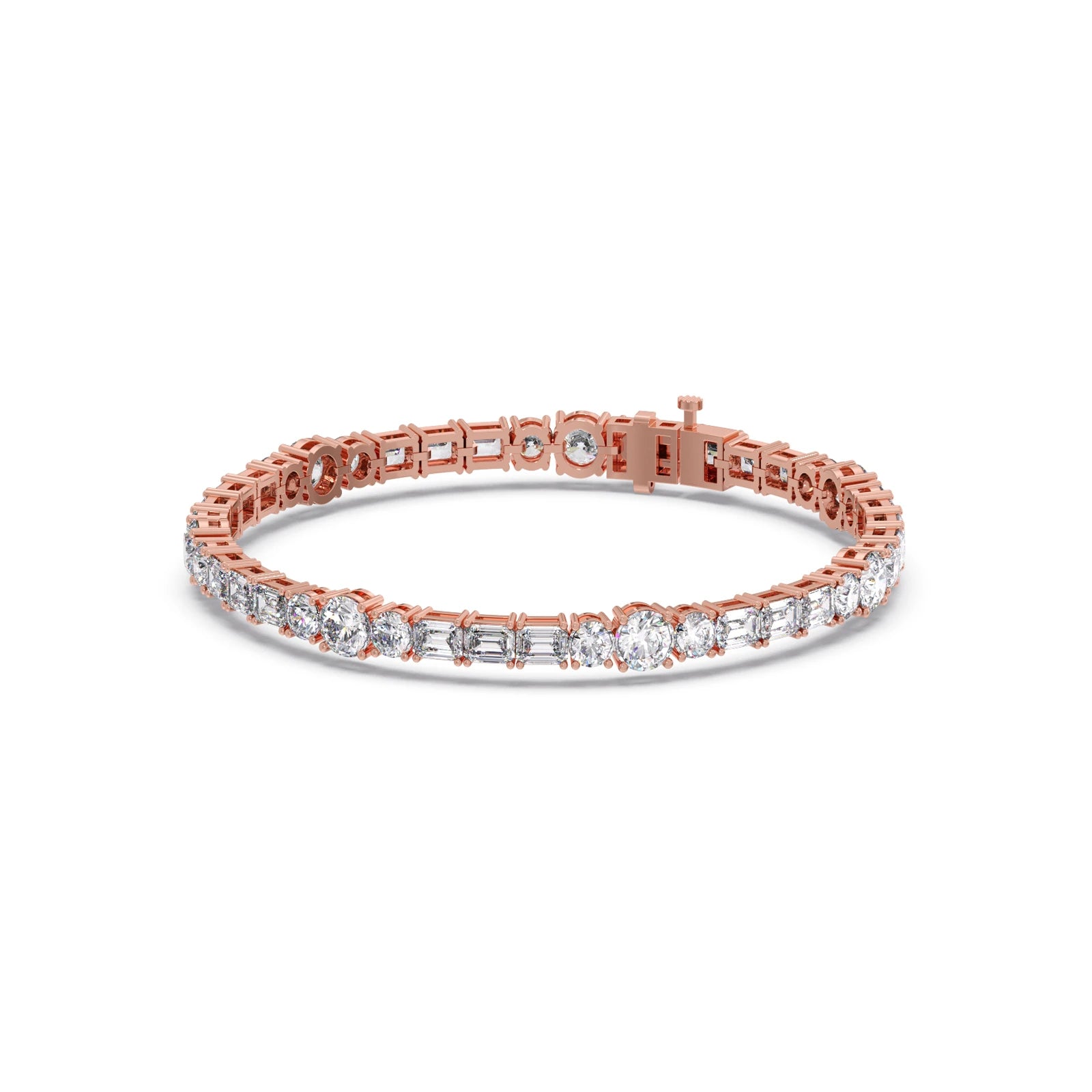 This stunning tennis bracelet showcases a captivating blend of emerald-cut and round diamonds, elegantly set in a continuous, flexible line. The geometric sophistication of the emerald cuts contrasts beautifully with the brilliant sparkle of the round diamonds, creating a timeless piece of refined luxury. Perfect for adding a touch of glamour to any occasion.
