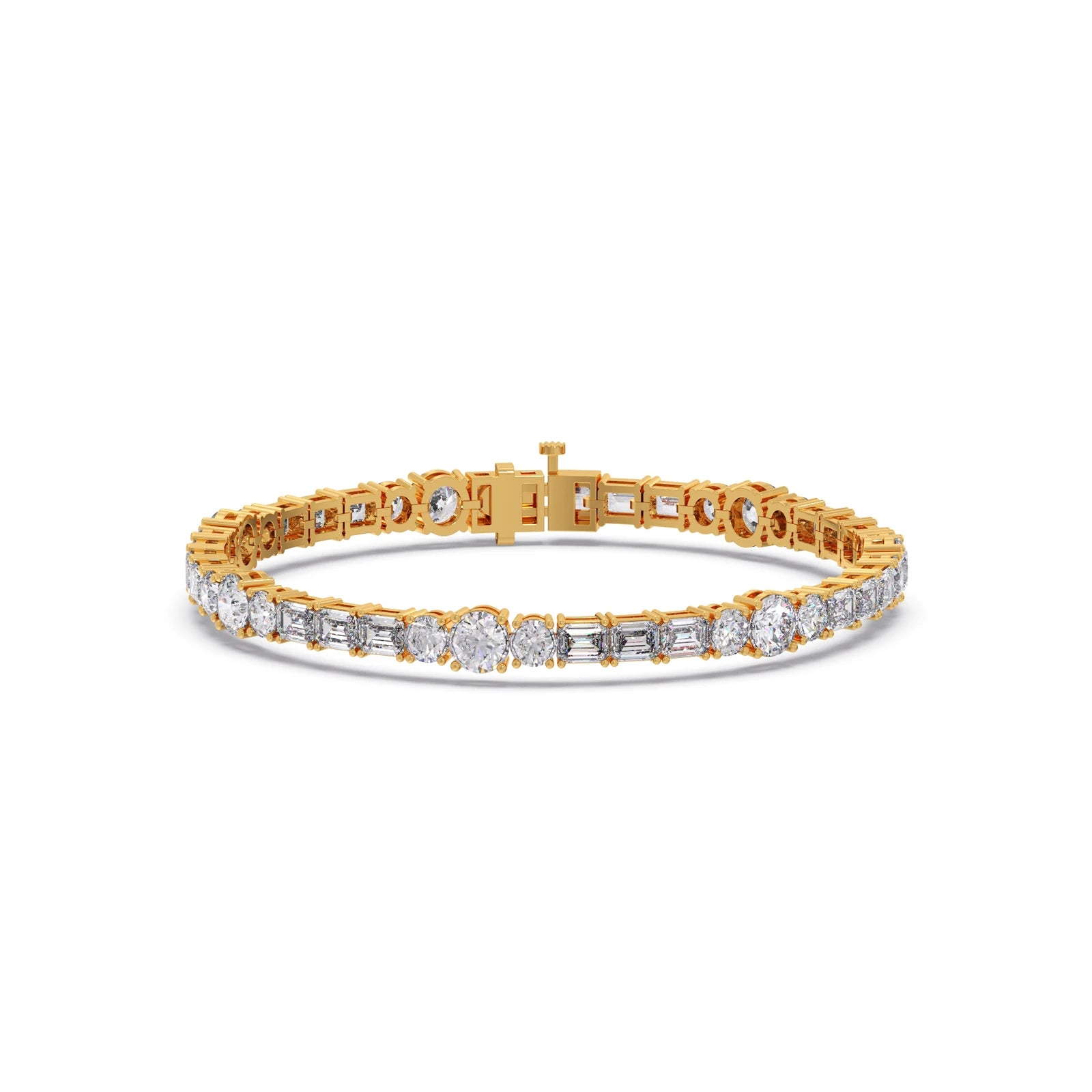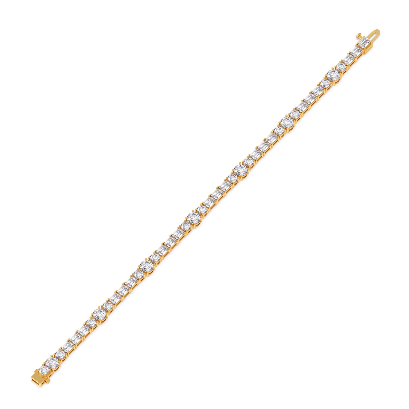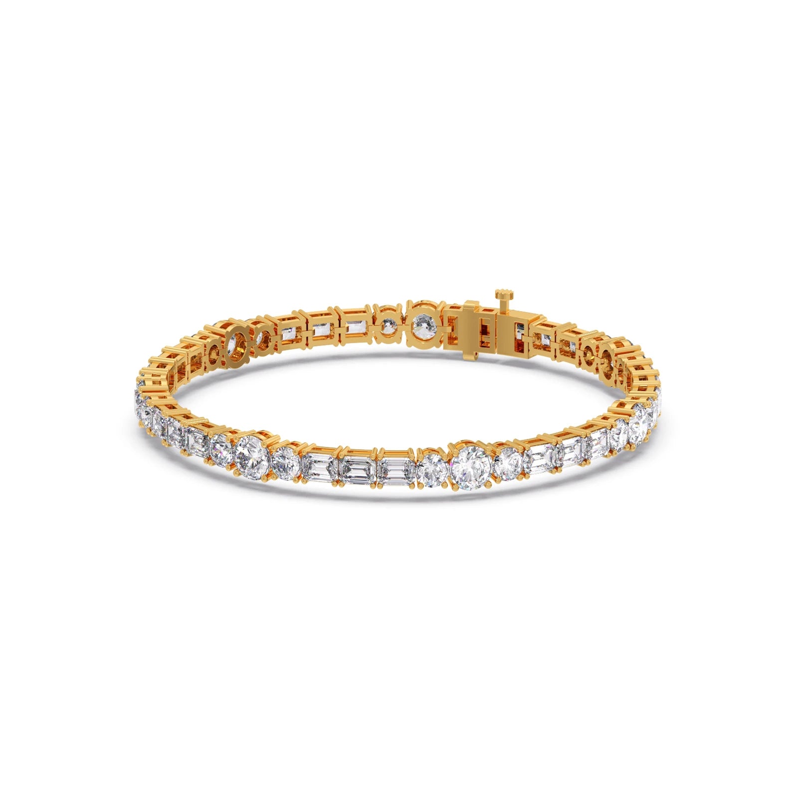 This stunning tennis bracelet showcases a captivating blend of emerald-cut and round diamonds, elegantly set in a continuous, flexible line. The geometric sophistication of the emerald cuts contrasts beautifully with the brilliant sparkle of the round diamonds, creating a timeless piece of refined luxury. Perfect for adding a touch of glamour to any occasion.