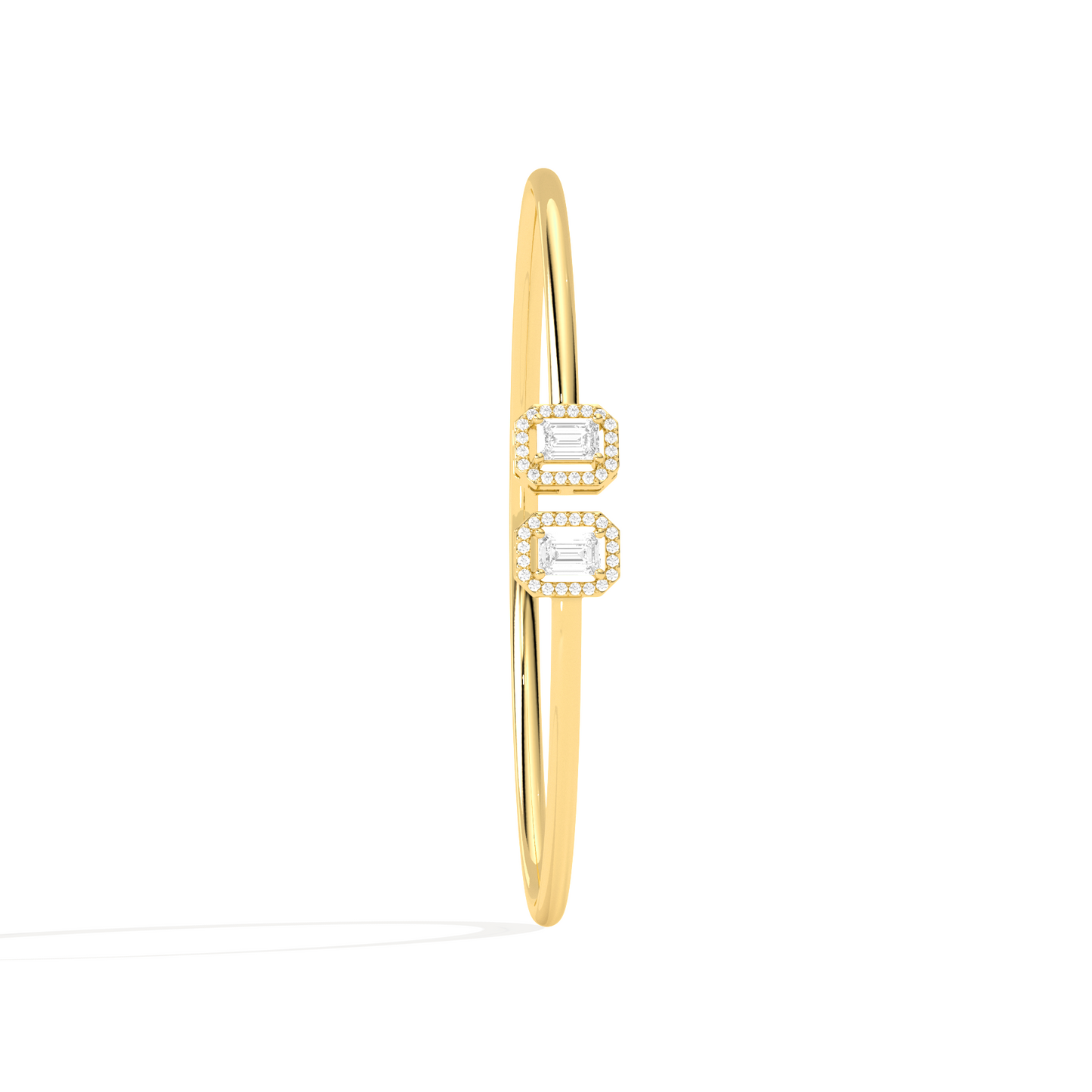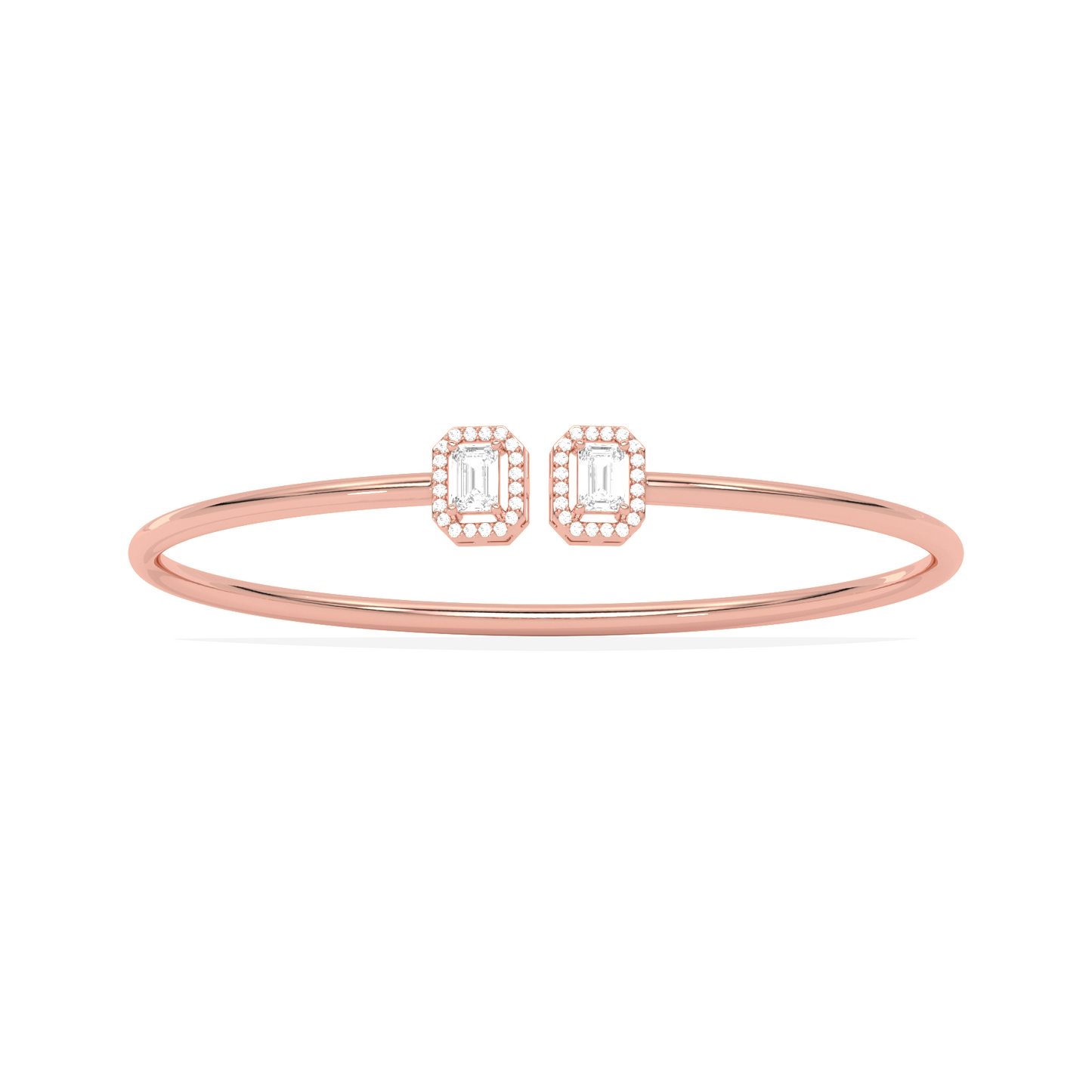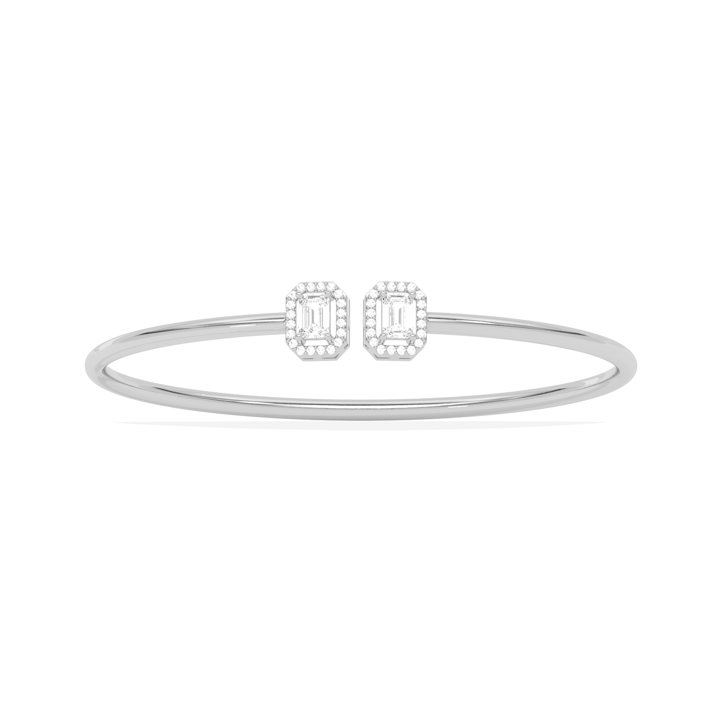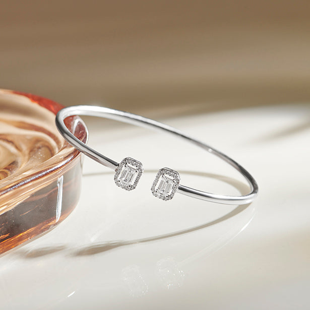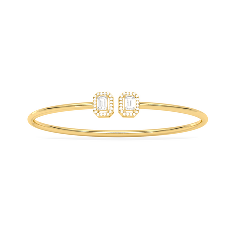 A sleek and sophisticated statement, this Emerald Cut Diamond Cuff Bracelet features two radiant emerald-cut diamonds framed in a delicate halo. Crafted for the modern woman, its open design adds a touch of elegance to any look.