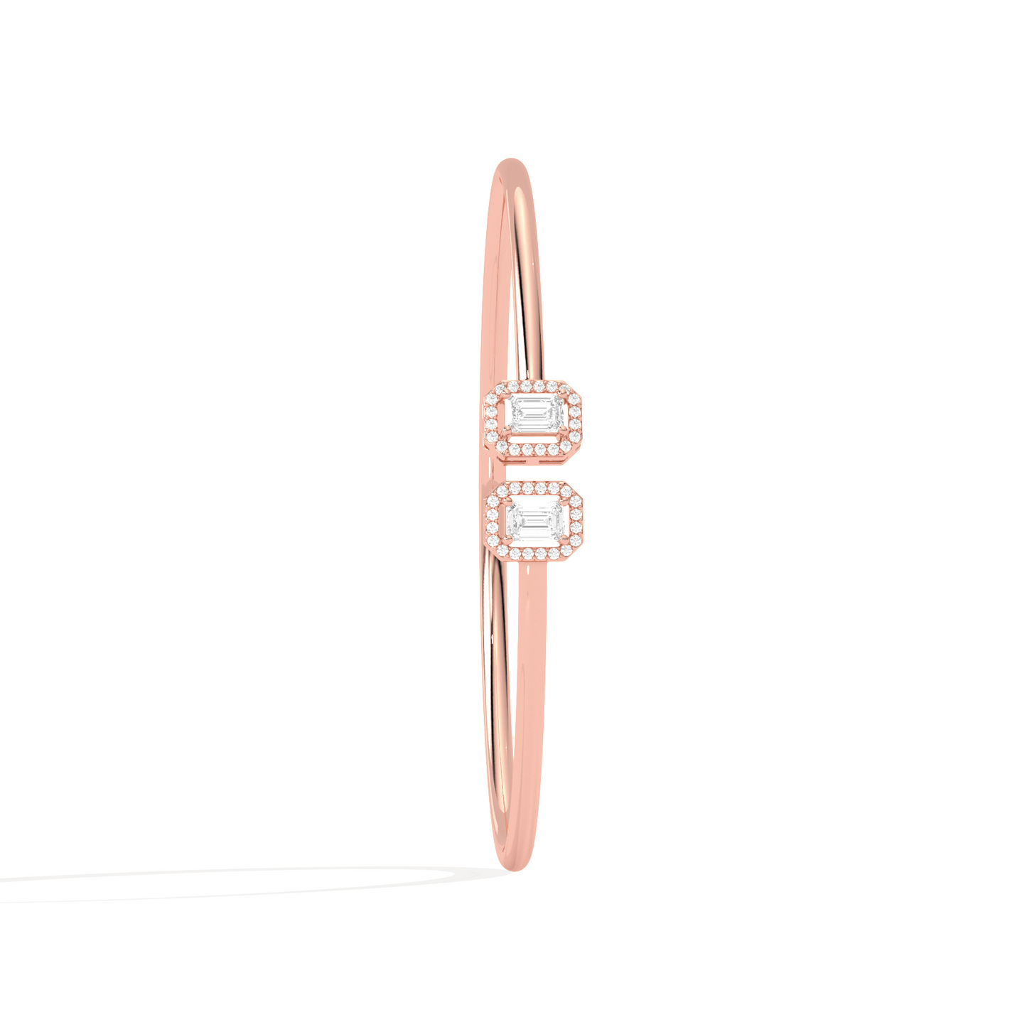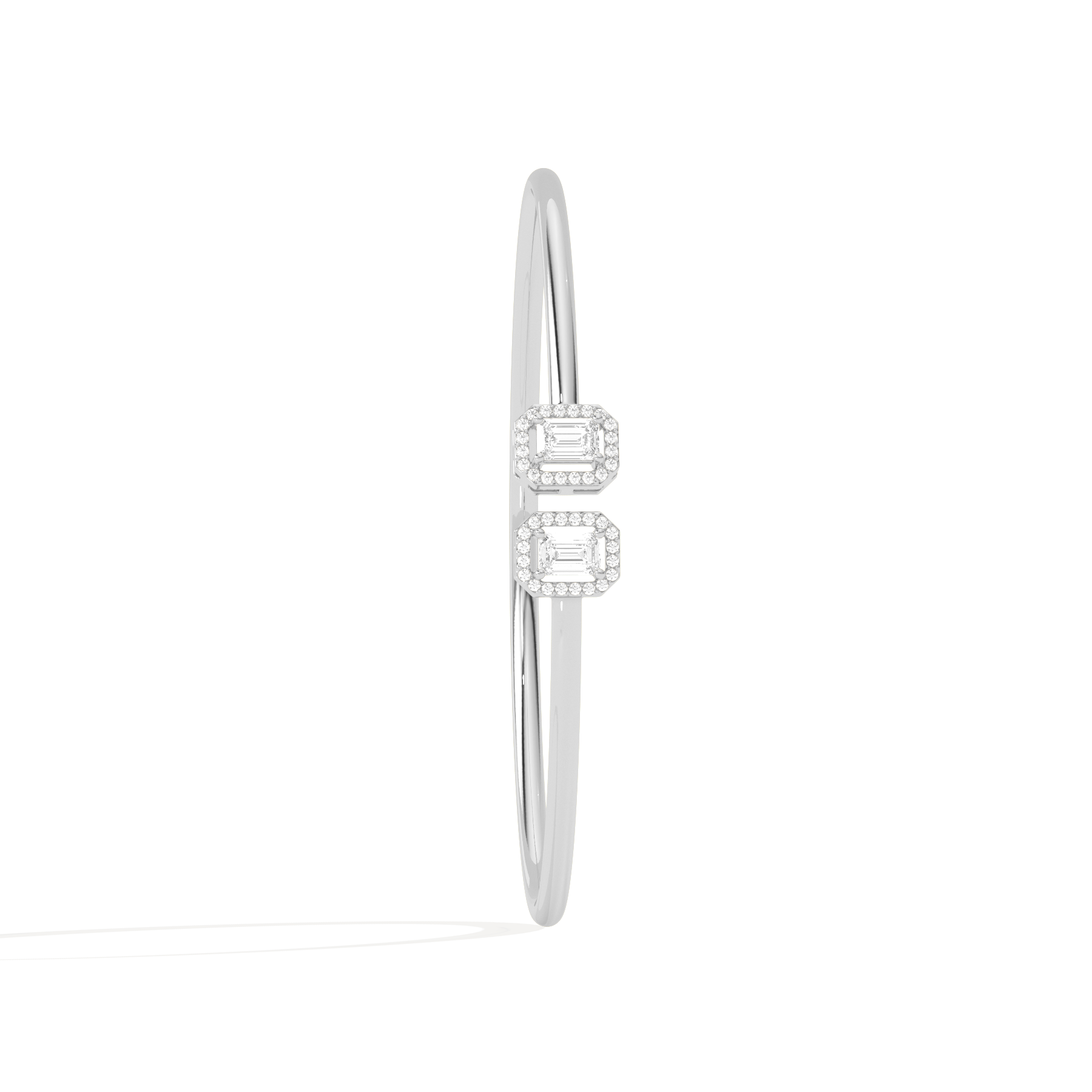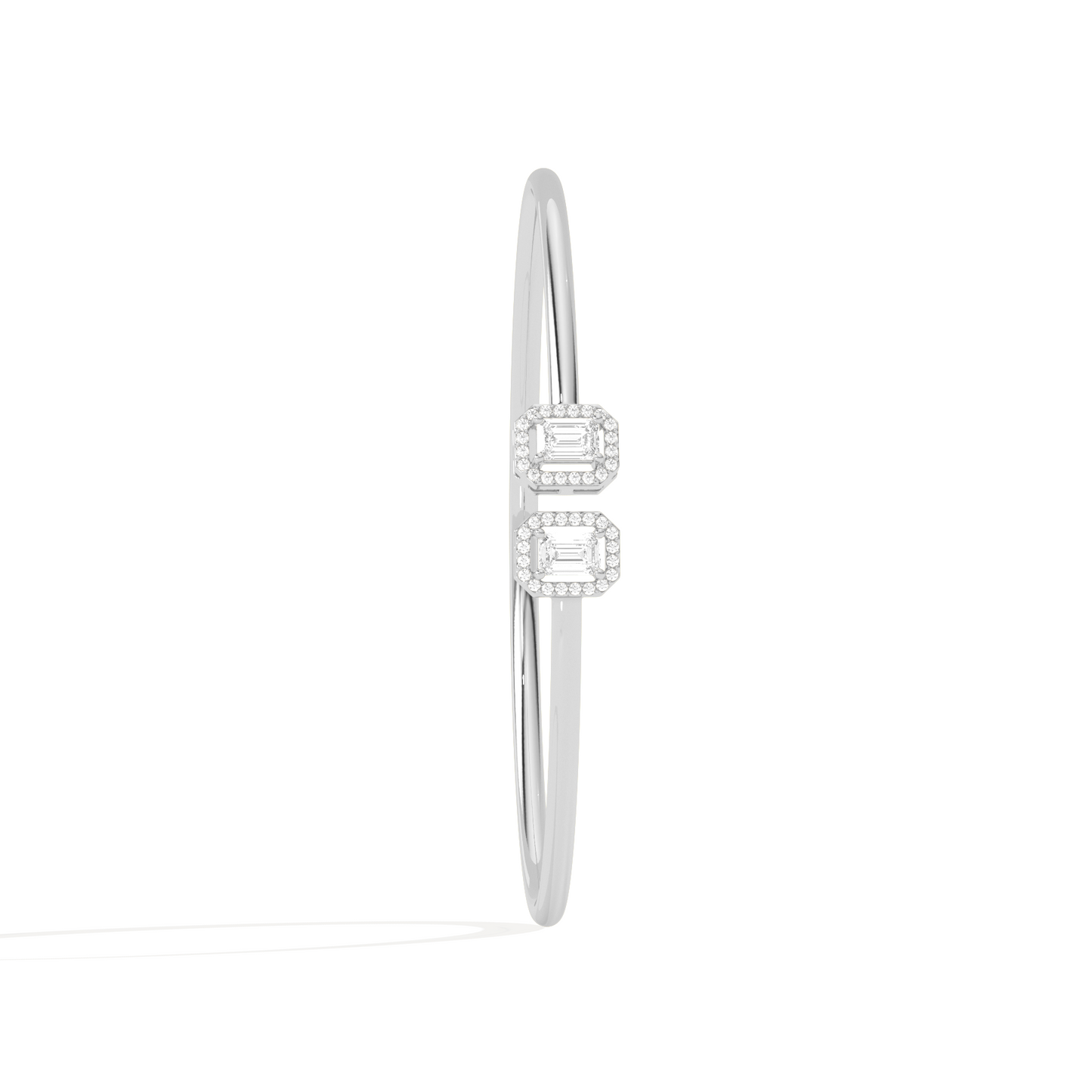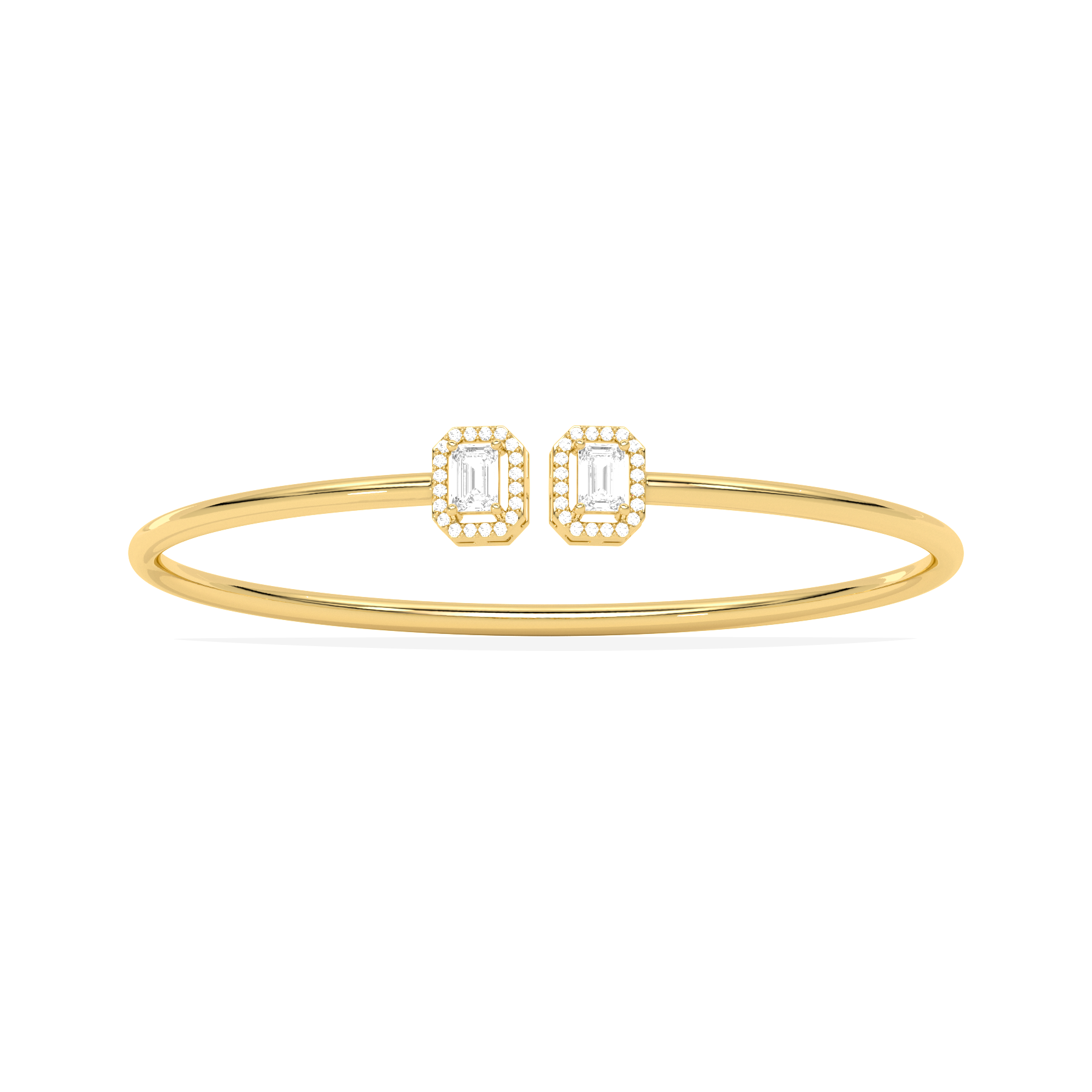 A sleek and sophisticated statement, this Emerald Cut Diamond Cuff Bracelet features two radiant emerald-cut diamonds framed in a delicate halo. Crafted for the modern woman, its open design adds a touch of elegance to any look.