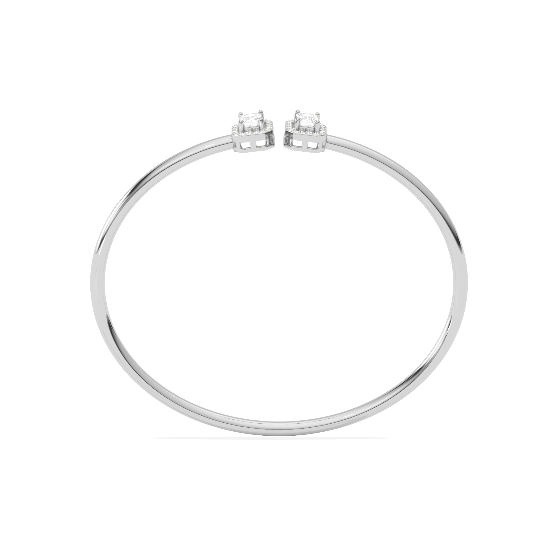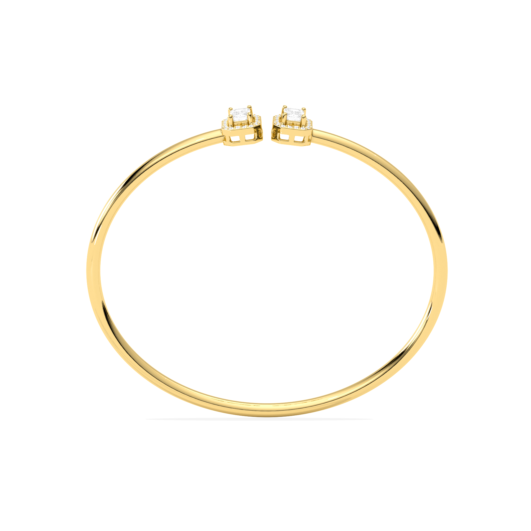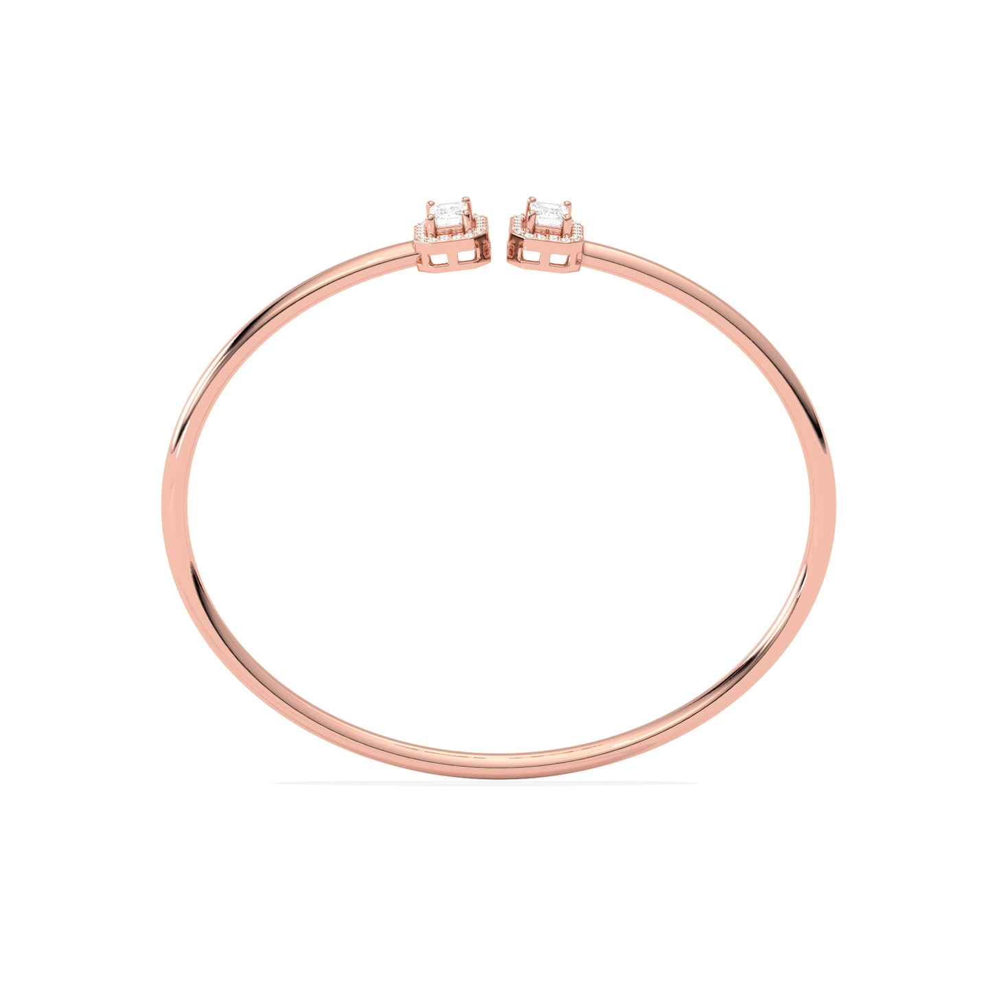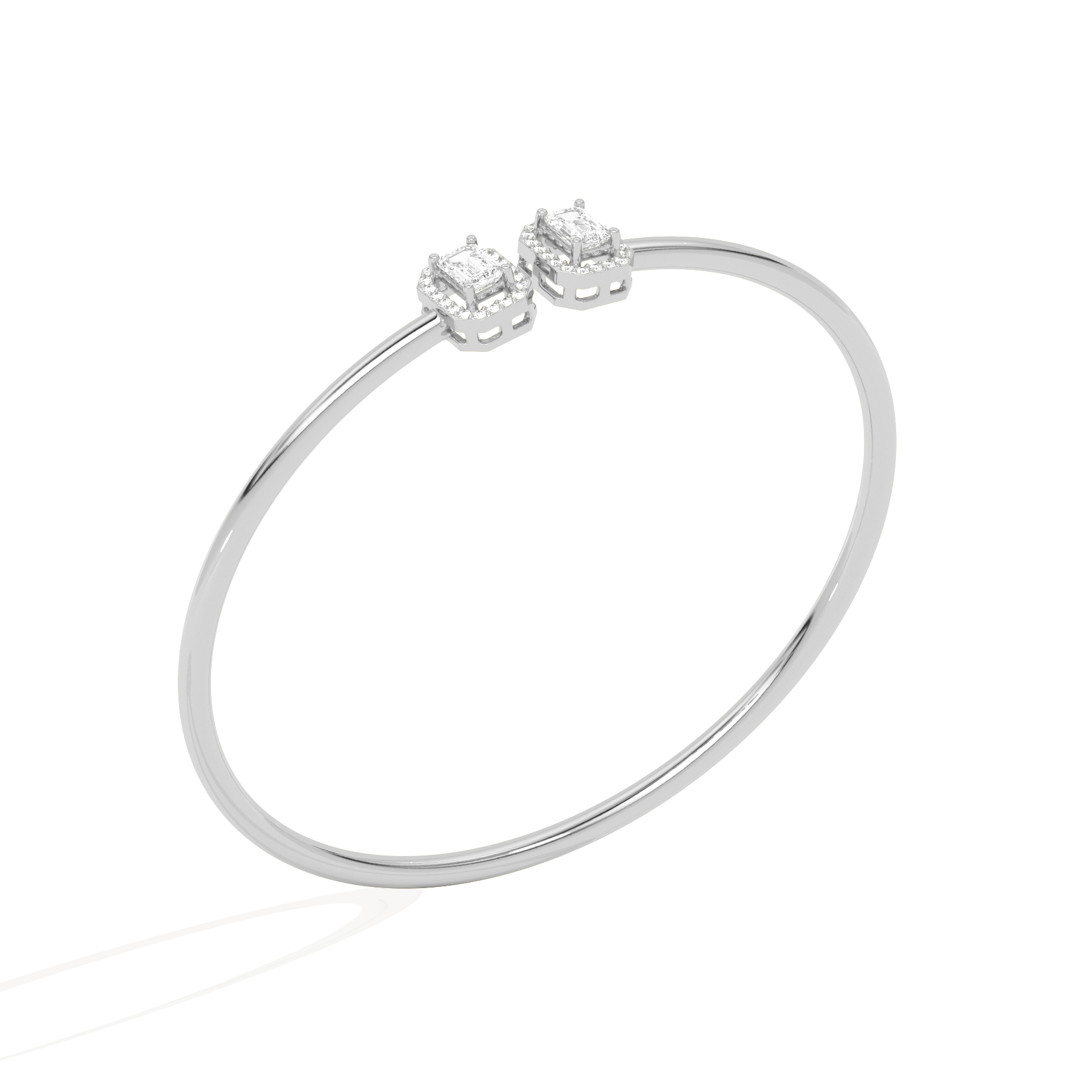 A sleek and sophisticated statement, this Emerald Cut Diamond Cuff Bracelet features two radiant emerald-cut diamonds framed in a delicate halo. Crafted for the modern woman, its open design adds a touch of elegance to any look.