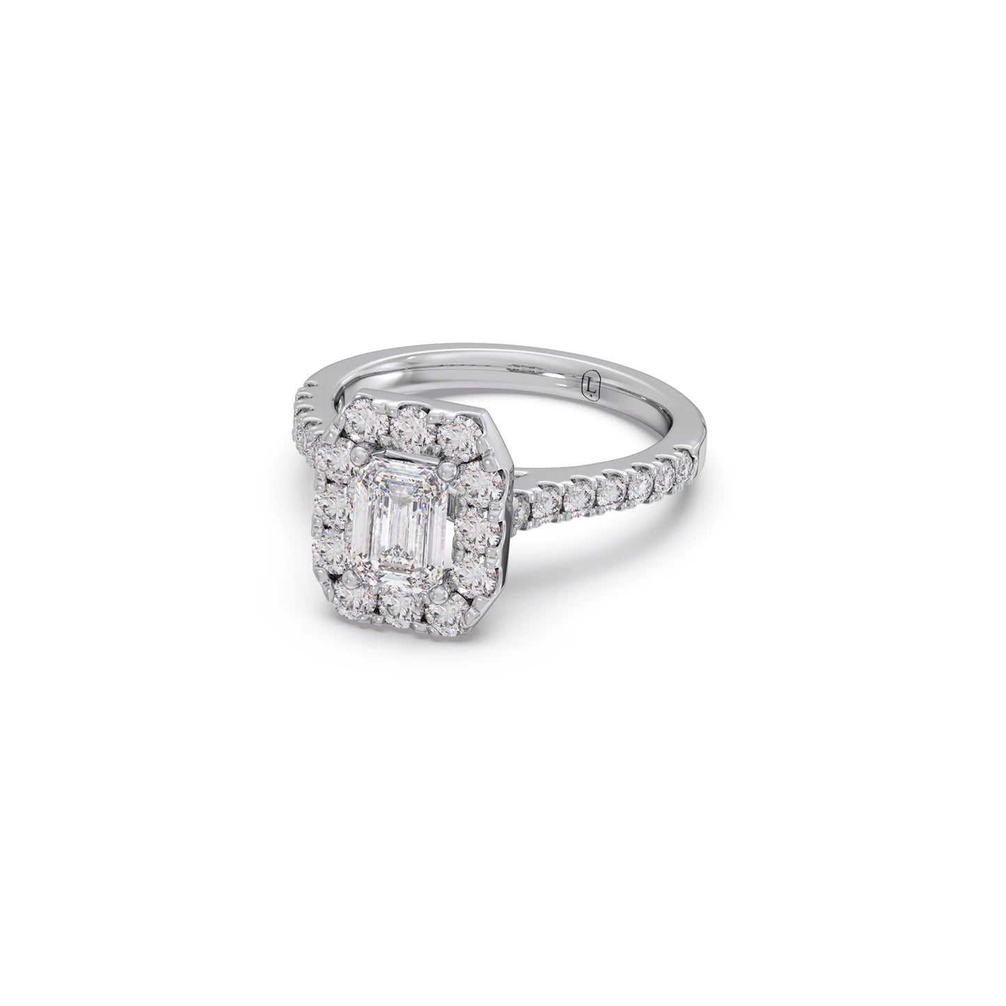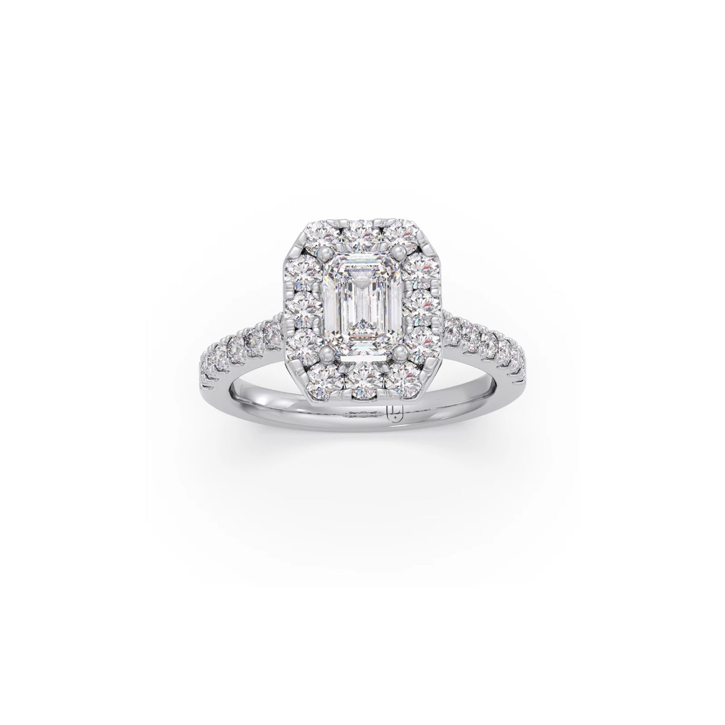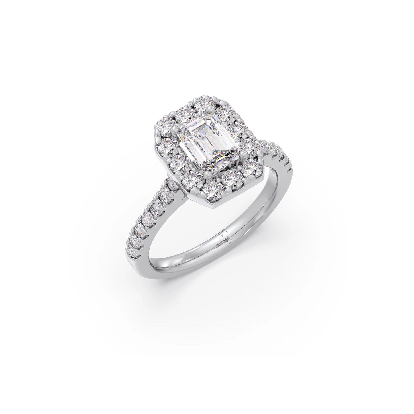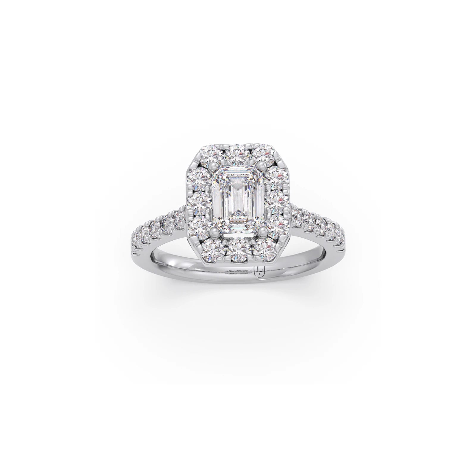 Elegantly classic, this engagement ring features a striking emerald-cut diamond as its focal point. A delicate halo of smaller diamonds encircles the centre stone, enhancing its brilliance and creating a dazzling effect. The clean lines of the emerald cut are beautifully contrasted by the sparkle of the halo, resulting in a timeless and sophisticated symbol of your enduring love.