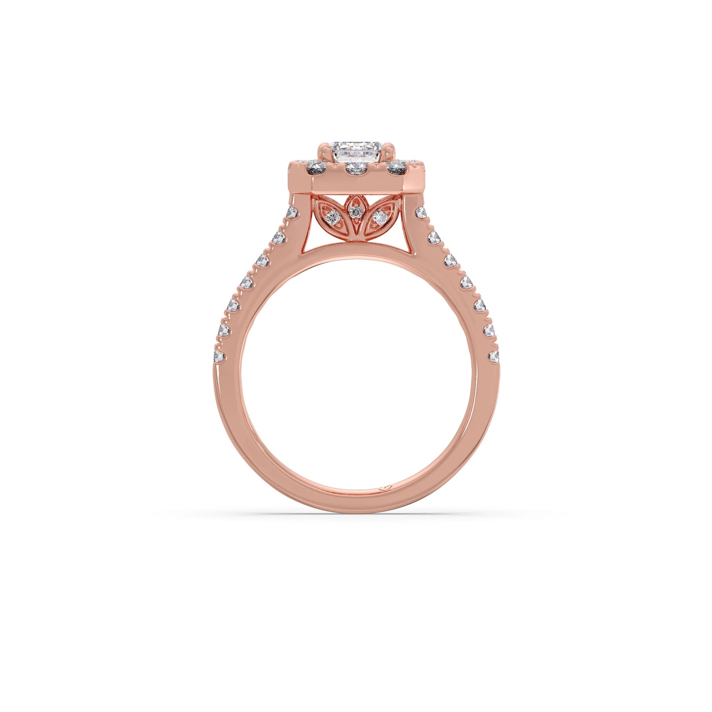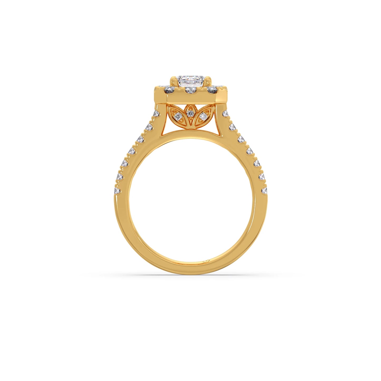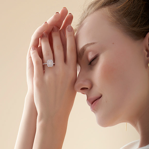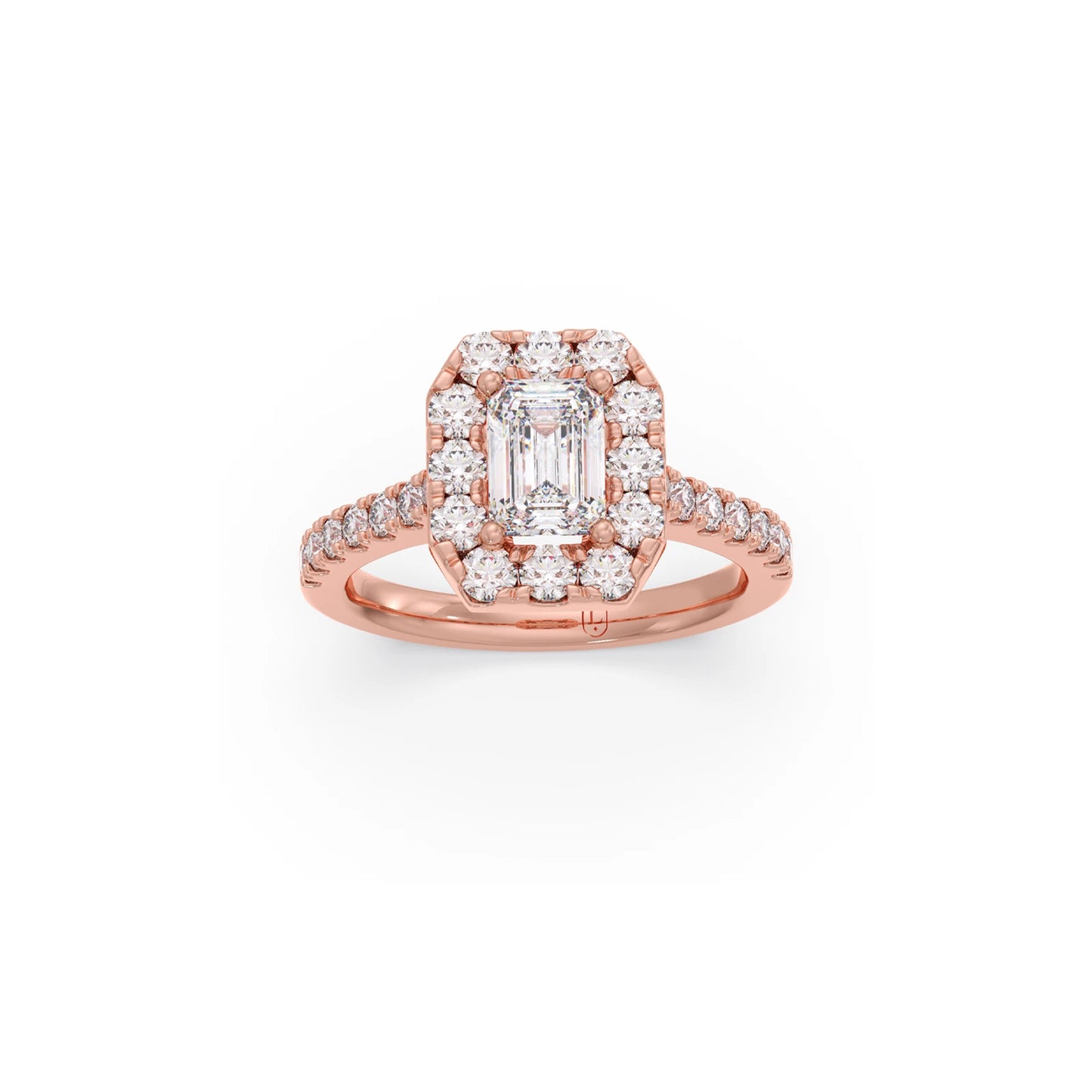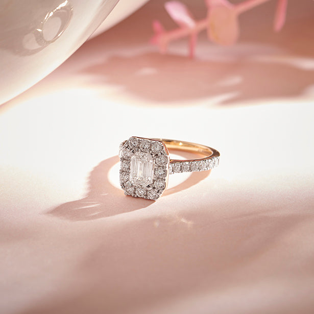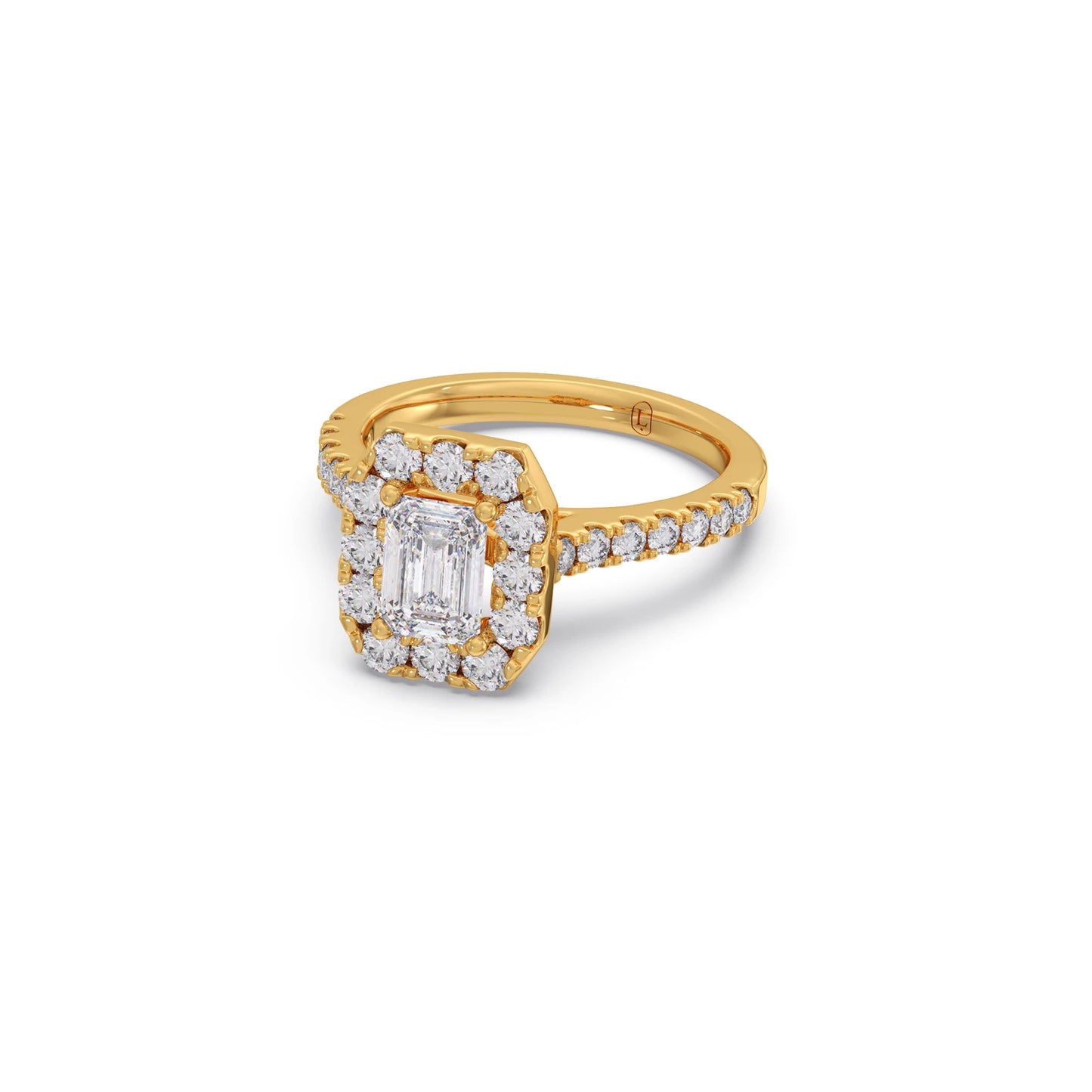 Elegantly classic, this engagement ring features a striking emerald-cut diamond as its focal point. A delicate halo of smaller diamonds encircles the centre stone, enhancing its brilliance and creating a dazzling effect. The clean lines of the emerald cut are beautifully contrasted by the sparkle of the halo, resulting in a timeless and sophisticated symbol of your enduring love.
