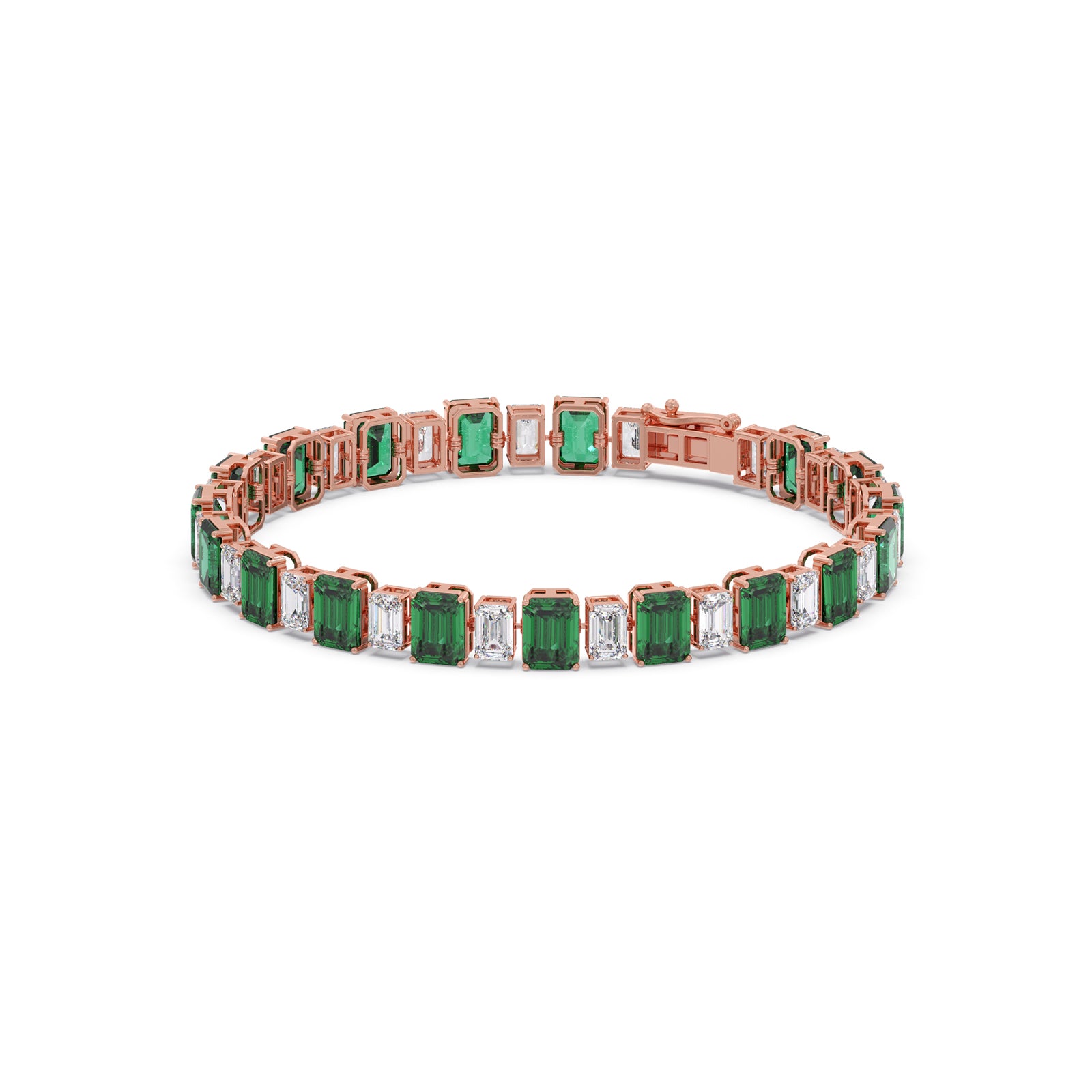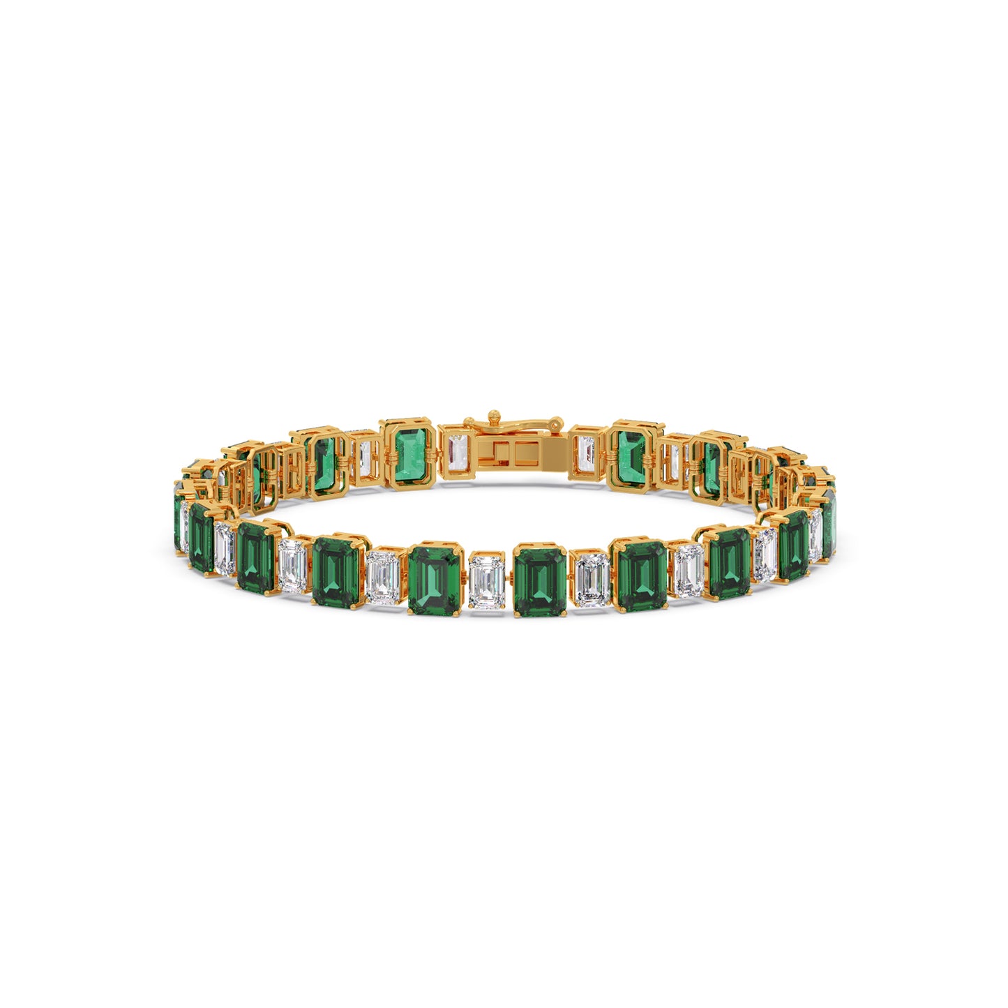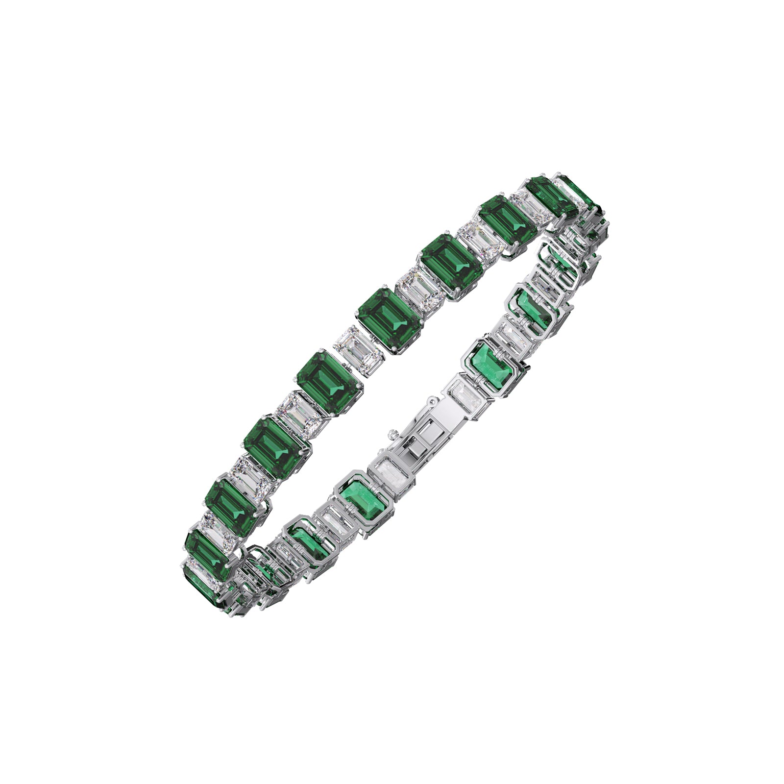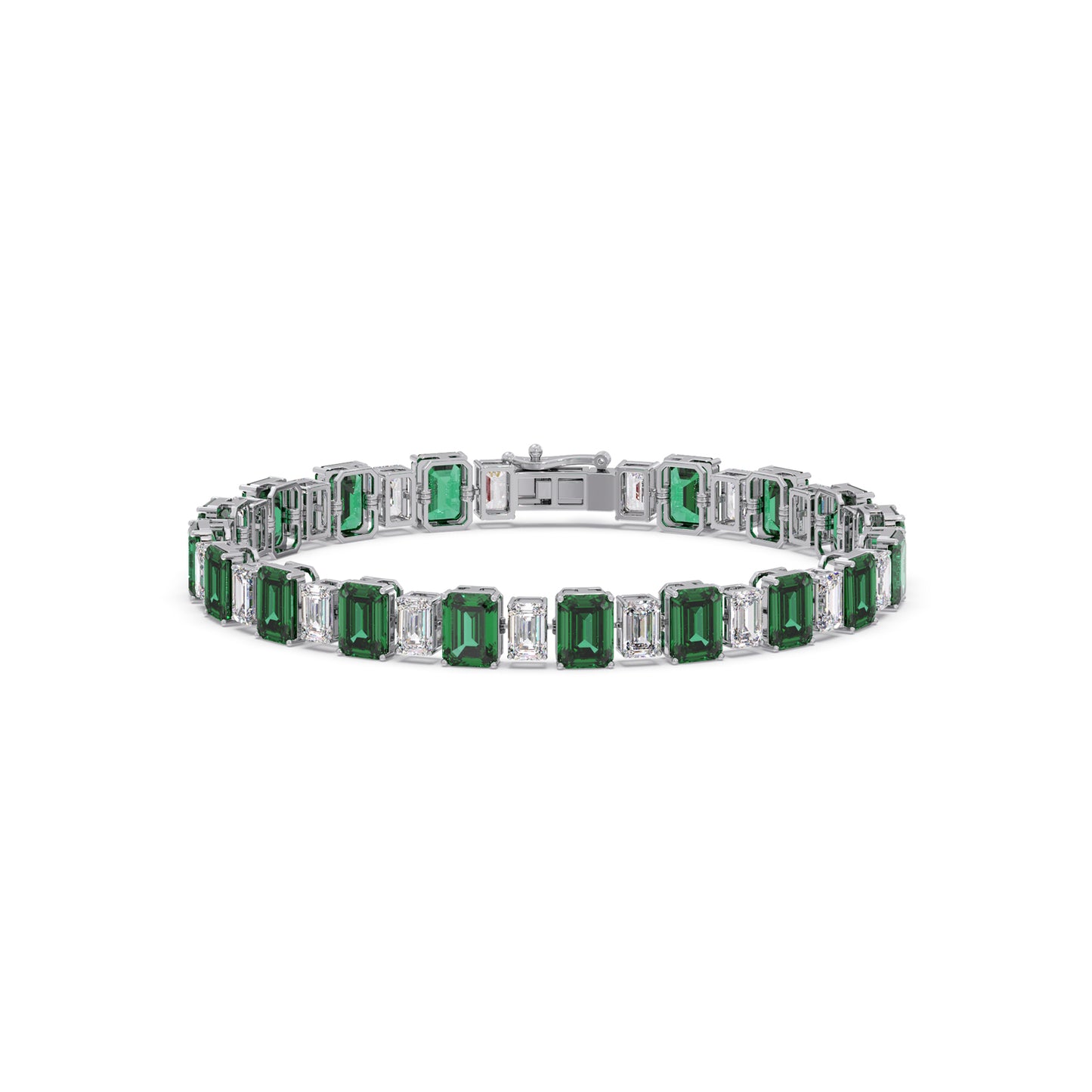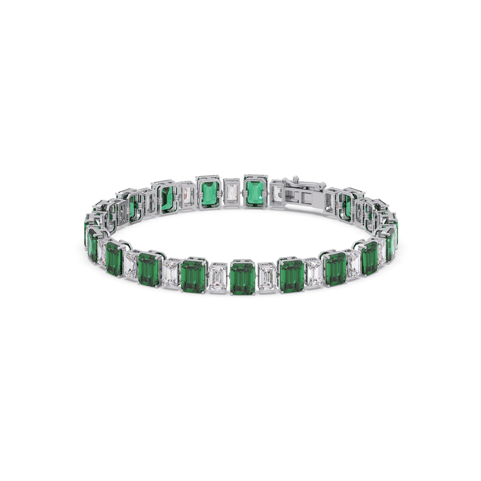 Elegant circular bracelet showcasing 19 Emerald-cut Diamonds of 13.3 ct and 18 Vibrant Green Gemstones of 35.35 ct. The refined design harmoniously blends sparkle with rich green hues for a timeless, sophisticated statement piece.