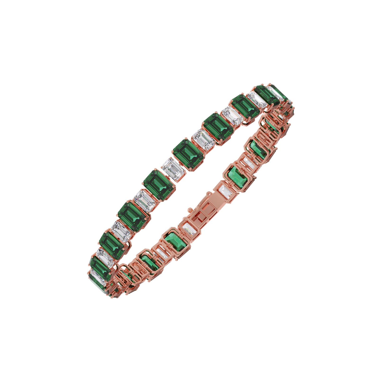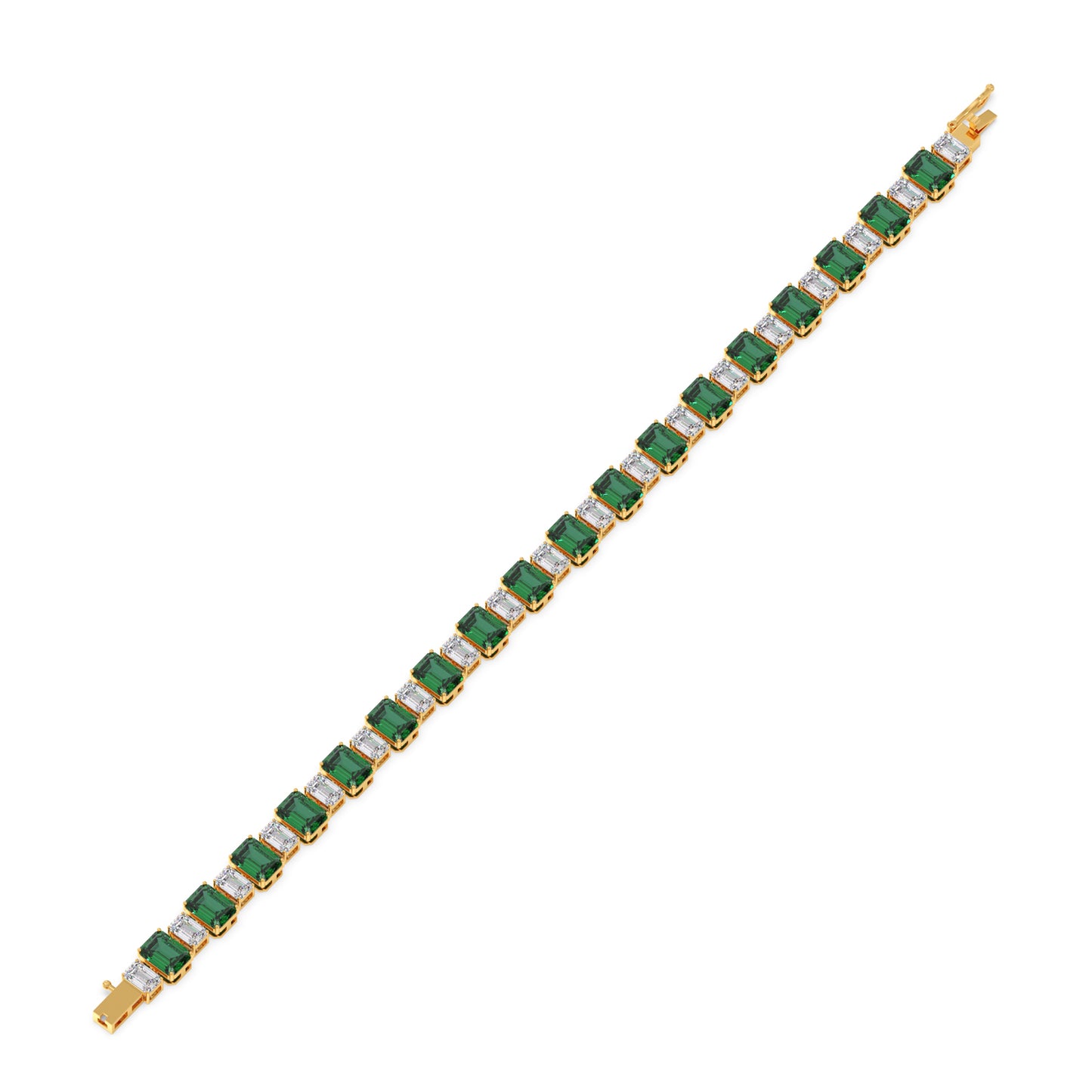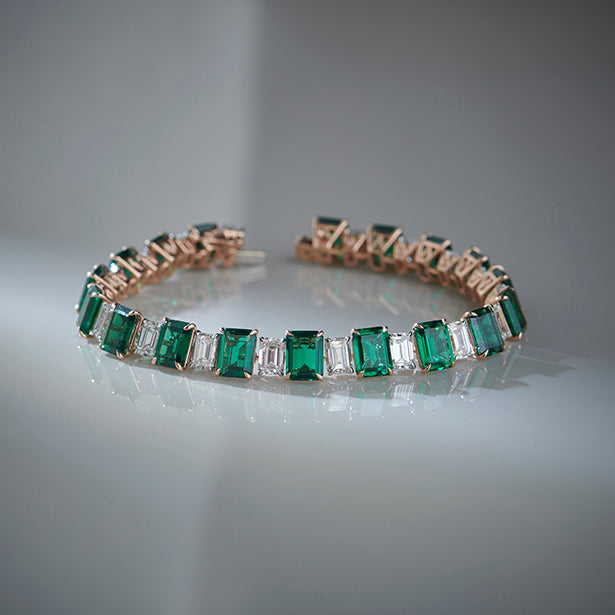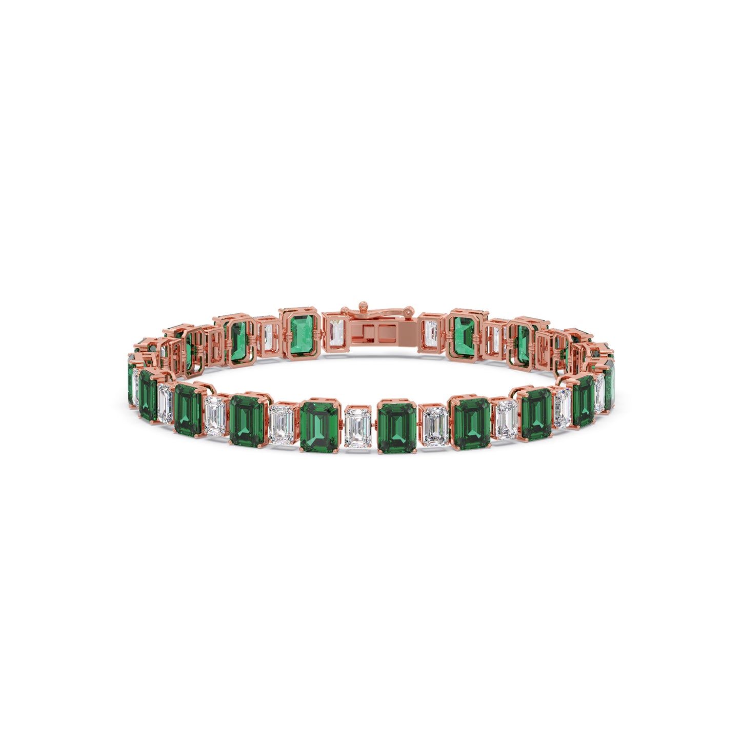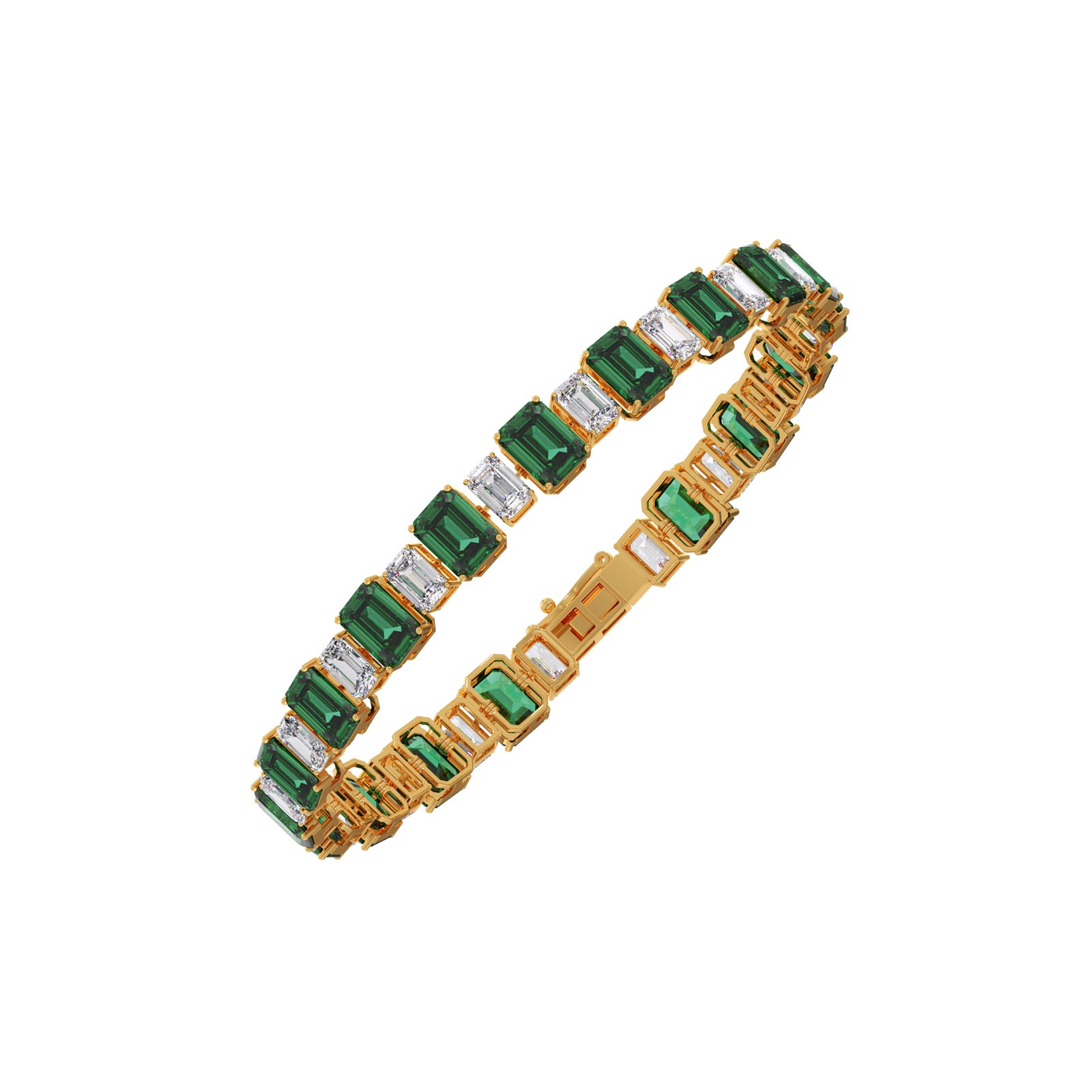 Elegant circular bracelet showcasing 19 Emerald-cut Diamonds of 13.3 ct and 18 Vibrant Green Gemstones of 35.35 ct. The refined design harmoniously blends sparkle with rich green hues for a timeless, sophisticated statement piece.