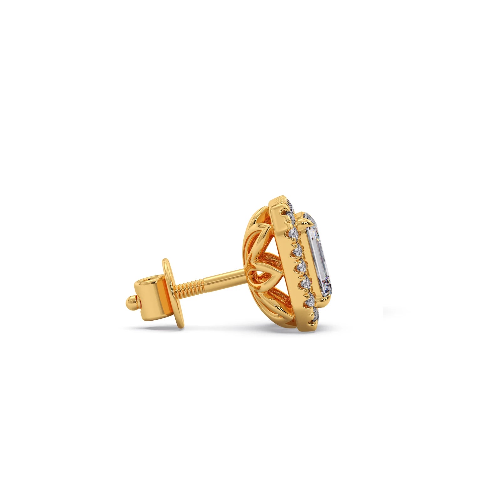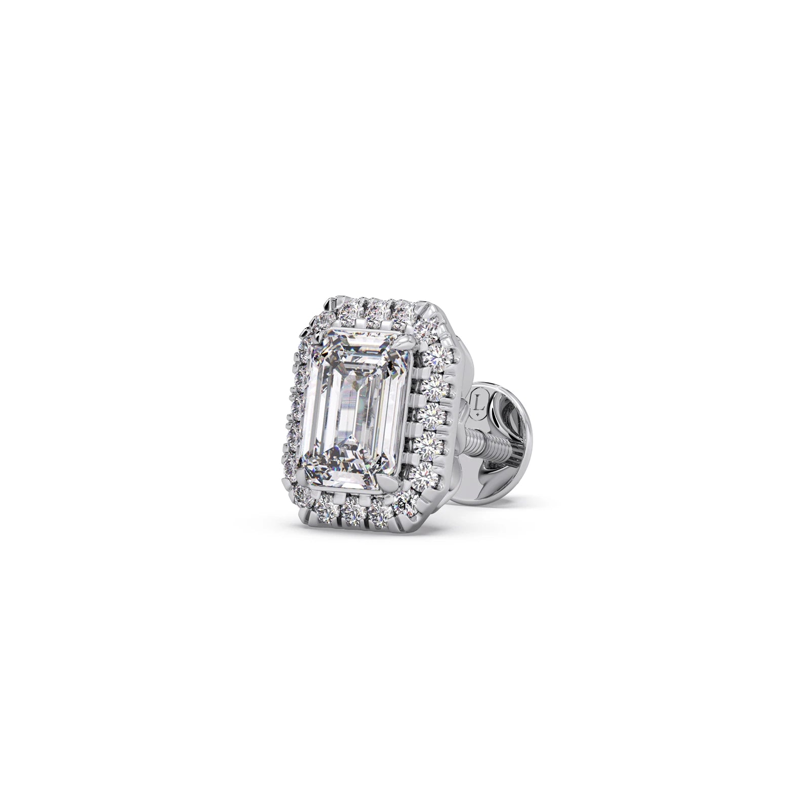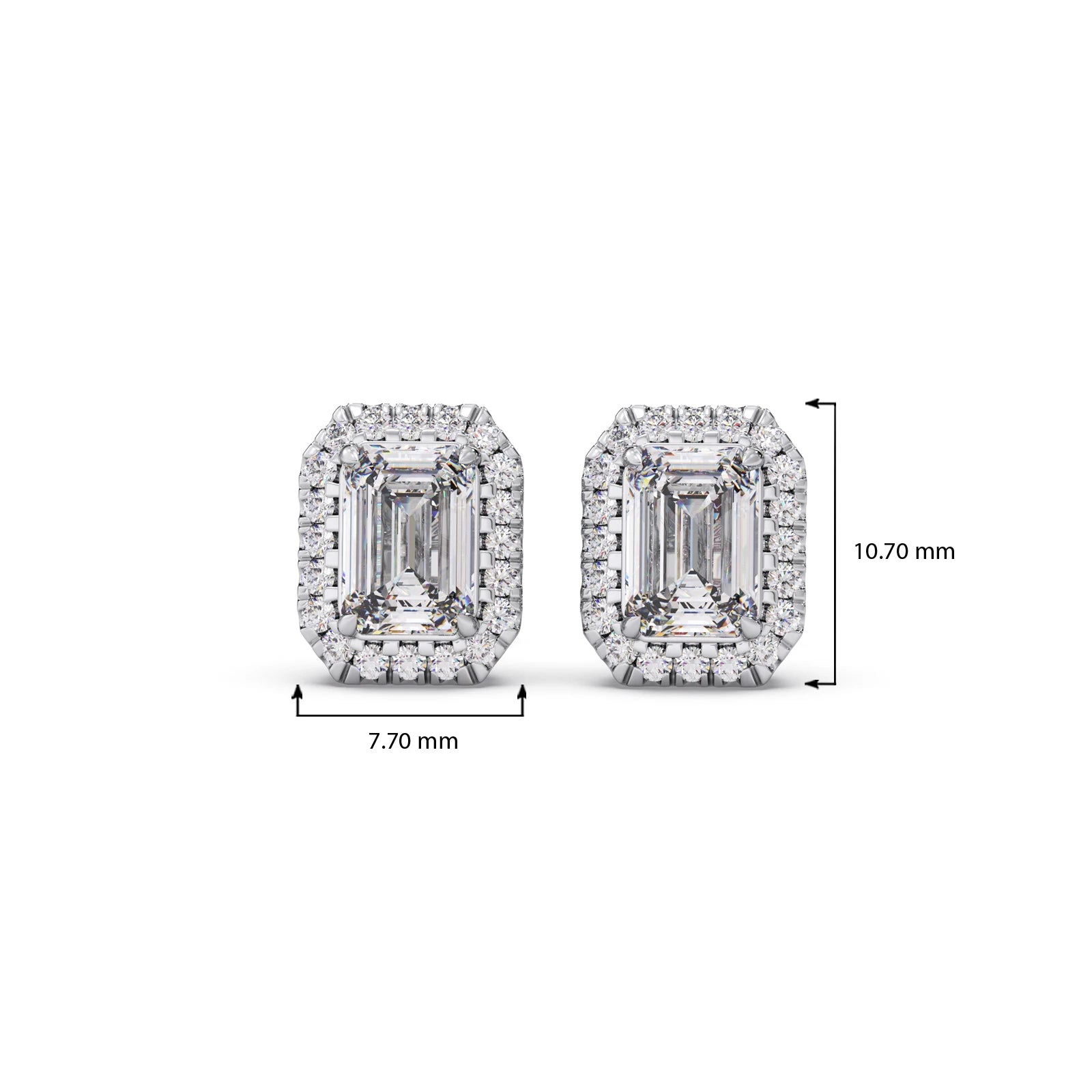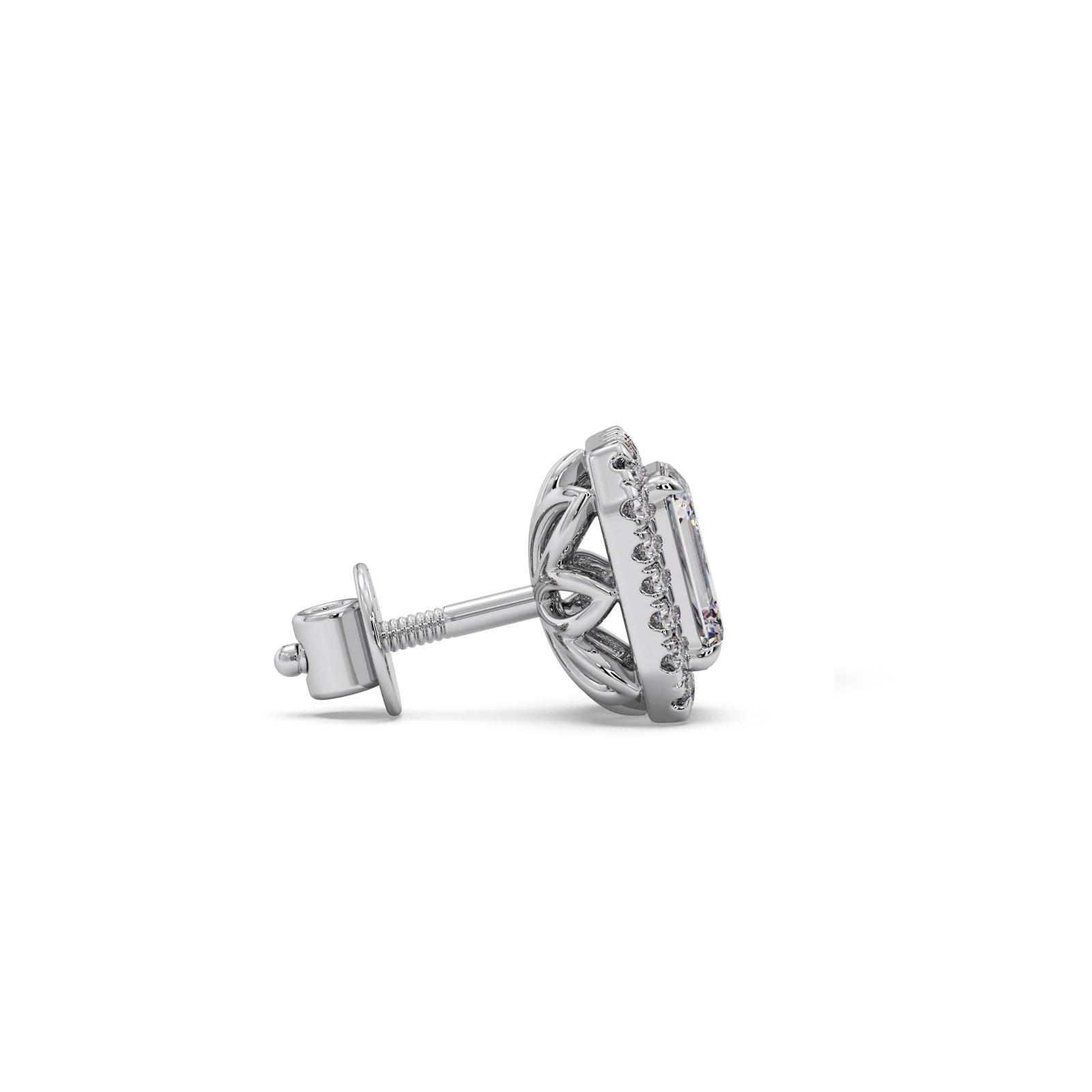 Each of these elegant stud earrings showcases a captivating emerald-cut diamond as its center, renowned for its sophisticated step-cut facets and understated brilliance. Encircling the central stone is a delicate halo of smaller, sparkling diamonds, adding a touch of enhanced radiance and classic appeal. Set in precious metal, these timeless earrings offer a refined and versatile style, perfect for adding a touch of subtle luxury to any occasion. Their secure setting ensures comfortable wear, making them a cherished addition to any jewelry collection.
