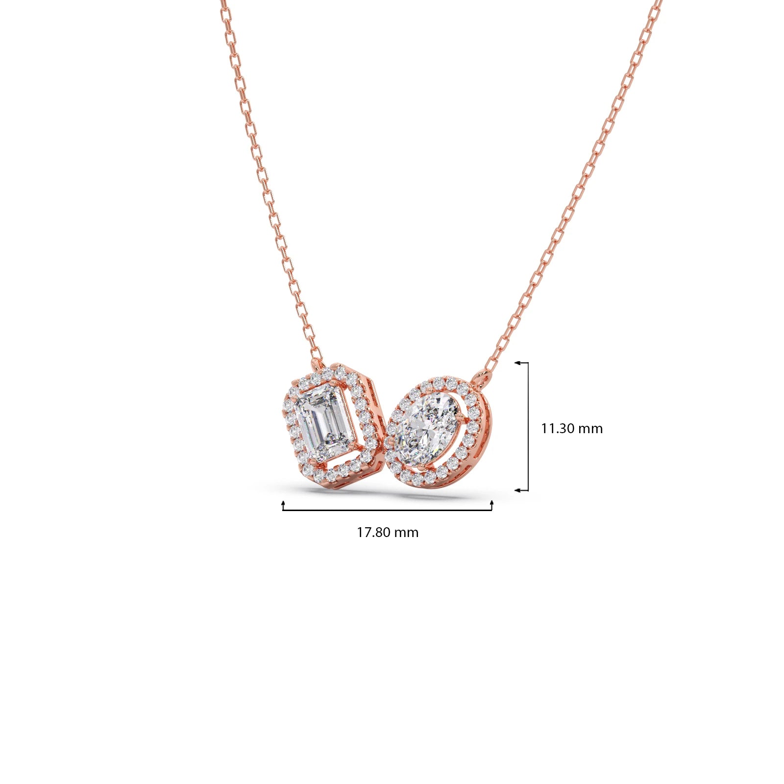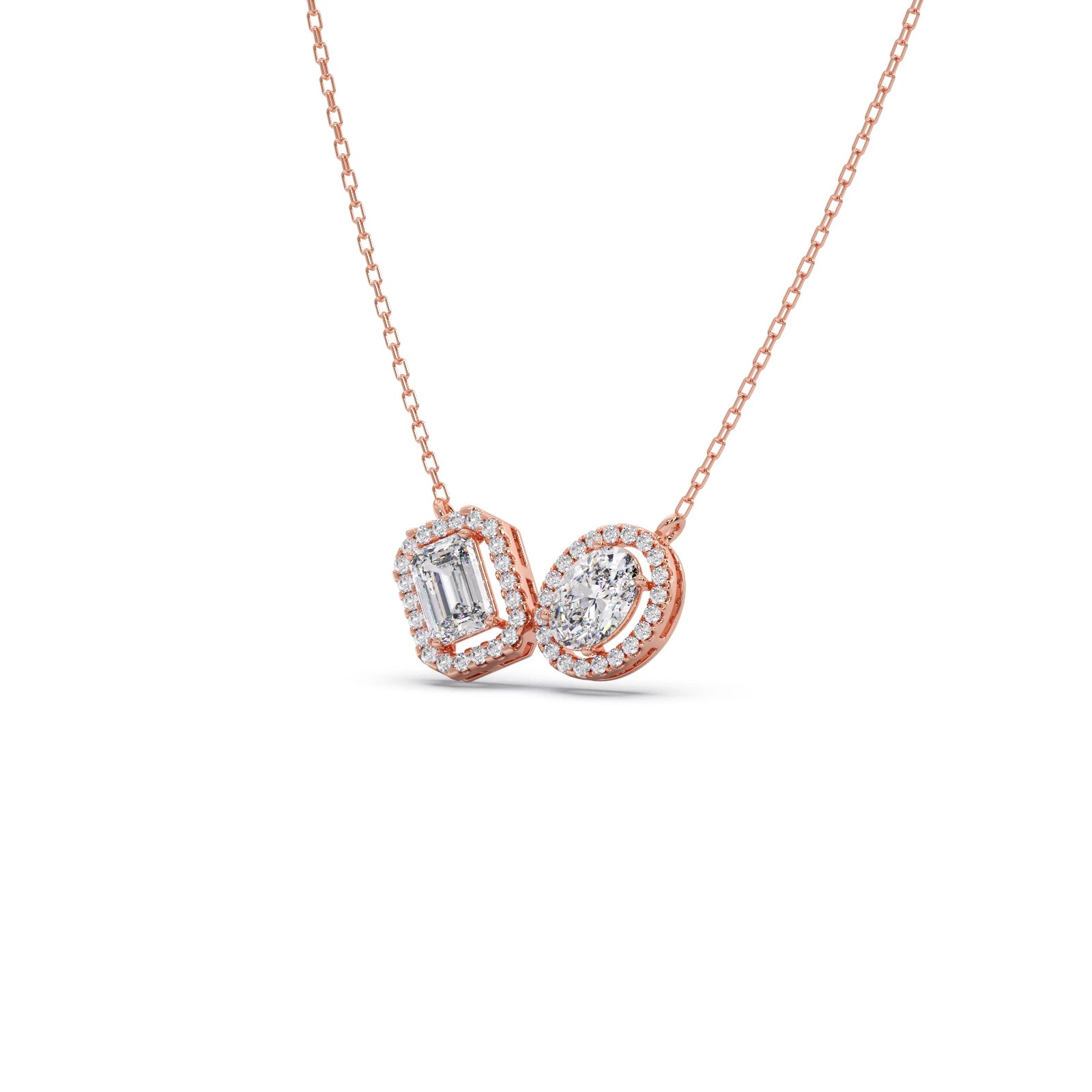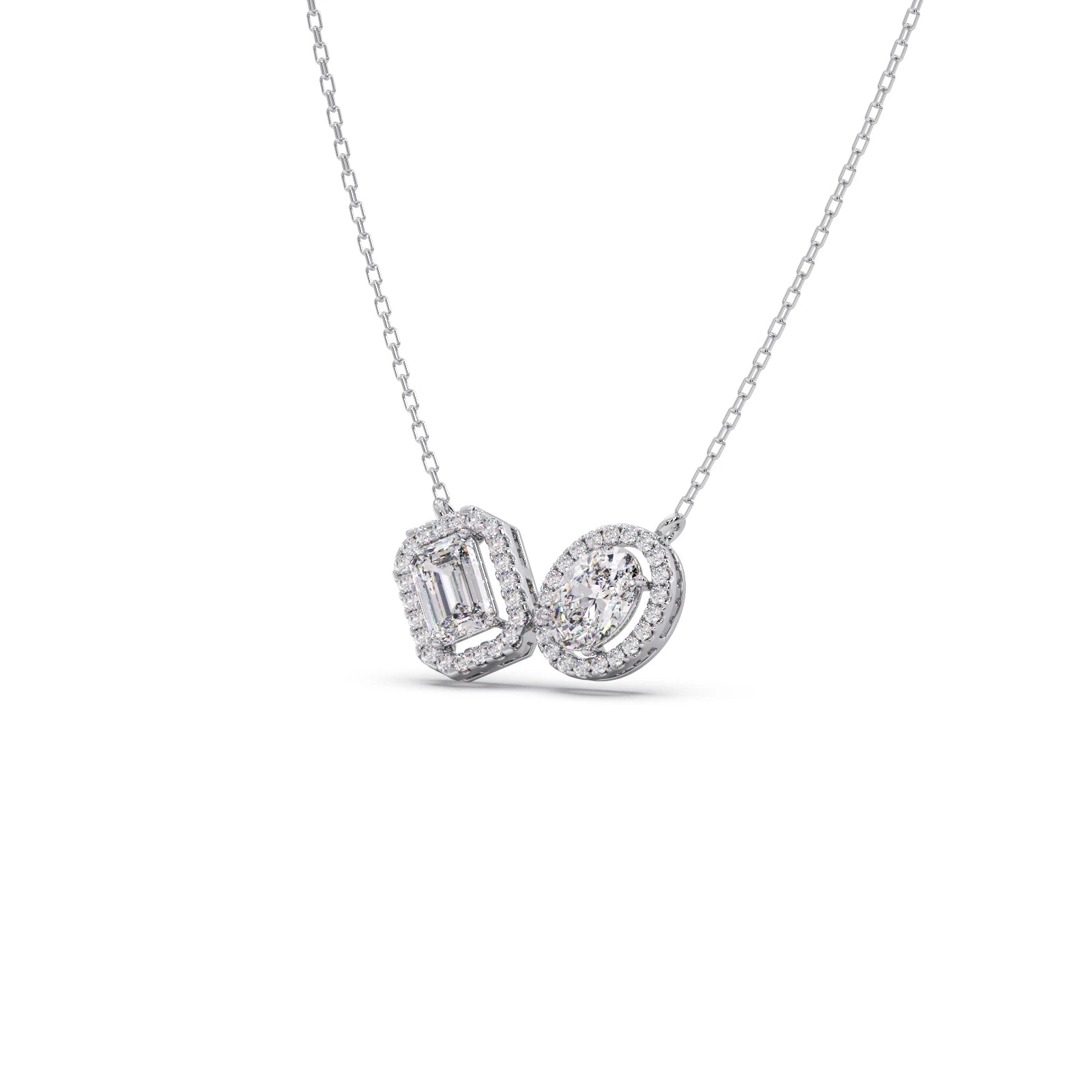 This necklace showcases a unique design with two distinct diamond pendants. One features an emerald-cut diamond framed by a halo of smaller diamonds, while the other boasts an oval-cut diamond, also surrounded by a halo. Both pendants, set in a gold-toned setting, are linked together, creating a striking and elegant piece.
