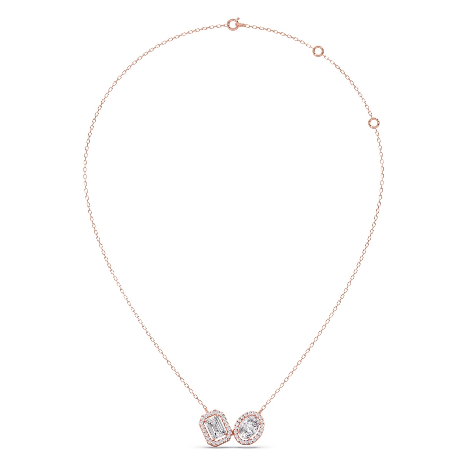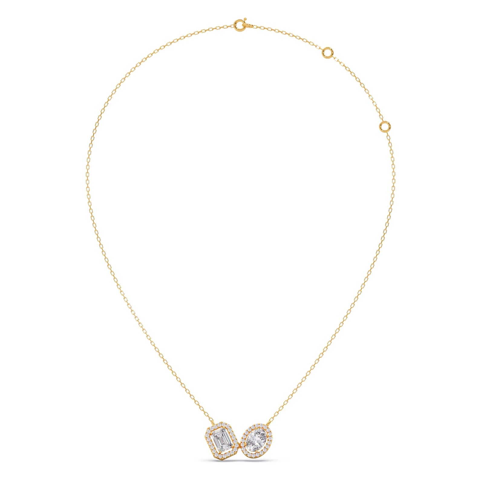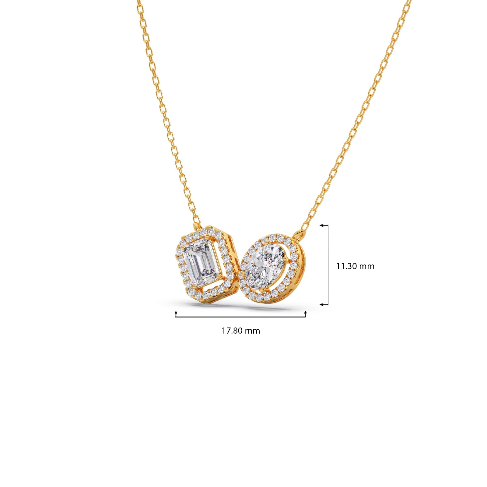 This necklace showcases a unique design with two distinct diamond pendants. One features an emerald-cut diamond framed by a halo of smaller diamonds, while the other boasts an oval-cut diamond, also surrounded by a halo. Both pendants, set in a gold-toned setting, are linked together, creating a striking and elegant piece.