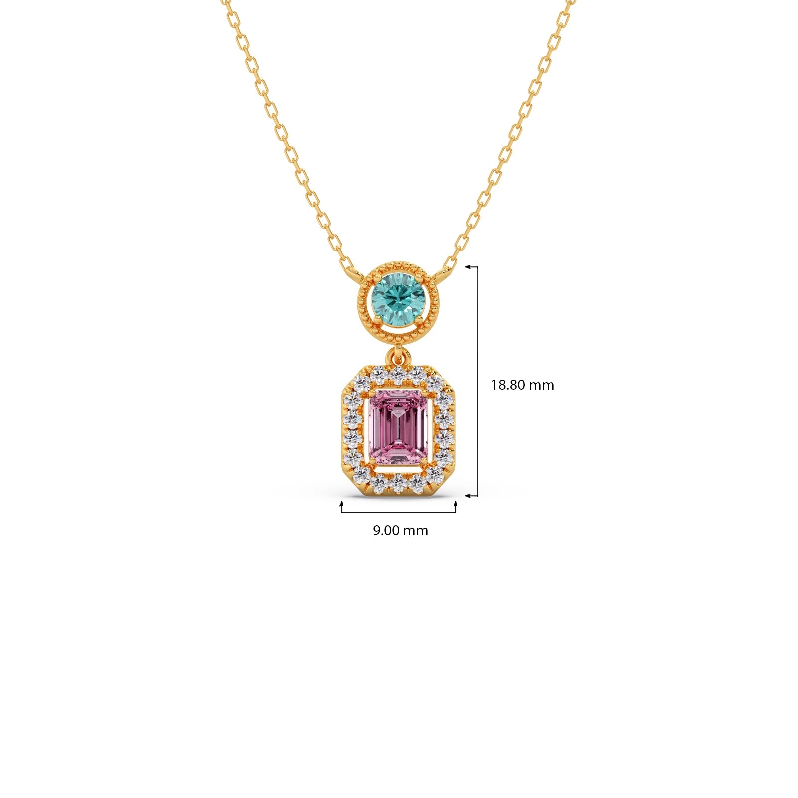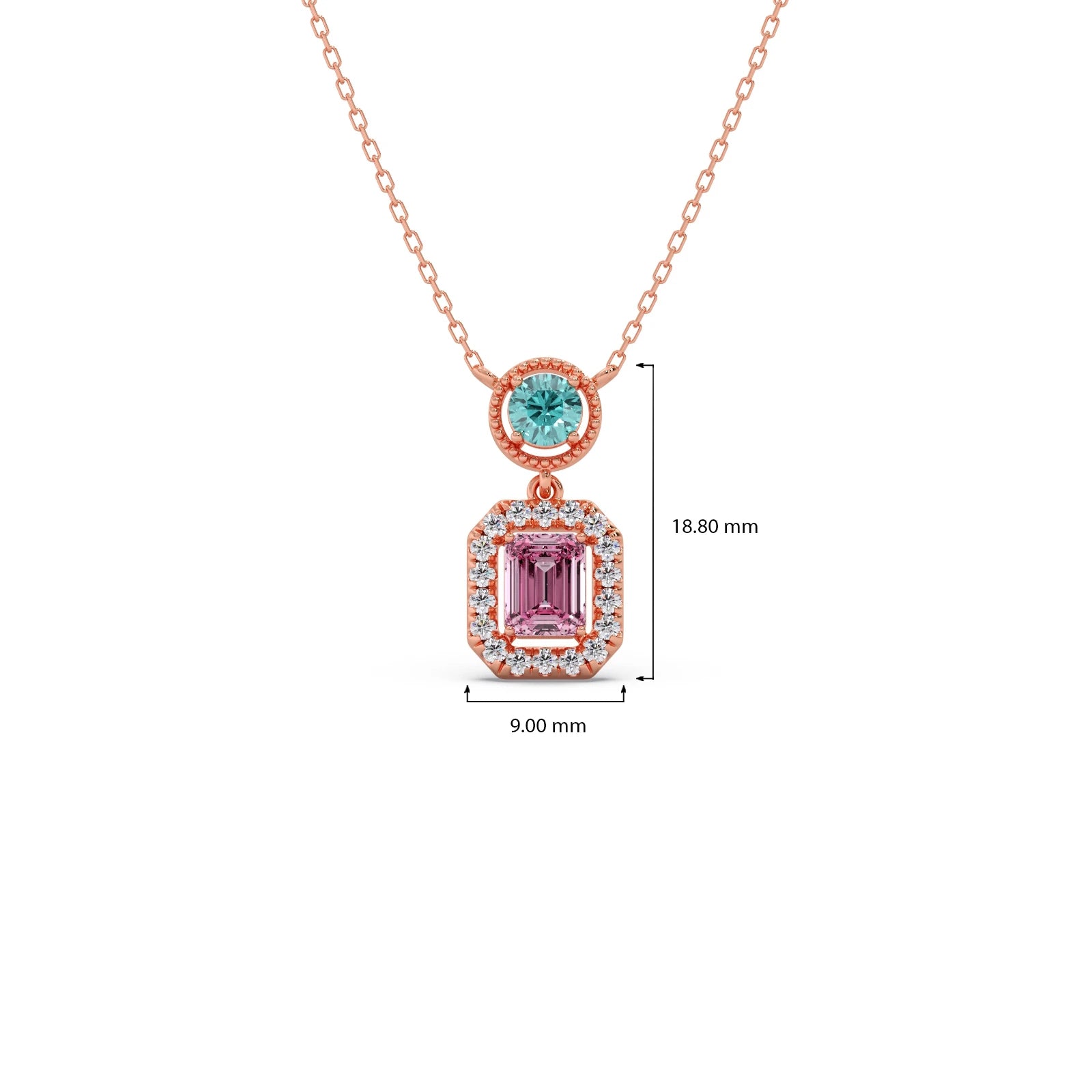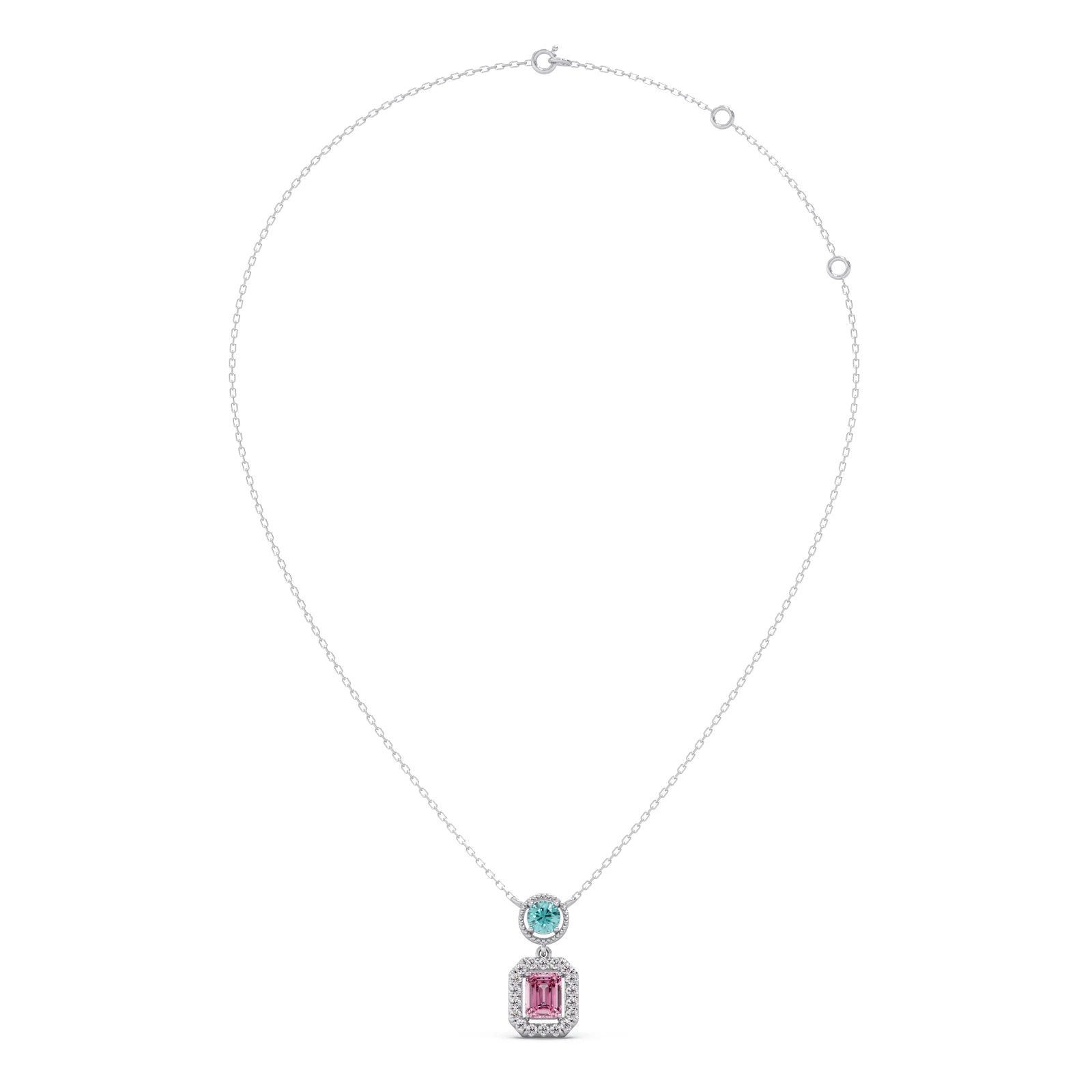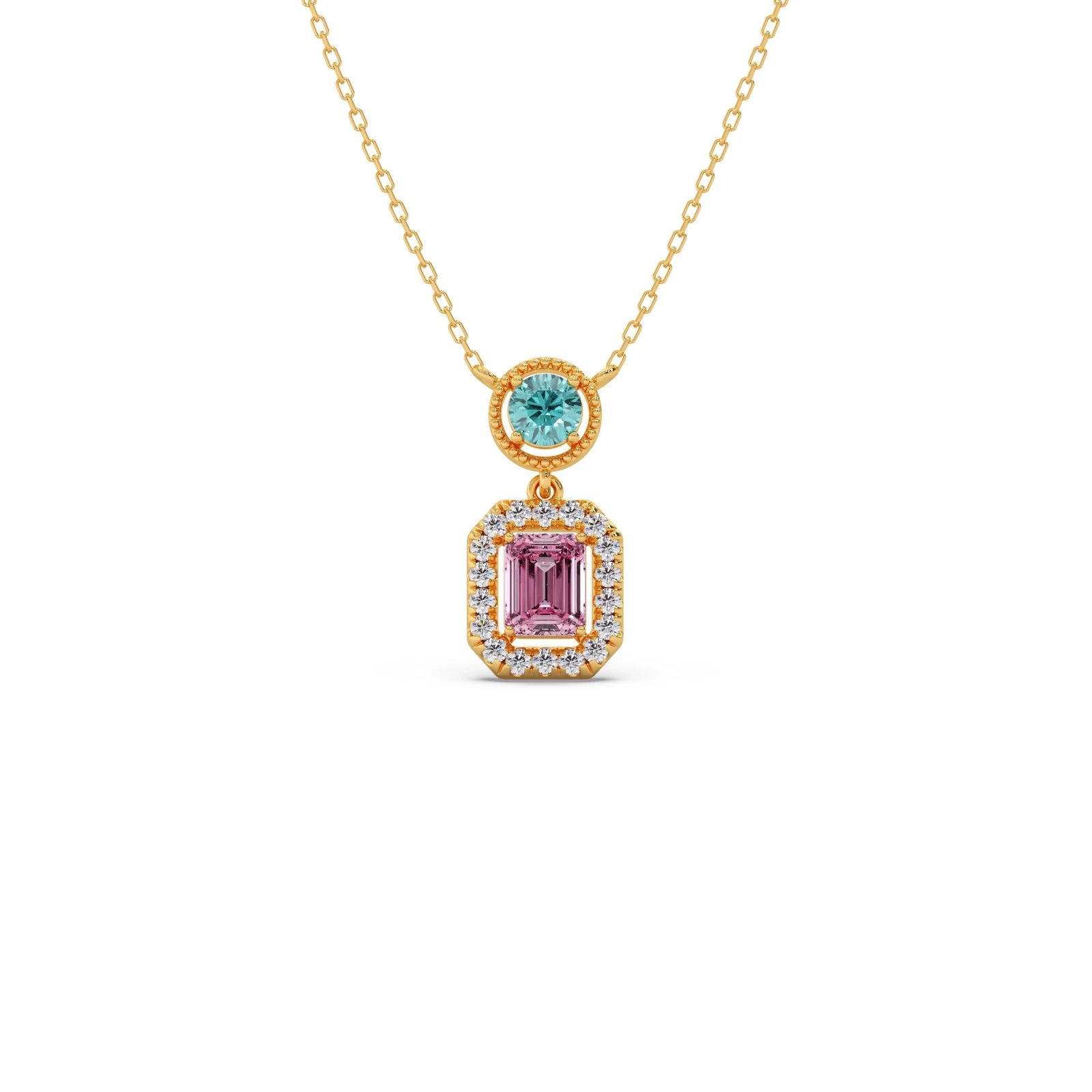 This stunning pendant showcases the sophisticated contrast of an emerald-cut gemstone paired with a brilliant round gemstone, both encircled by a dazzling halo of round diamonds. The sparkling diamonds beautifully enhance the central gems, creating exceptional brilliance and a luxurious appeal. A truly captivating statement piece.