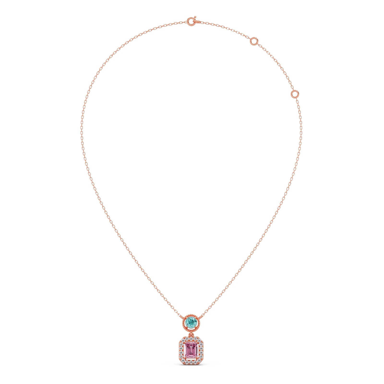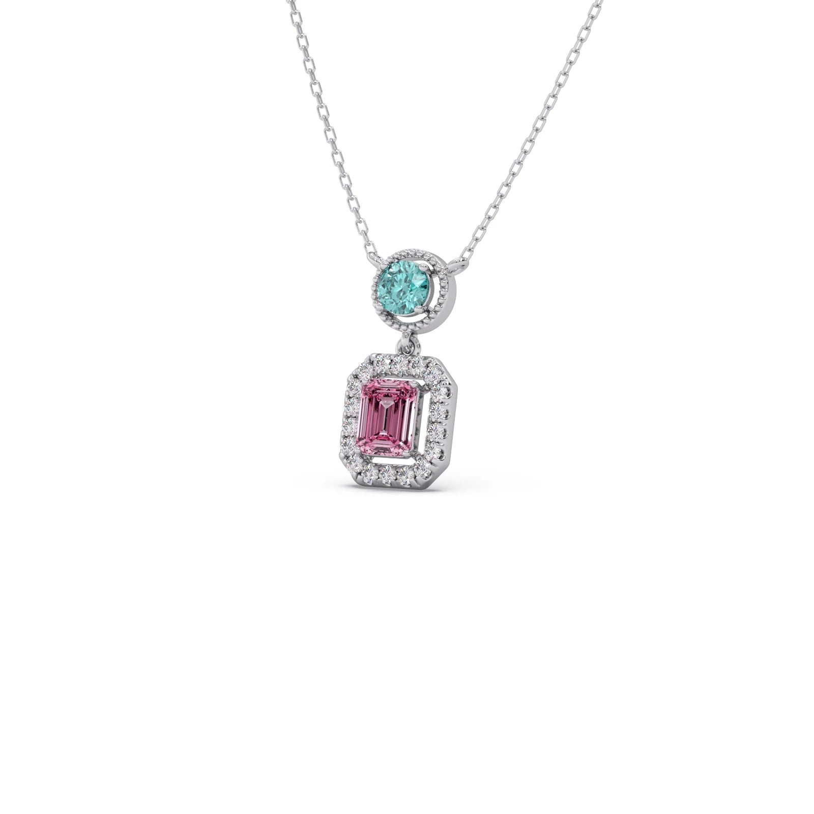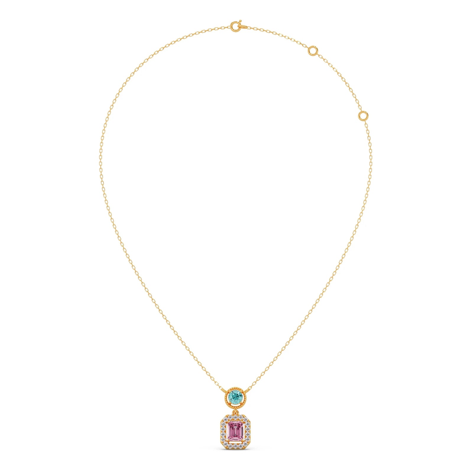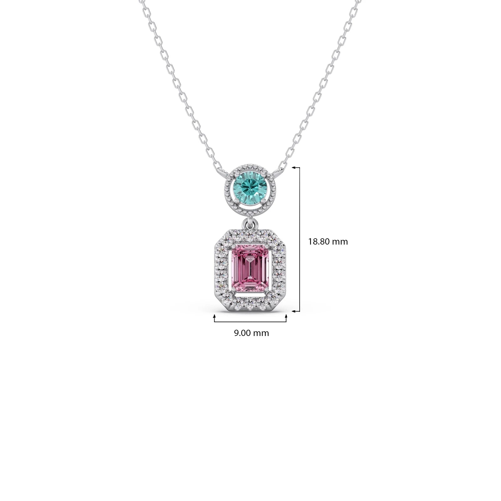 This stunning pendant showcases the sophisticated contrast of an emerald-cut gemstone paired with a brilliant round gemstone, both encircled by a dazzling halo of round diamonds. The sparkling diamonds beautifully enhance the central gems, creating exceptional brilliance and a luxurious appeal. A truly captivating statement piece.