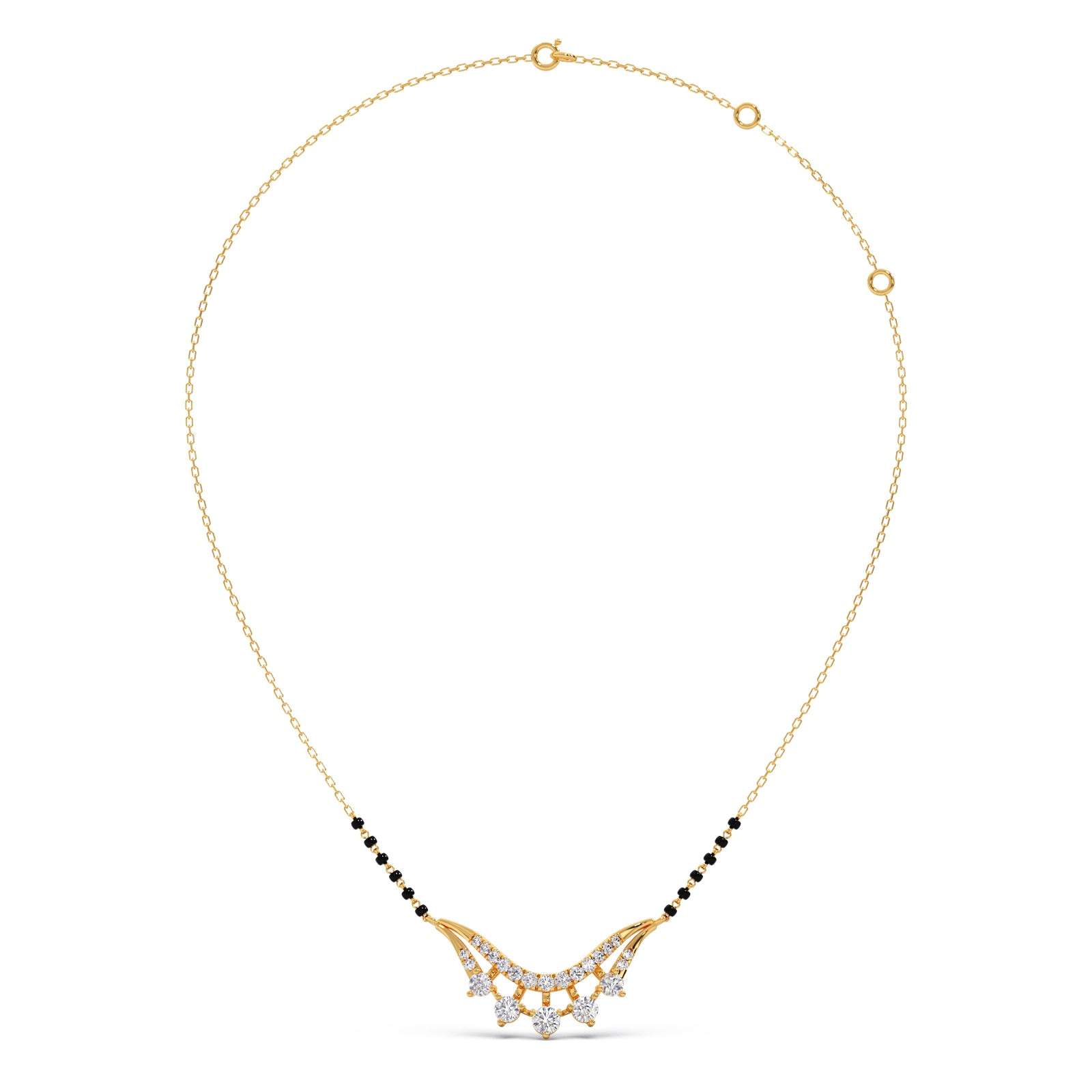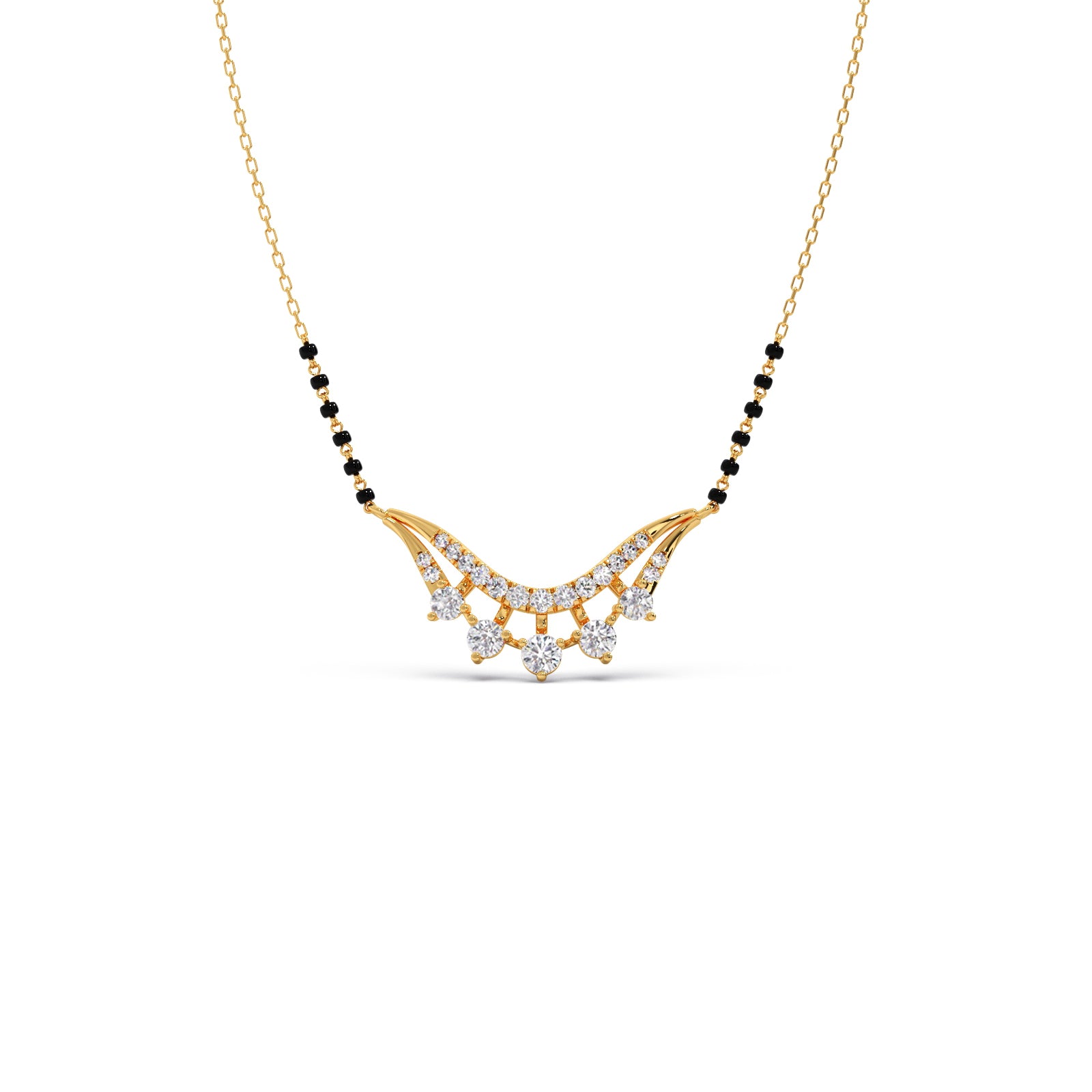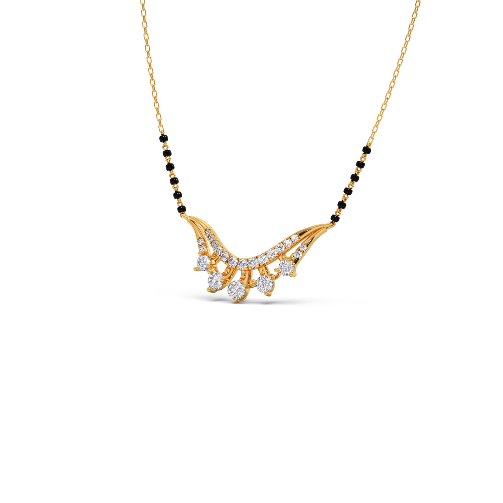 Embrace a love that soars with our "Eternal Embrace" Mangalsutra. Its gracefully curved, diamond-studded design cradles three brilliant solitaires, marrying traditional black beads with a modern, captivating sparkle. This exquisite piece is a radiant symbol of enduring affection, perfect for the contemporary bride who cherishes tradition.
