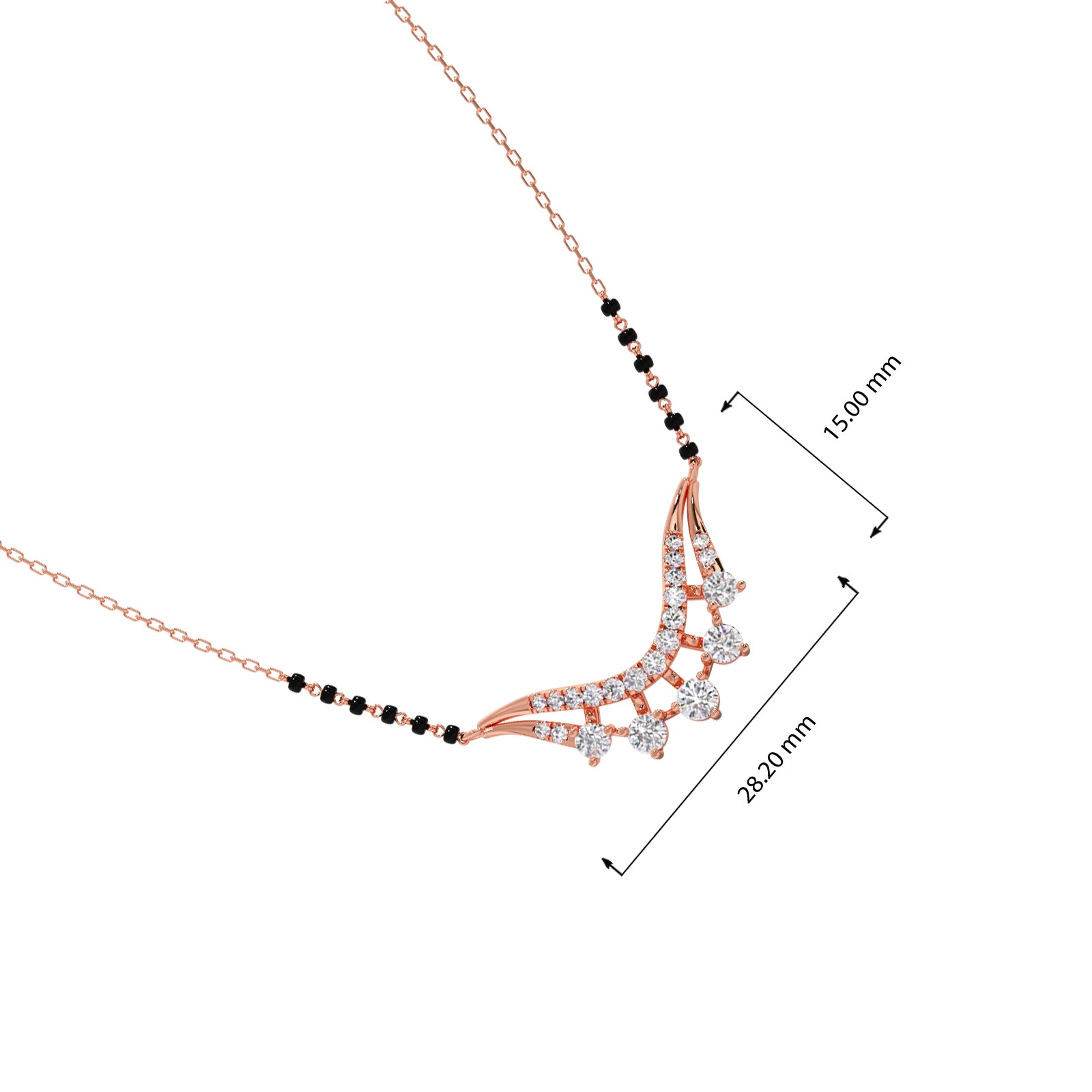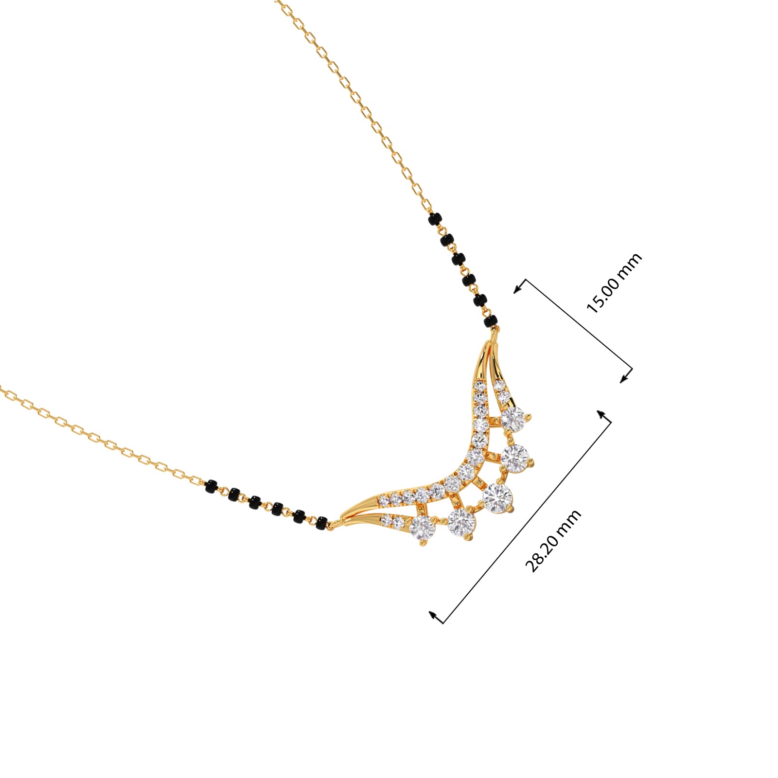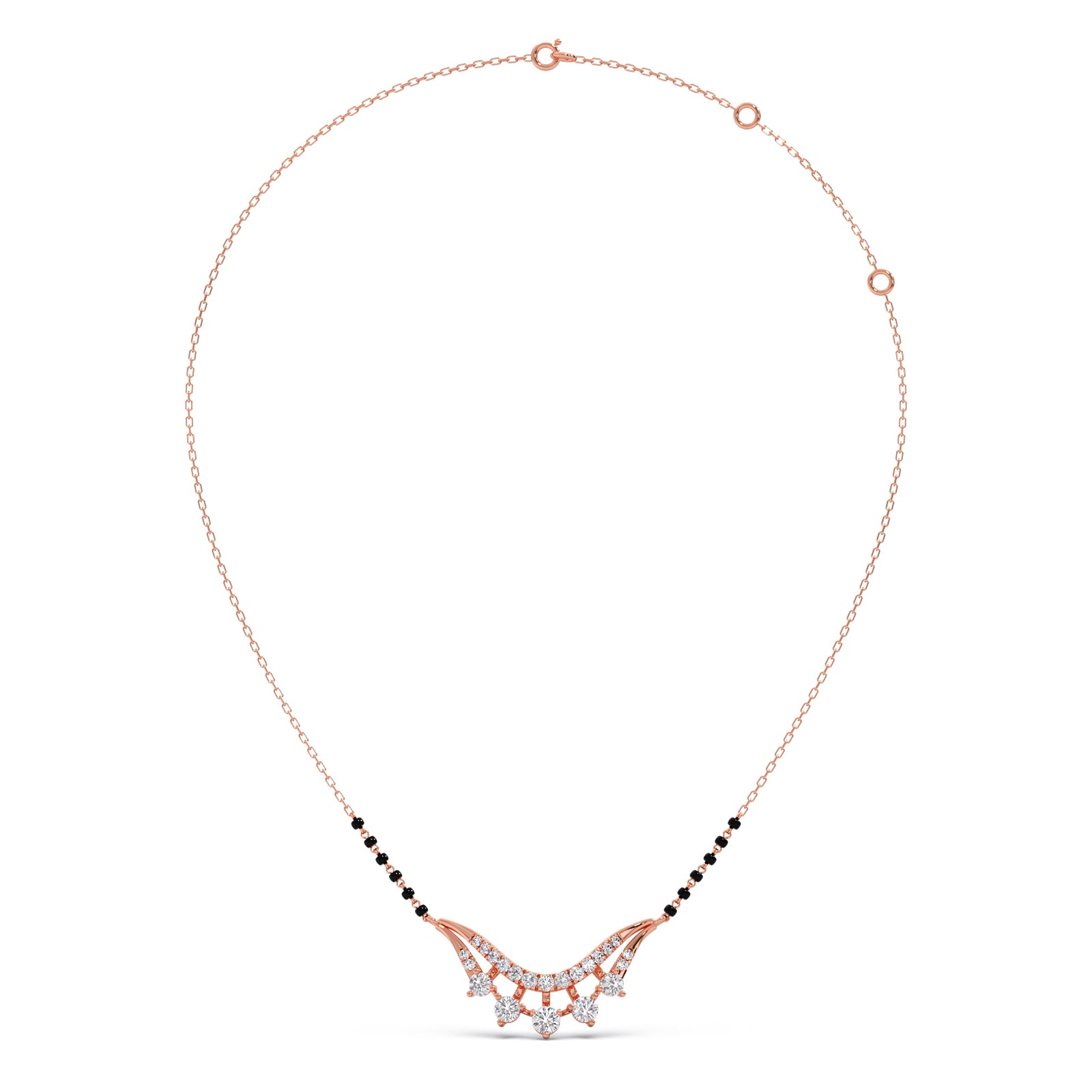 Embrace a love that soars with our "Eternal Embrace" Mangalsutra. Its gracefully curved, diamond-studded design cradles three brilliant solitaires, marrying traditional black beads with a modern, captivating sparkle. This exquisite piece is a radiant symbol of enduring affection, perfect for the contemporary bride who cherishes tradition.