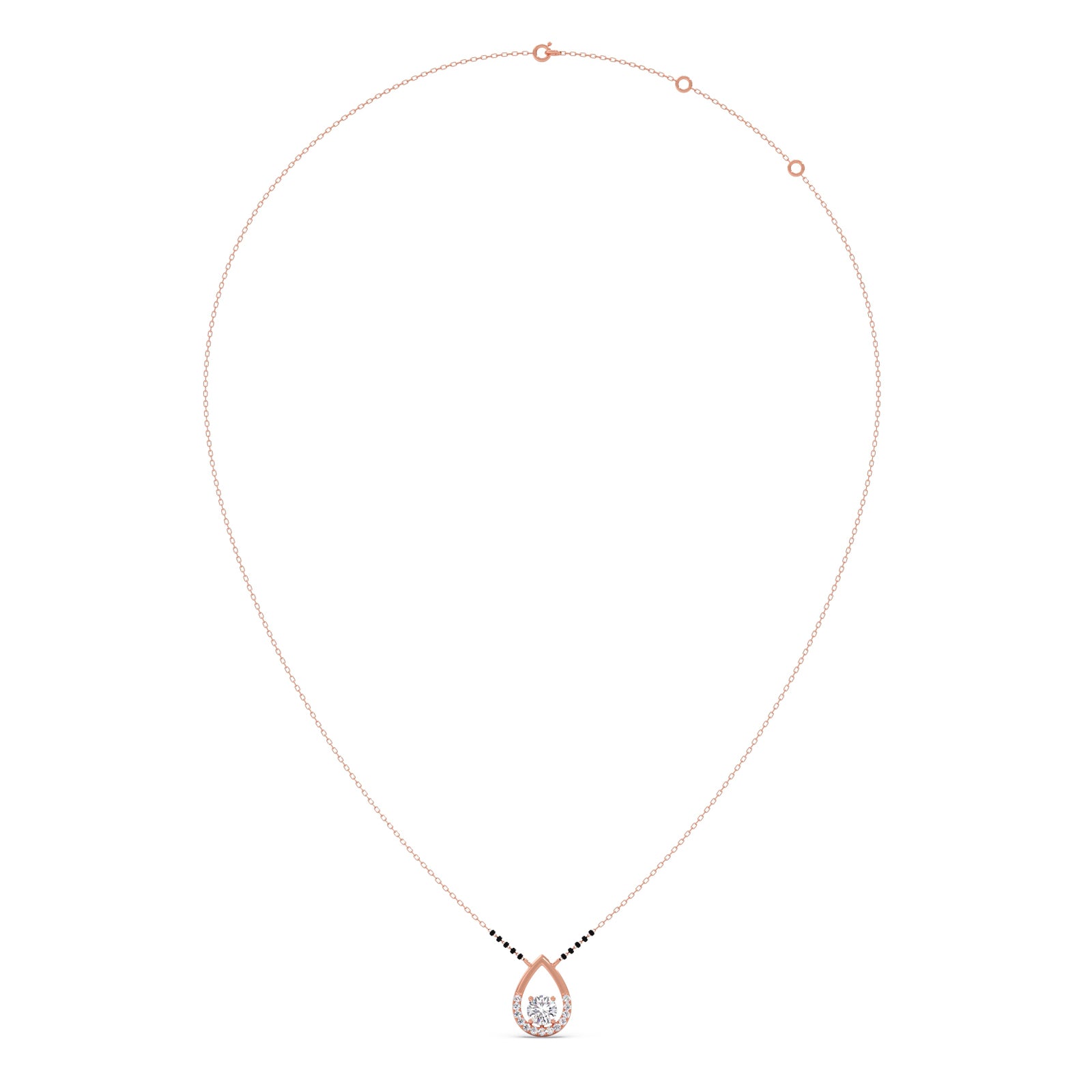 Effortlessly elegant, this Floating Diamond Teardrop Mangalsutra is a symphony of light and grace. A solitaire round diamond floats within a polished teardrop frame, surrounded by smaller round diamonds, creating a captivating and modern design. A stunning piece that adds sophisticated sparkle to any neckline.