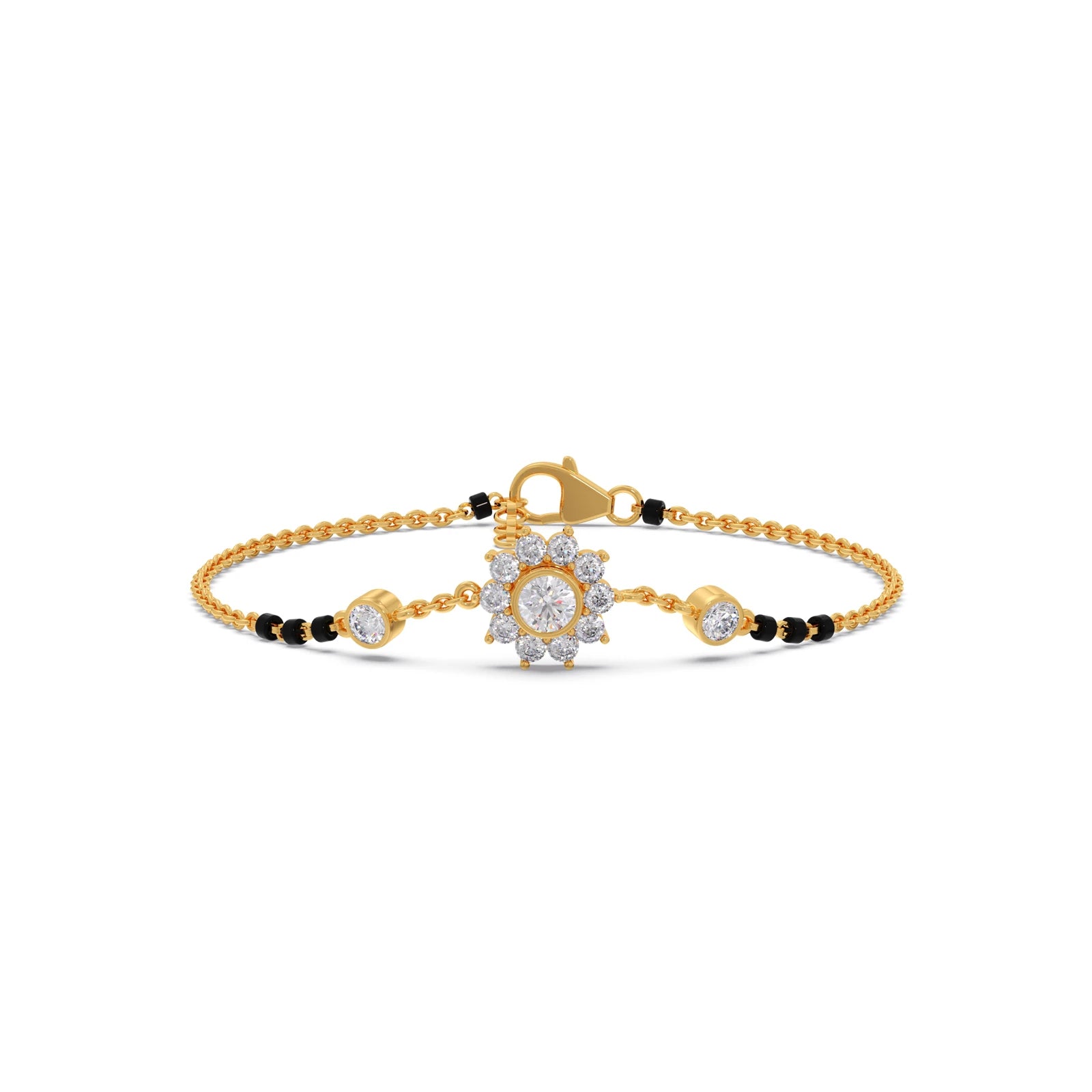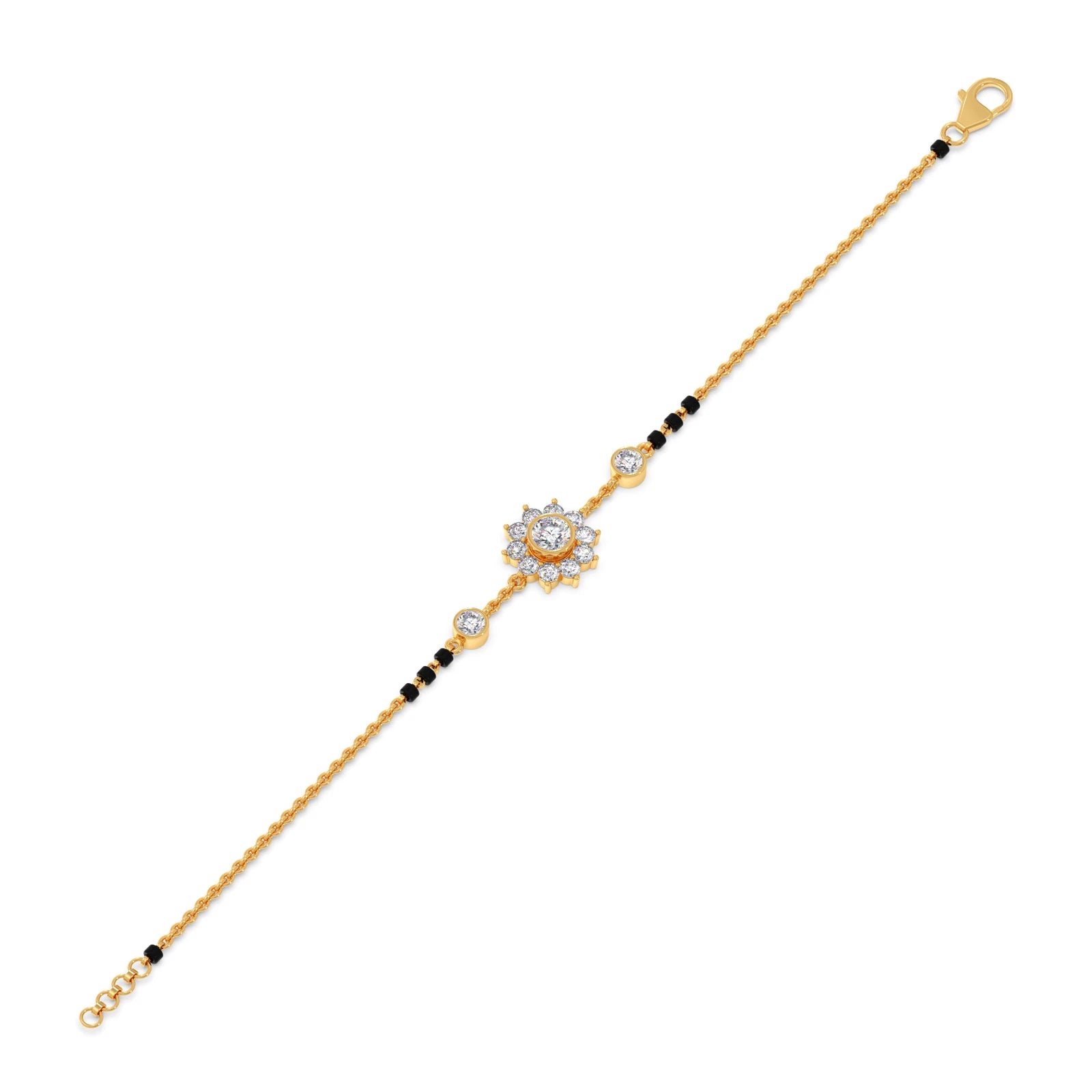 Embrace tradition with a modern twist. This exquisite floral diamond mangalsutra bracelet beautifully blends cultural significance with contemporary elegance. Delicate diamond-studded floral motifs are interspersed with the traditional black beads, symbolizing love, commitment, and protection in a stylish and wearable design. Perfect for the modern woman.