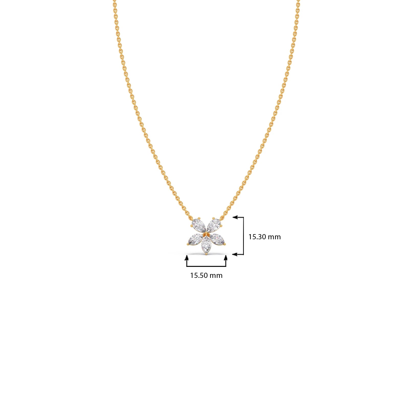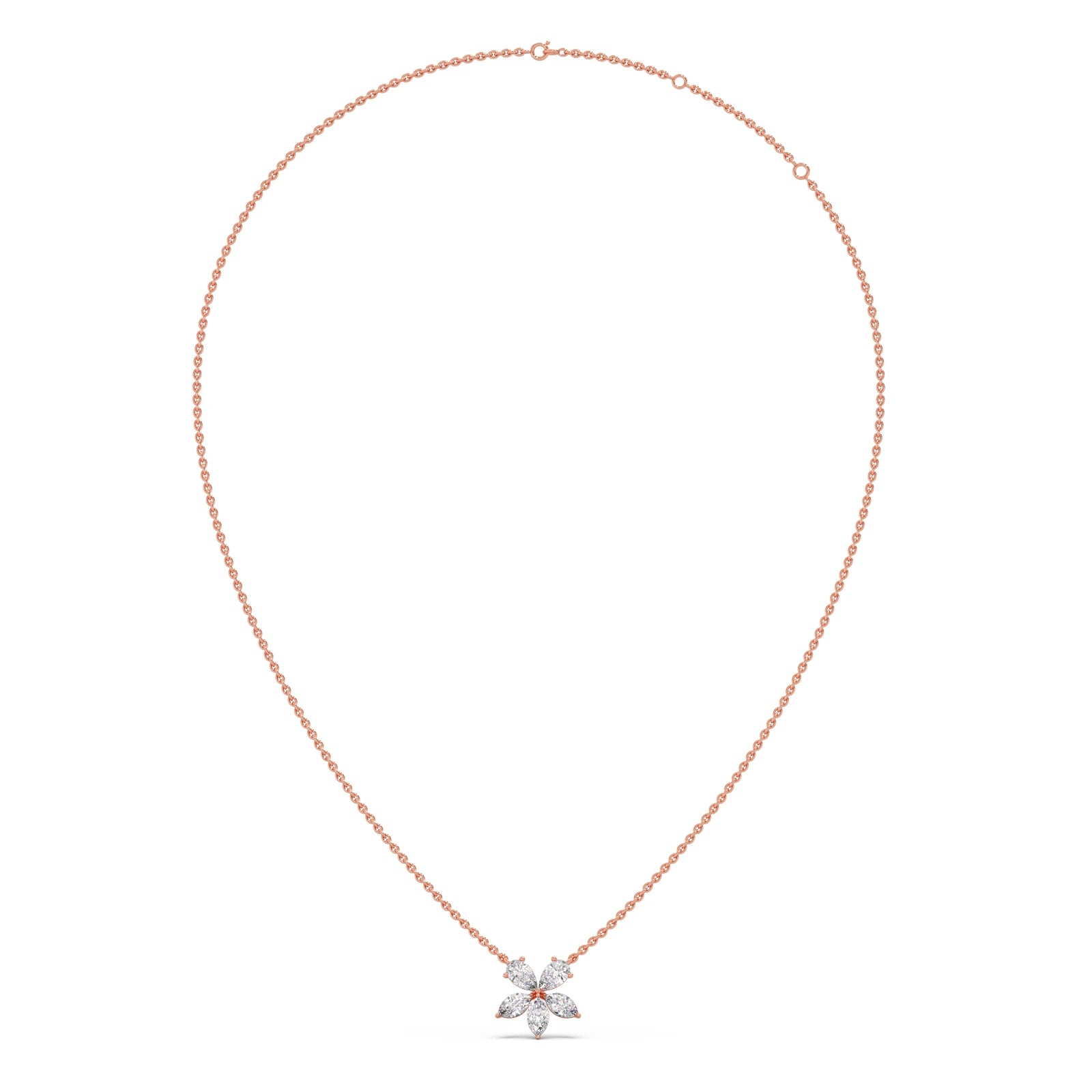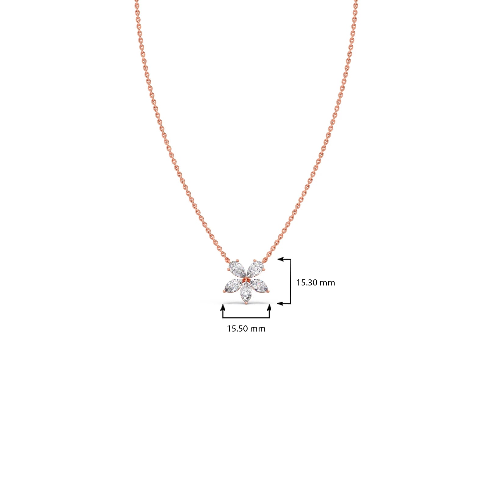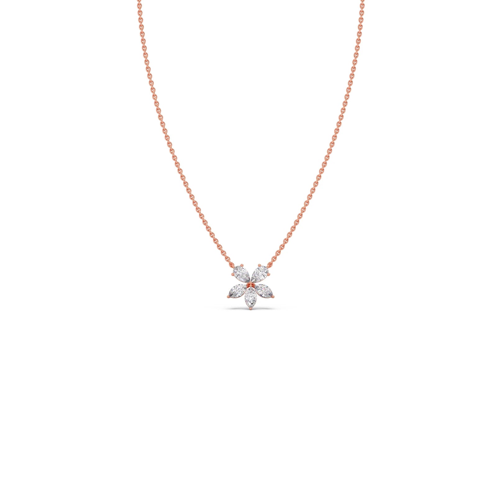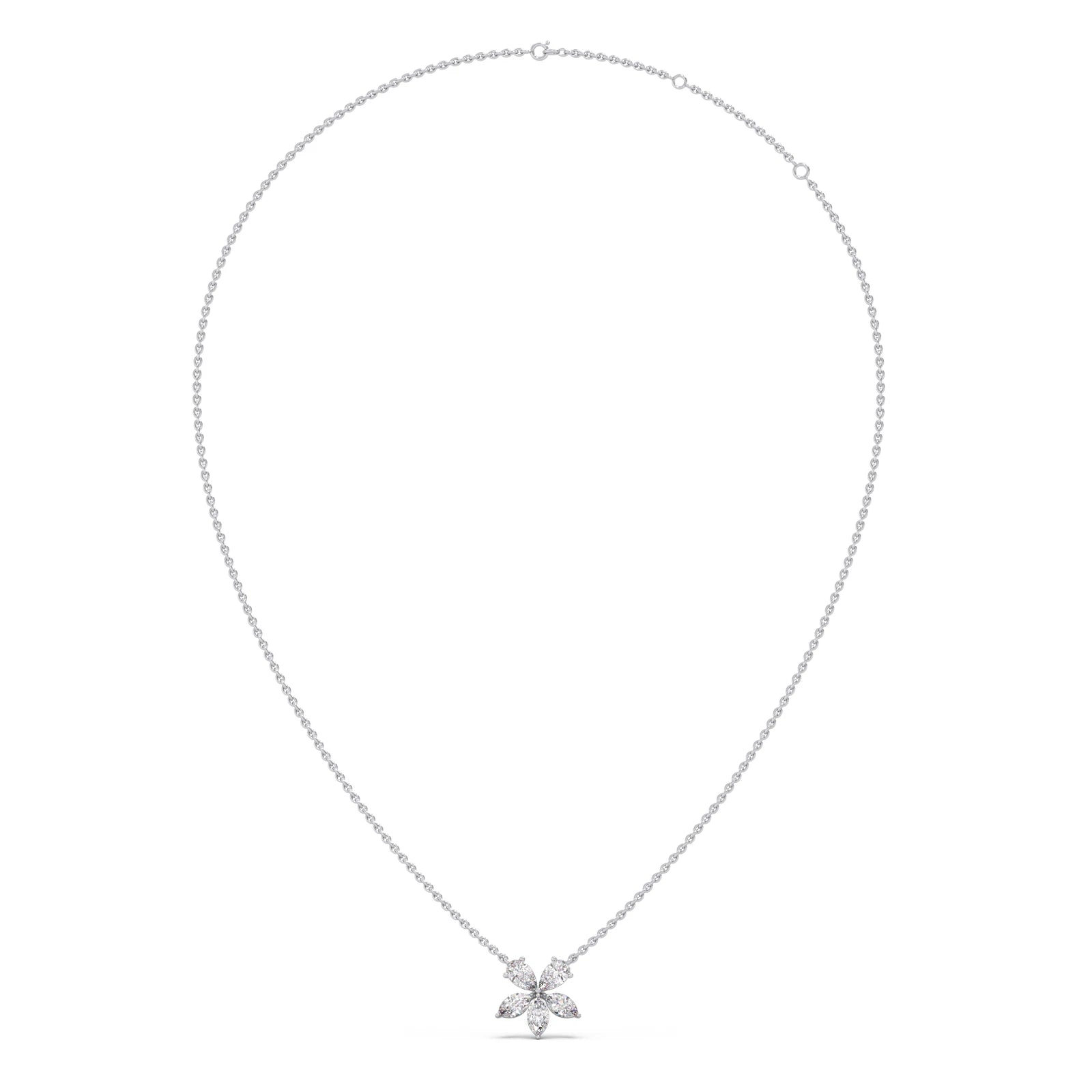 This pendant features a delicate floral design, crafted from five marquise and pear shaped diamonds. The stones are arranged in a symmetrical, petal-like pattern, creating a sparkling flower motif. The pendant offers a feminine and elegant look, perfect for adding a touch of floral brilliance to any outfit.