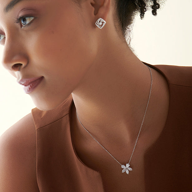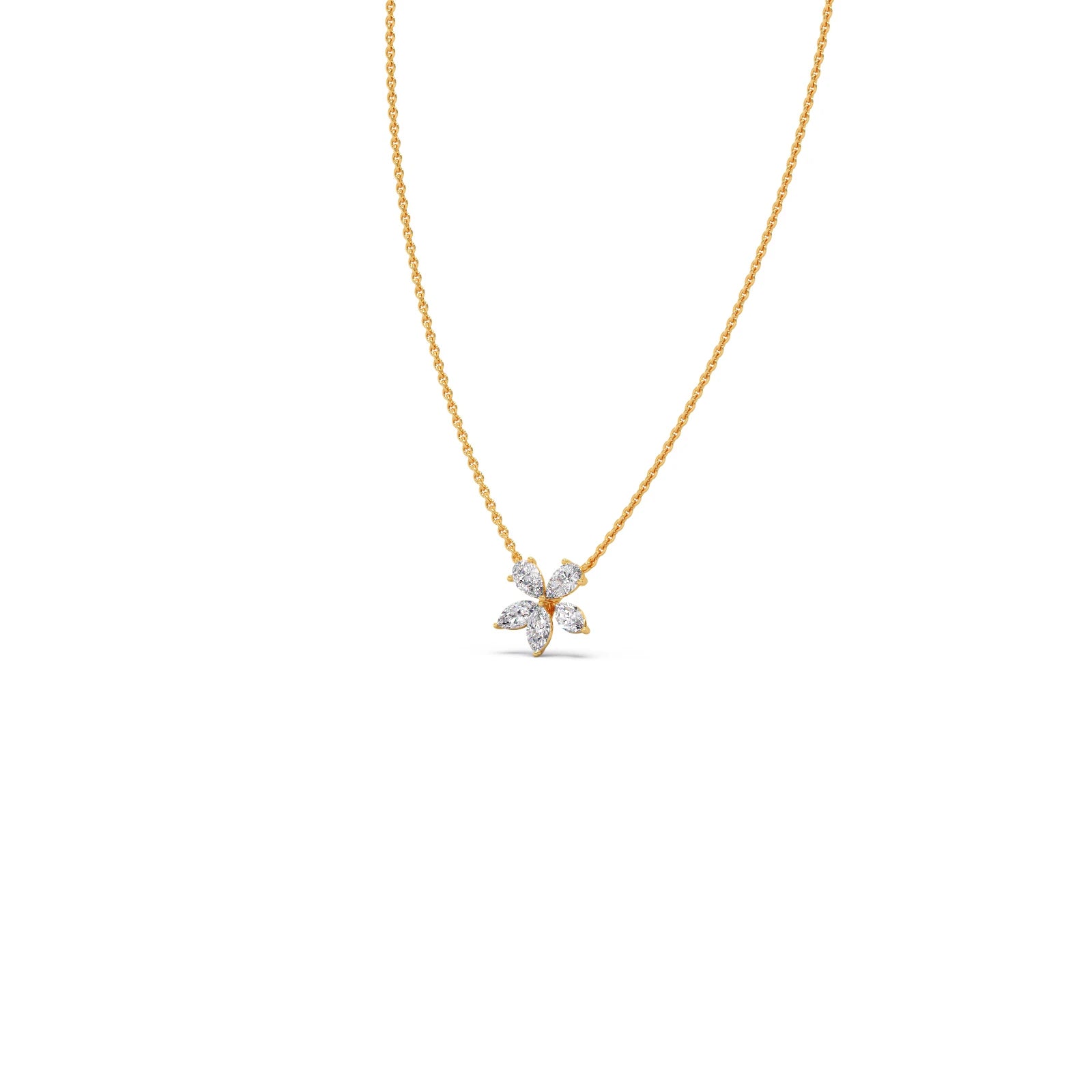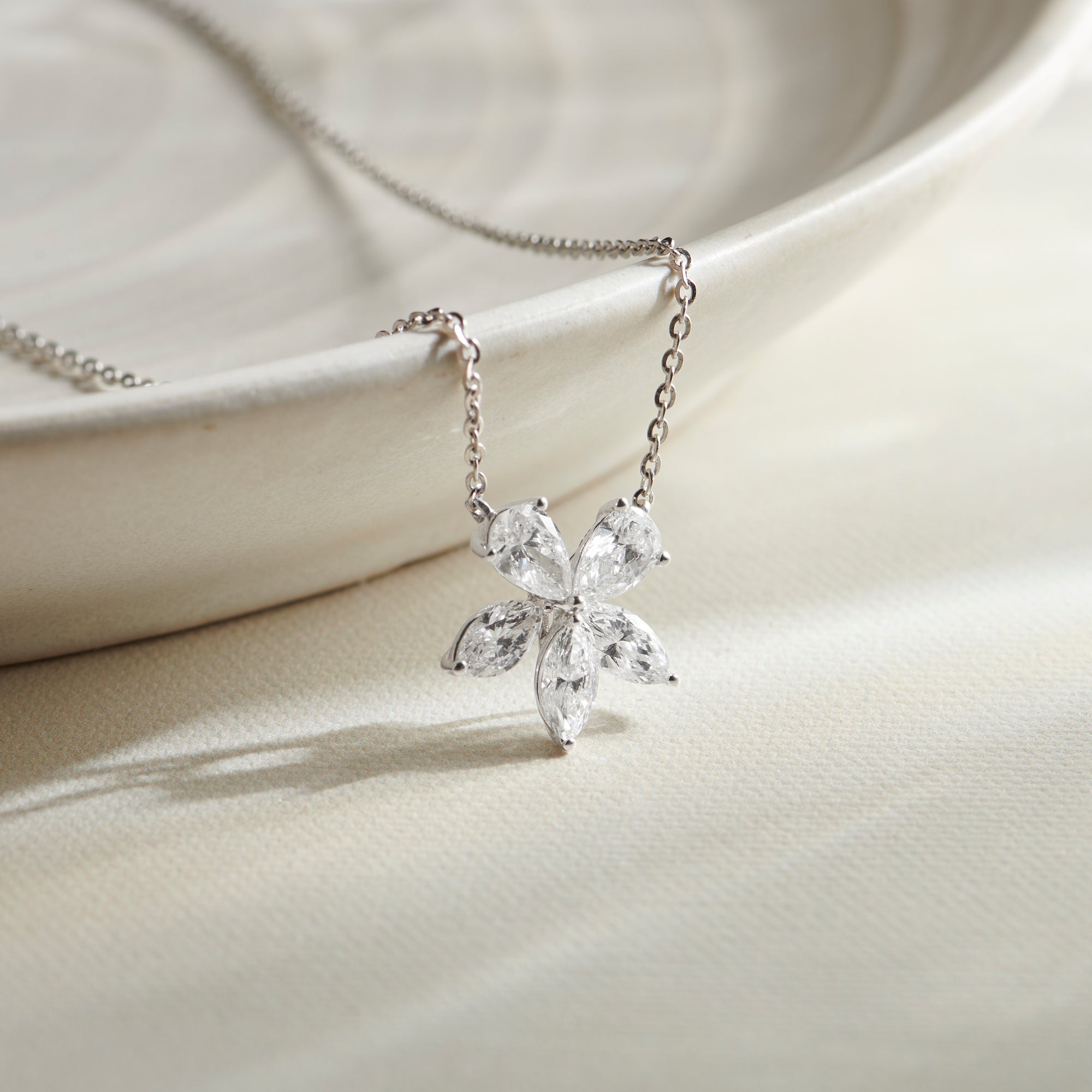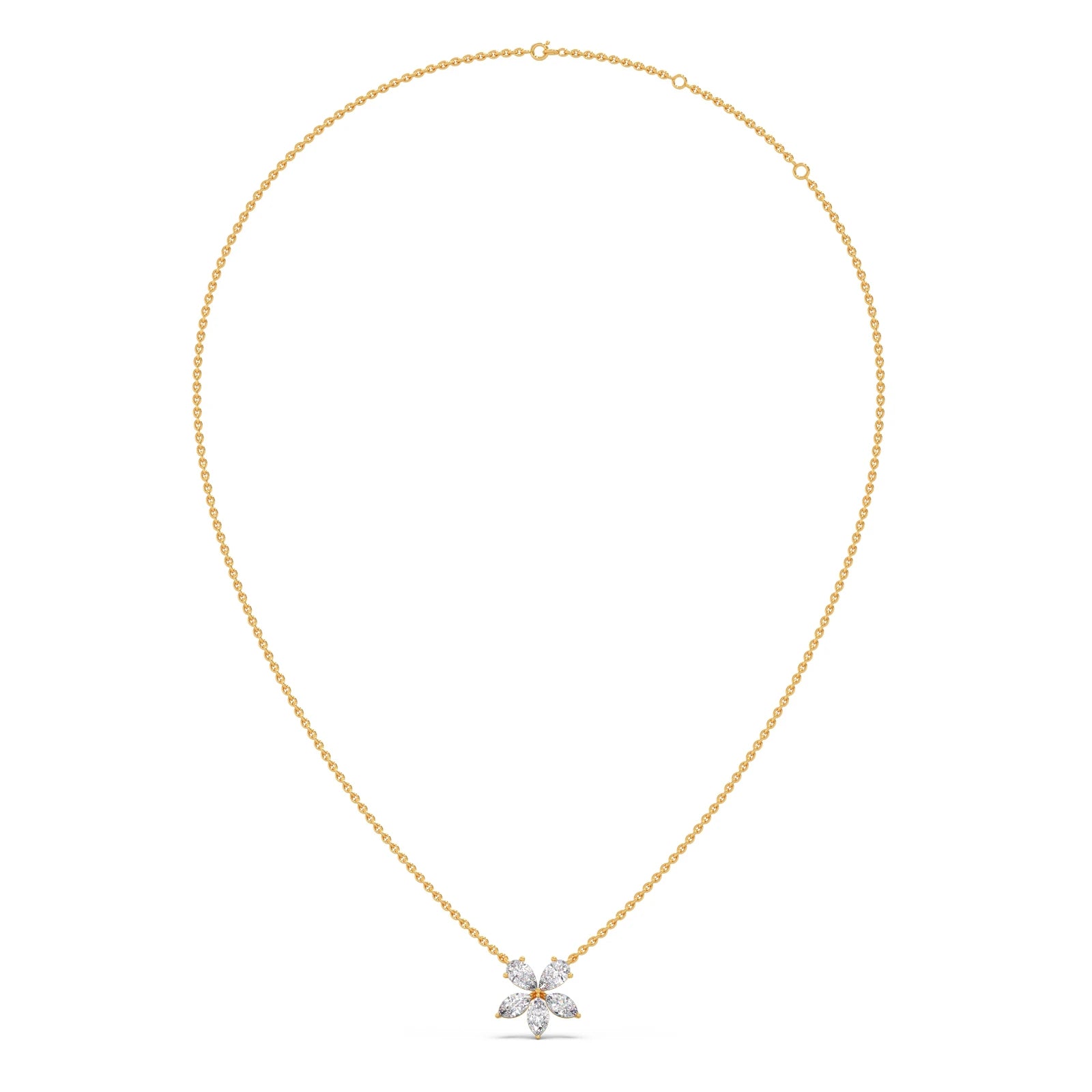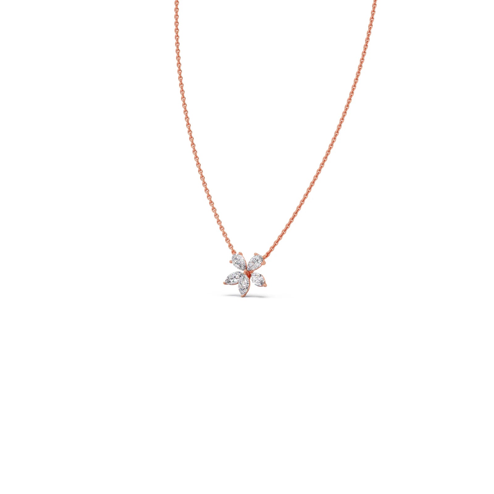 This pendant features a delicate floral design, crafted from five marquise and pear shaped diamonds. The stones are arranged in a symmetrical, petal-like pattern, creating a sparkling flower motif. The pendant offers a feminine and elegant look, perfect for adding a touch of floral brilliance to any outfit.