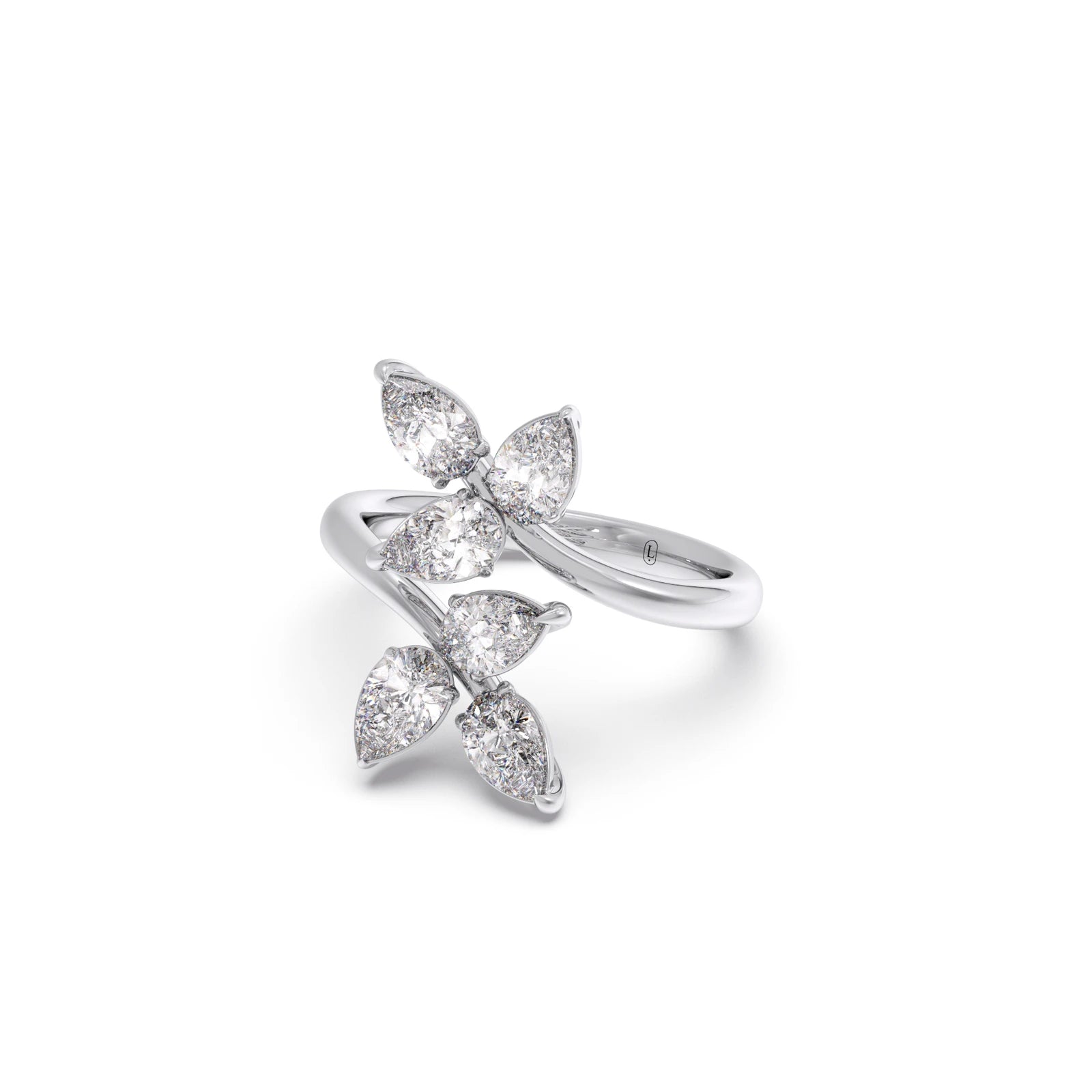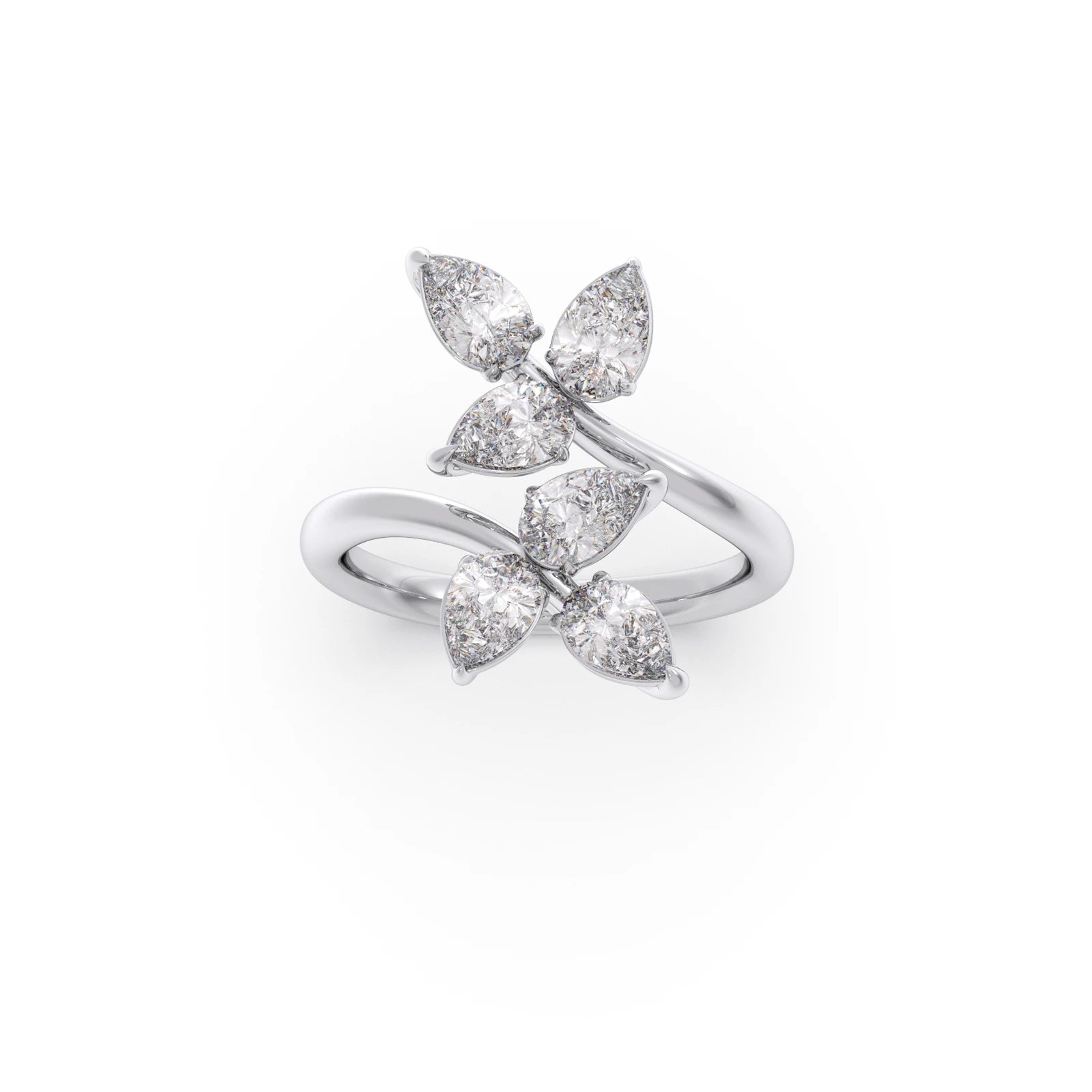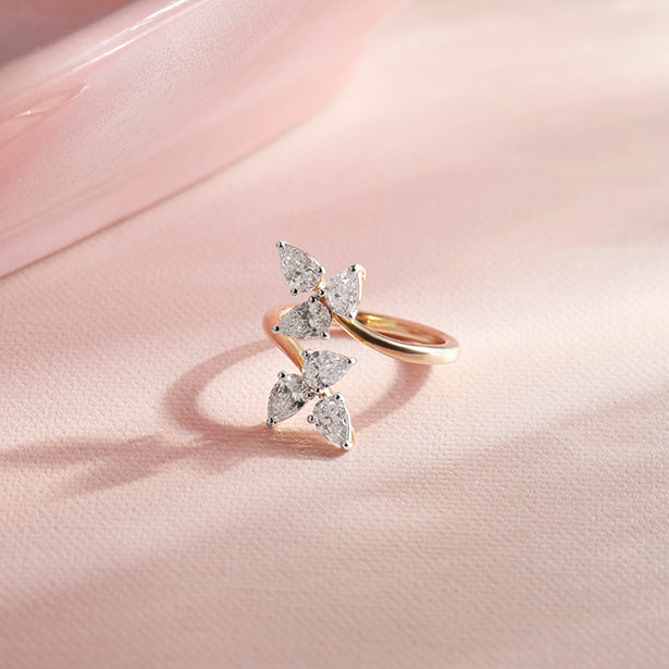 This enchanting ring features a delicate arrangement of sparkling pear-cut diamonds, artfully set to resemble a blooming flower. The elegant prong settings enhance the brilliance of each petal-like stone, creating a captivating and feminine design.