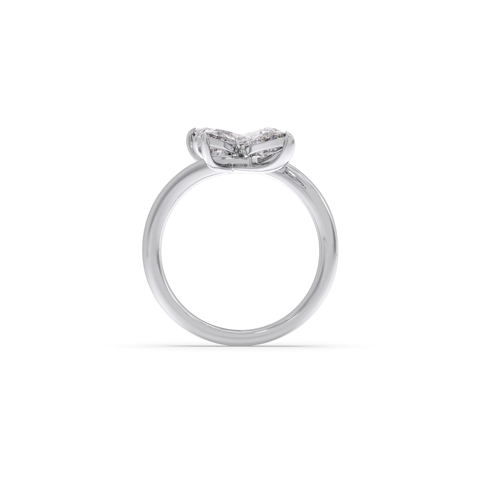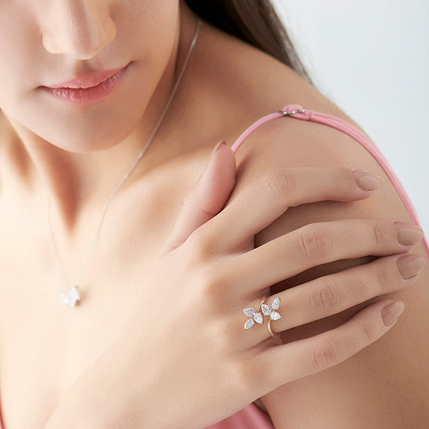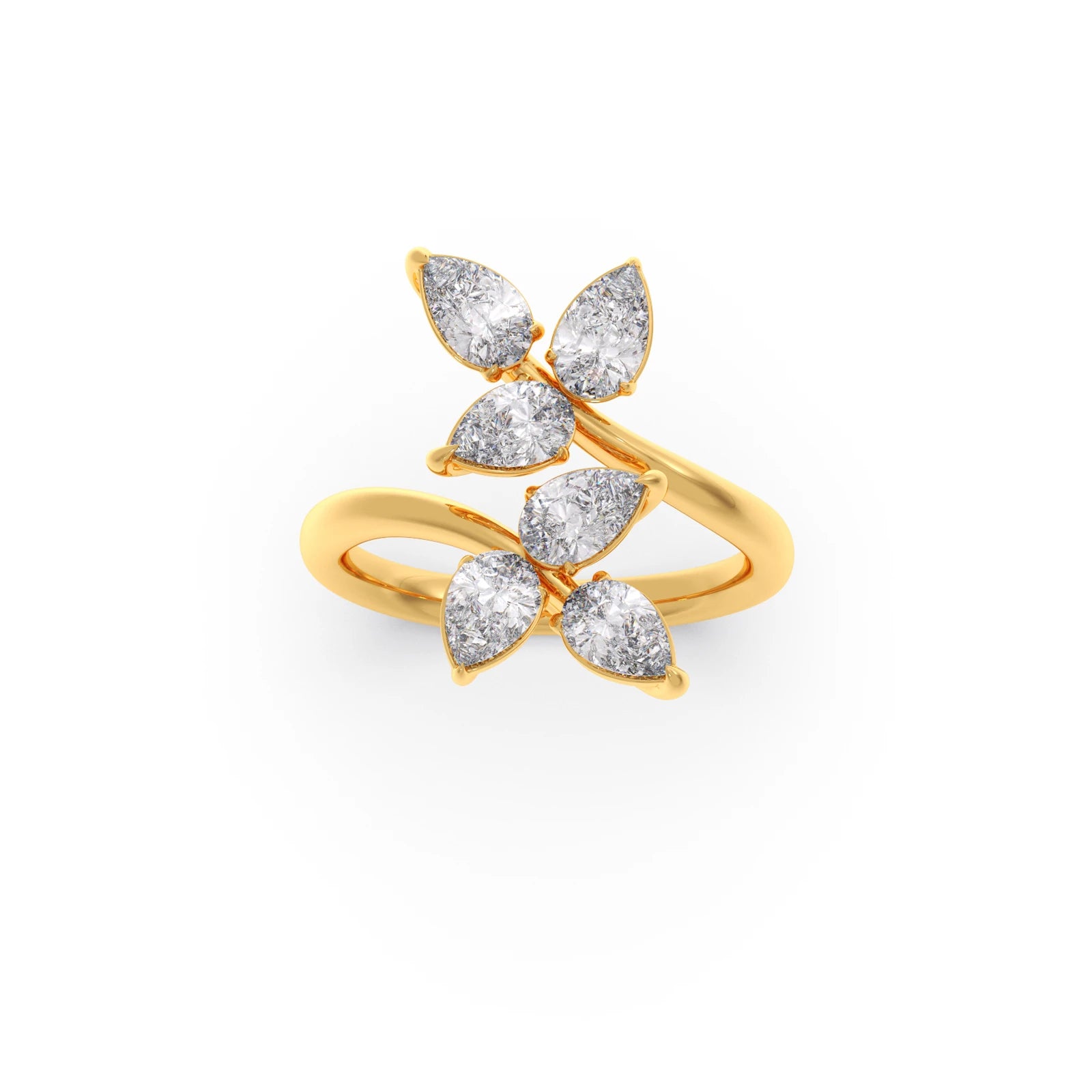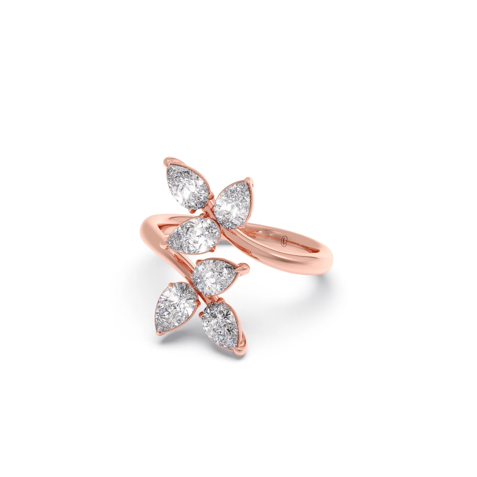 This enchanting ring features a delicate arrangement of sparkling pear-cut diamonds, artfully set to resemble a blooming flower. The elegant prong settings enhance the brilliance of each petal-like stone, creating a captivating and feminine design.