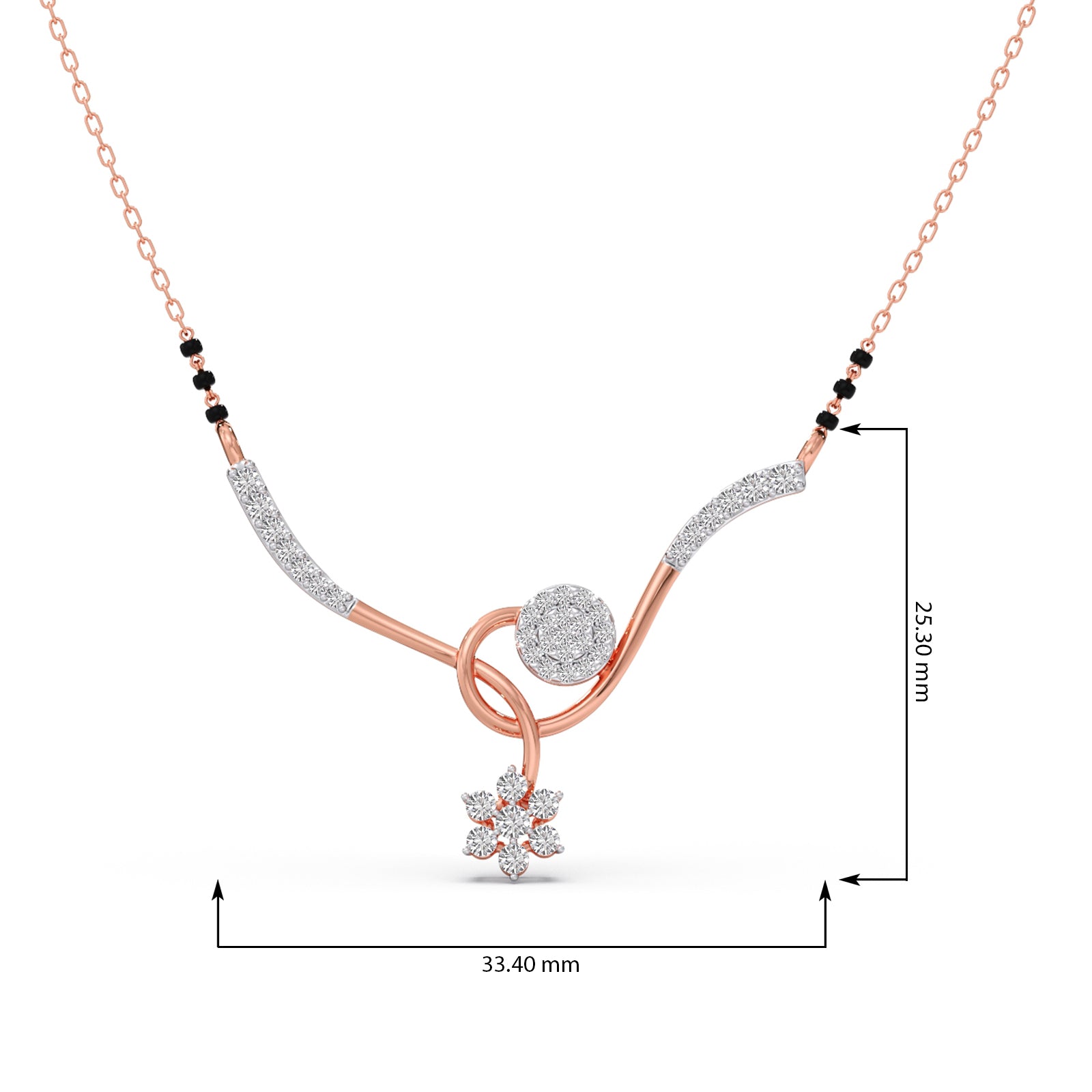 Exquisite in its simplicity, this mangalsutra features a floral twist design, crafted in classic 0.360ct round-cut and 0.346ct round diamonds as a timeless symbol of your enduring love. A modern yet traditional piece, perfect for the contemporary everyday wear.