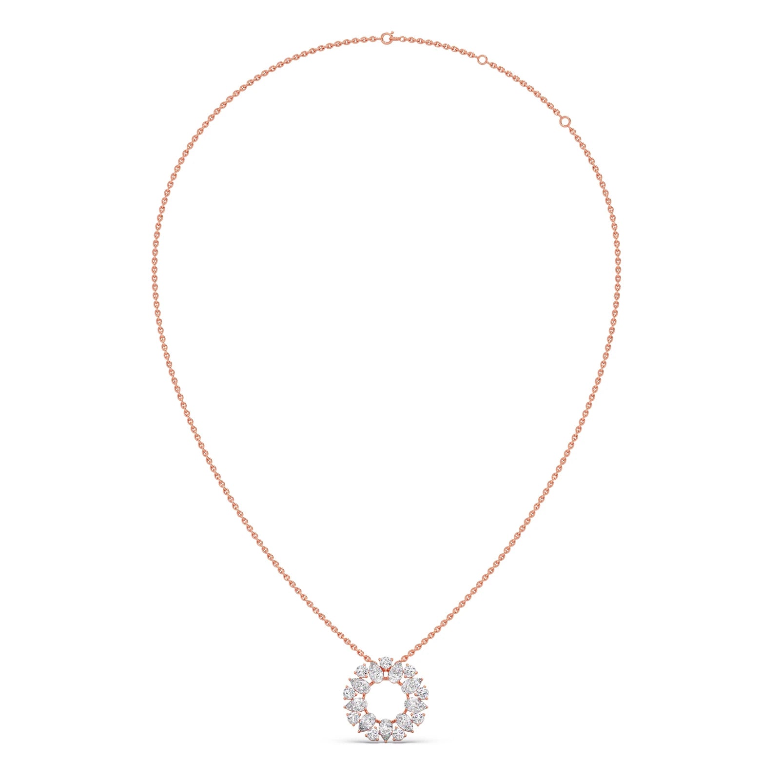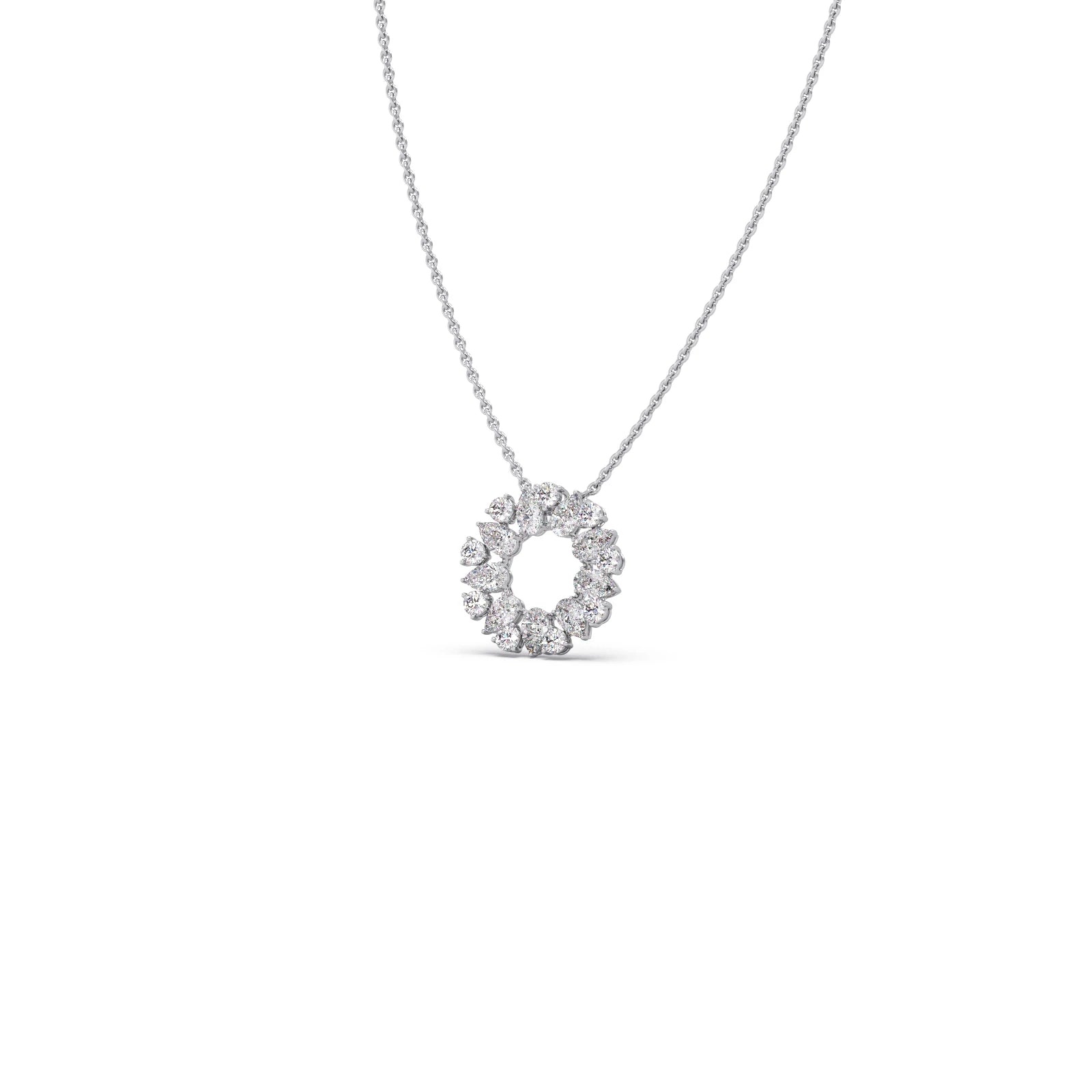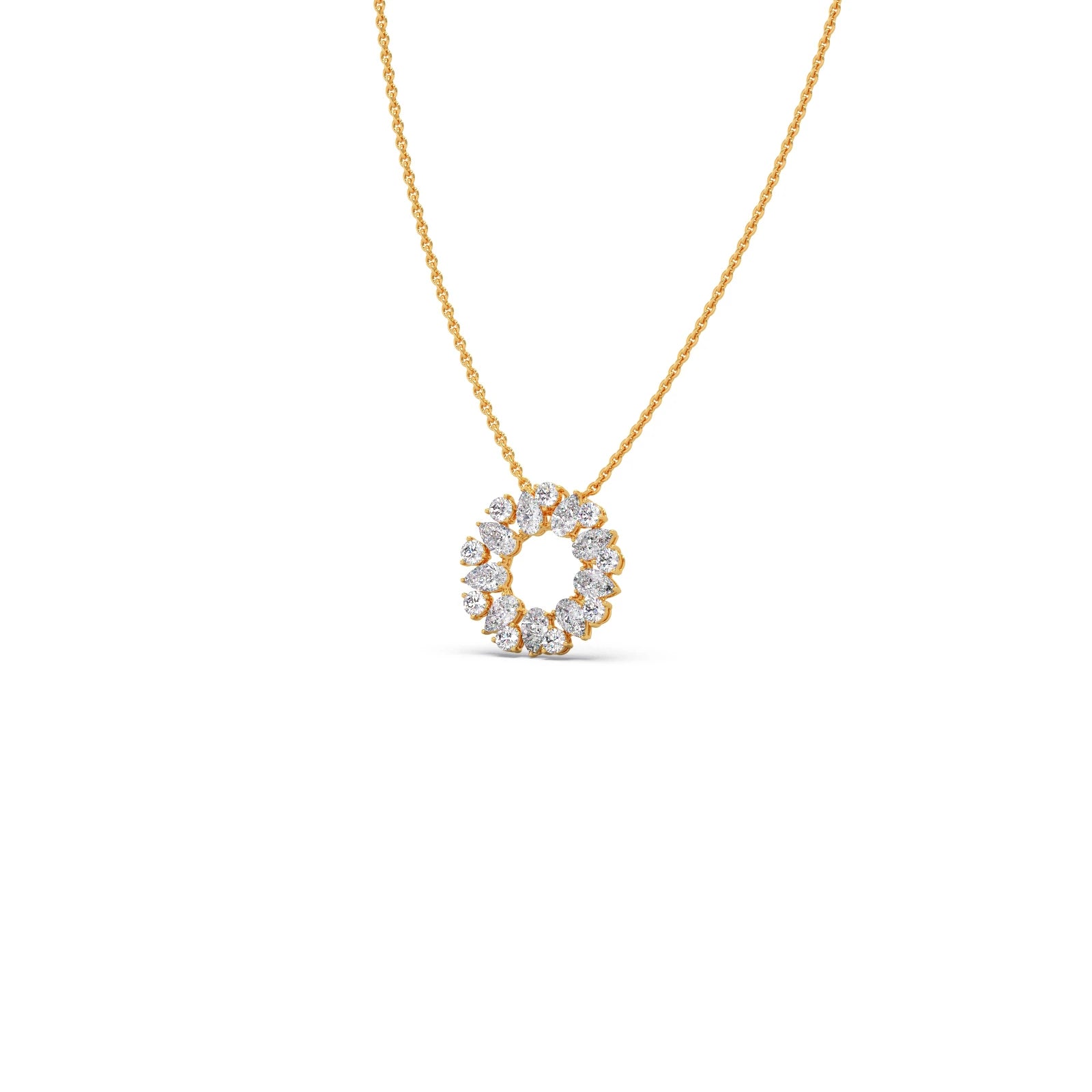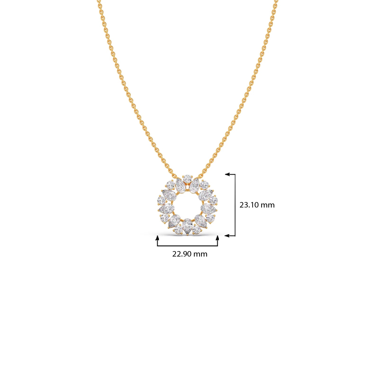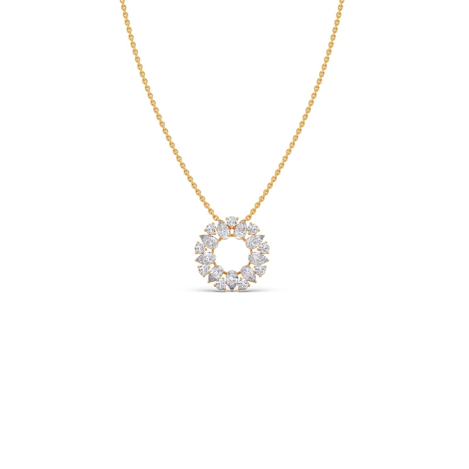 The Floral Wreath Diamond Pendant Necklace is a symbol of grace and renewal. A radiant circle of mixed-cut diamonds pear, marquise, and round forms a shimmering wreath, reminiscent of blooming petals. Each diamond is carefully placed to create a harmonious, organic flow, capturing the essence of elegance and vitality. Suspended from a fine chain, this pendant adds a luminous touch to any moment, making it a perfect piece for those who cherish beauty in every detail.