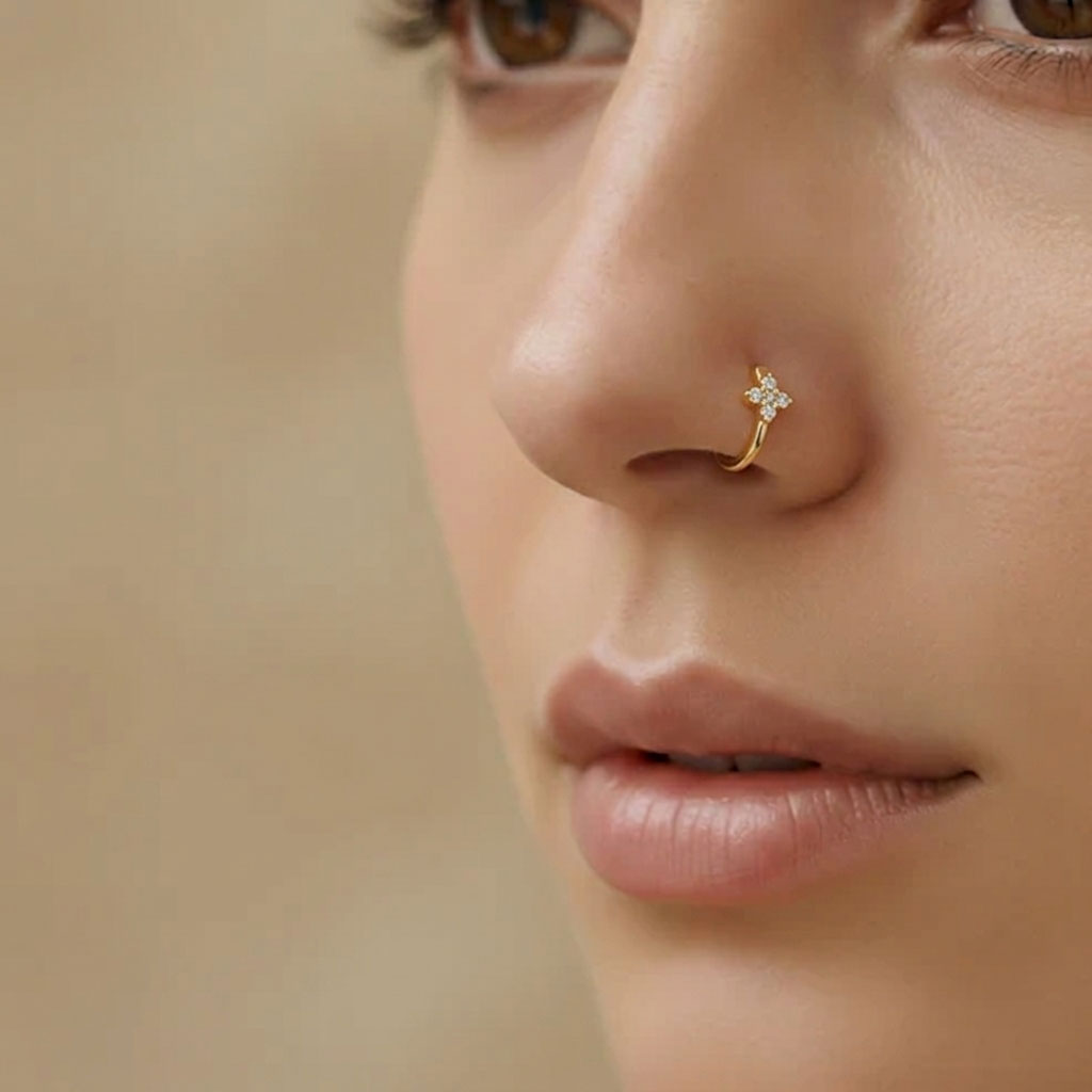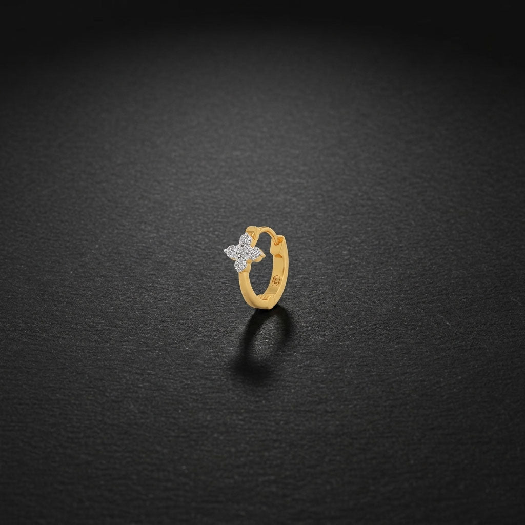 Floret Diamond Bali Nose Pin is inspired by delicate floral forms, featuring a sparkling diamond set within intricate Bali-style detailing. Graceful and timeless.