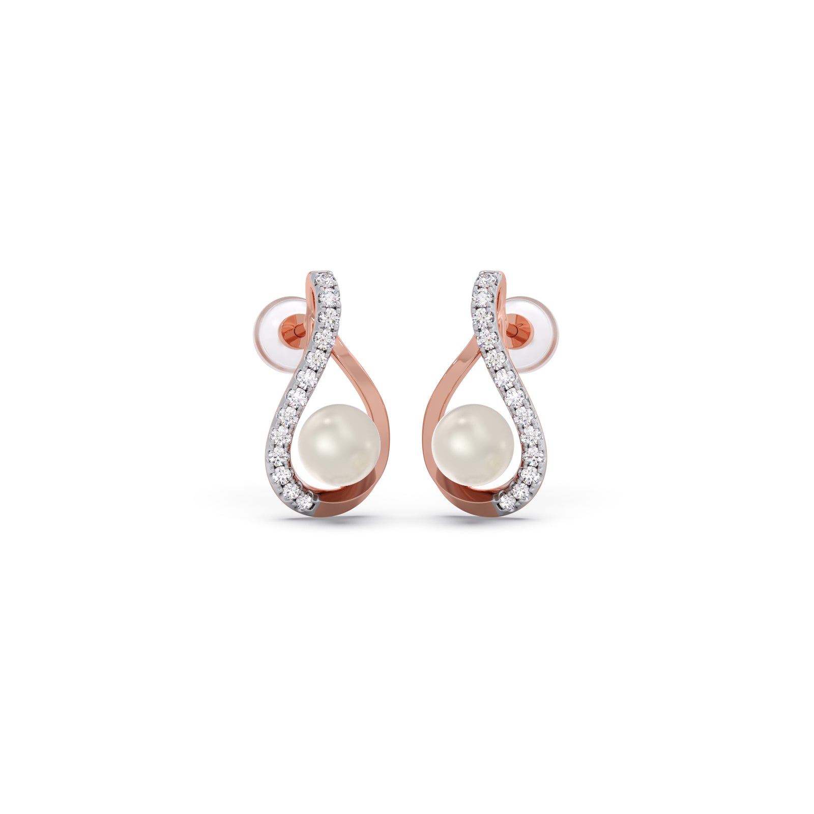 Each earring features a round, white freshwater pearl with a smooth, lustrous finish. The pearls are cradled within a teardrop style loop of polished metal. One side of the metal loop is pavé-set with shimmering round-cut diamonds. The overall look is elegant and sophisticated, making them suitable formal events or as a classic addition to a fine jewelry collection.