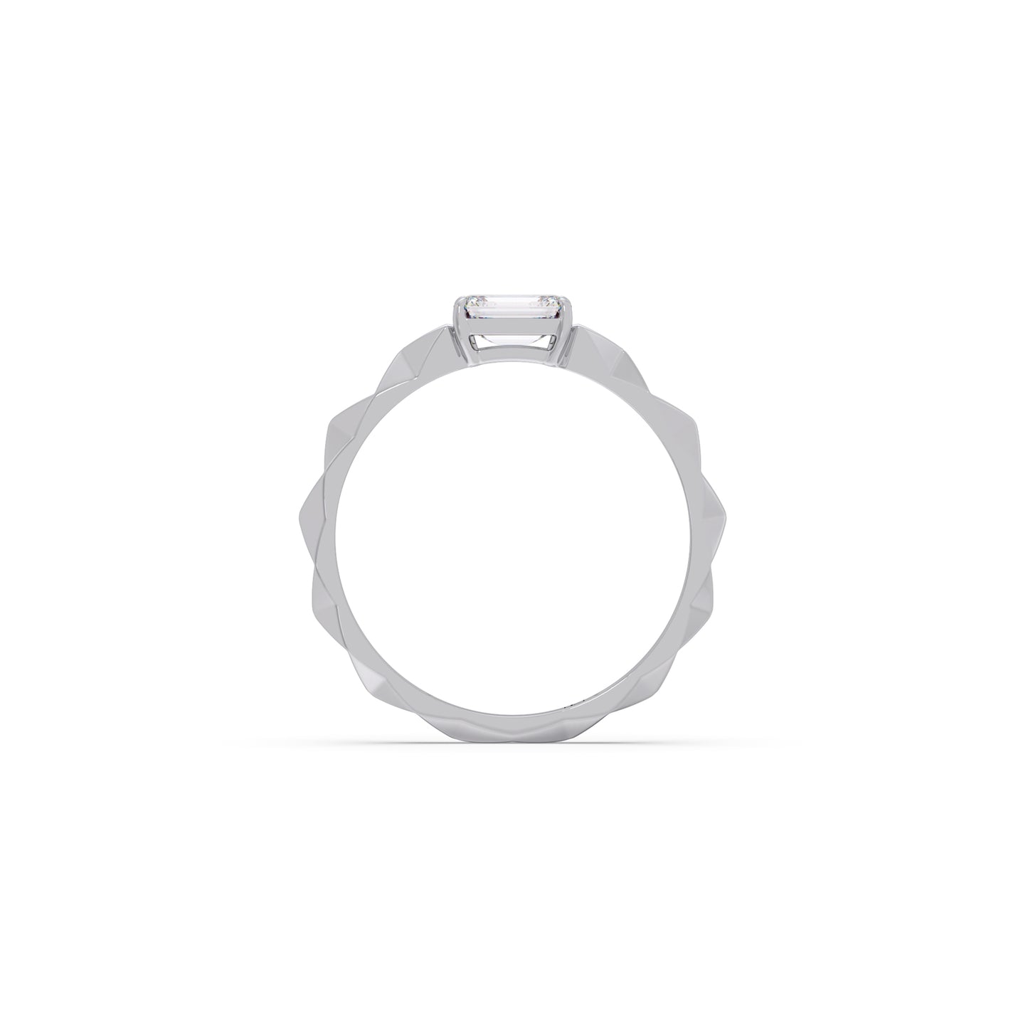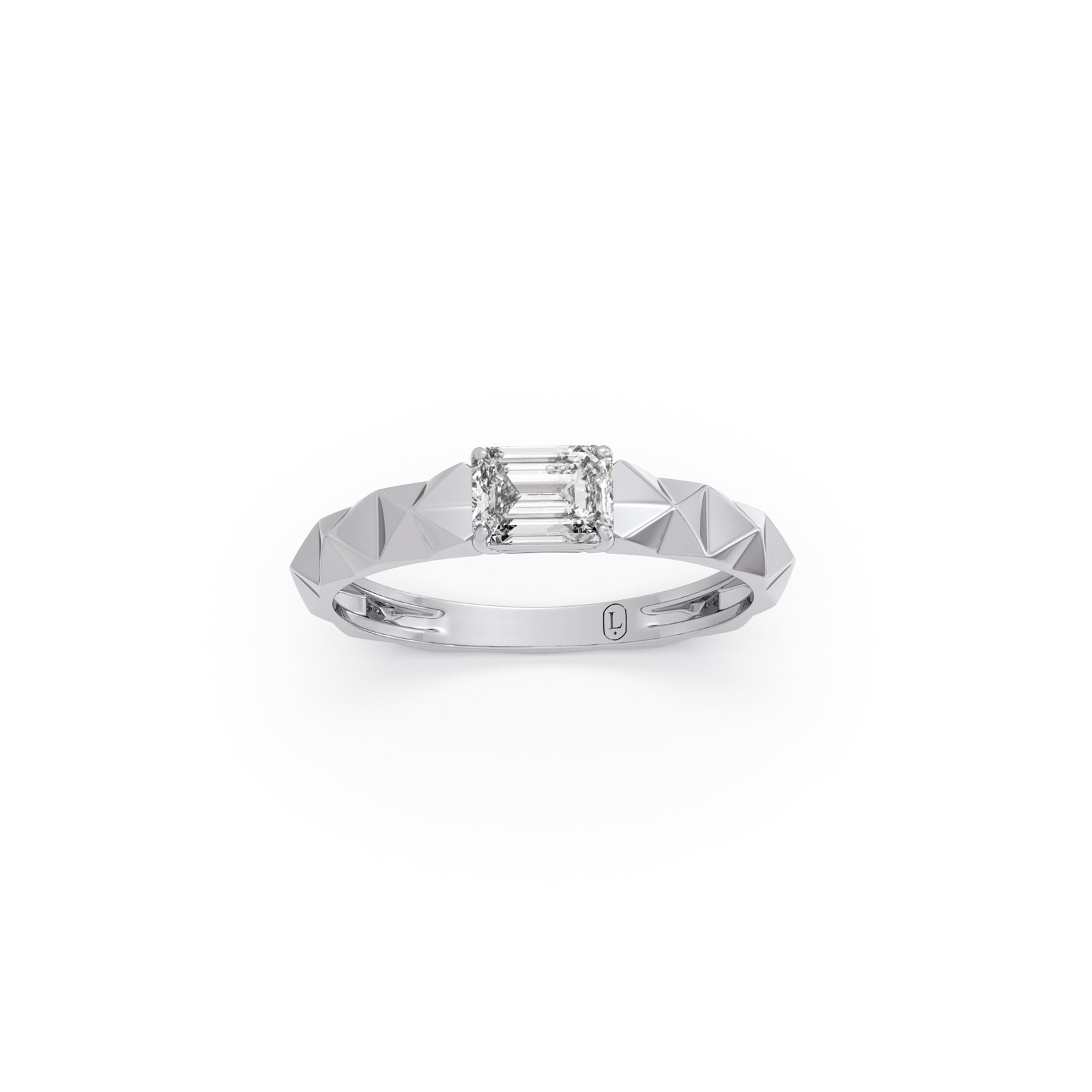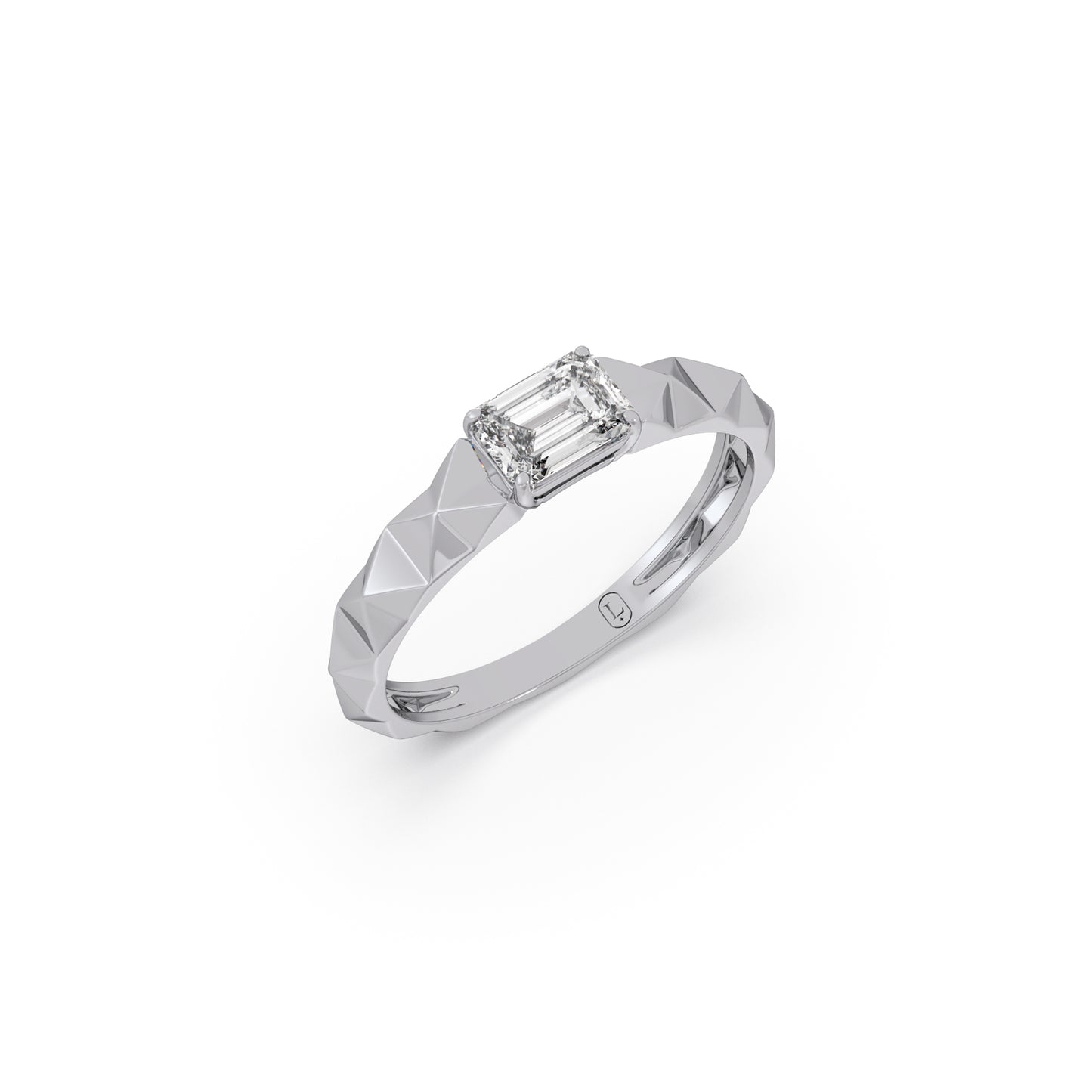 The Geometric Emerald Solitaire Engagement Ring showcases a 0.50 ct emerald-cut diamond in a sleek solitaire setting. Featuring a sculpted band with geometric texture, this design blends modern structure with timeless elegance—crafted for those who appreciate bold lines, clean form, and meaningful commitment.