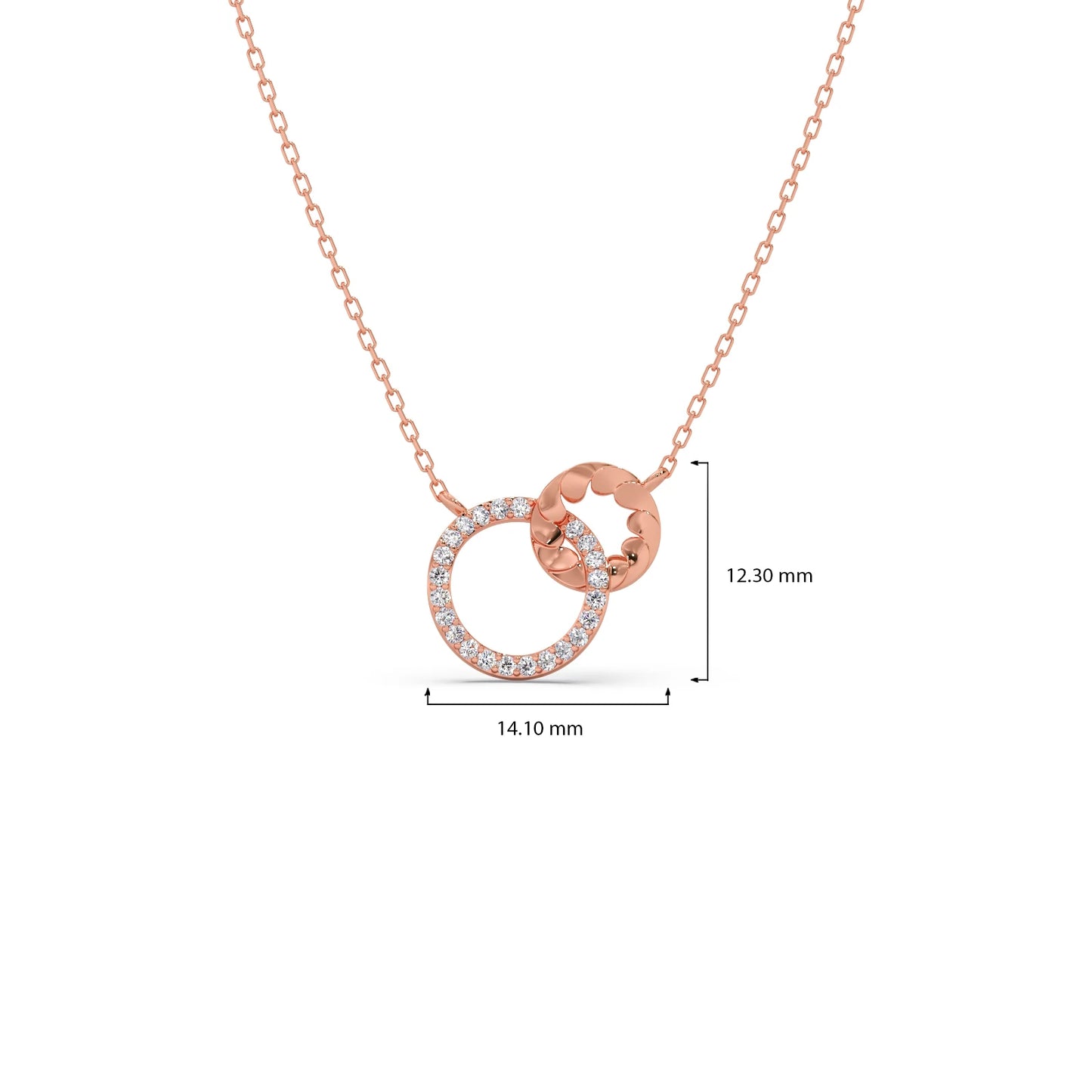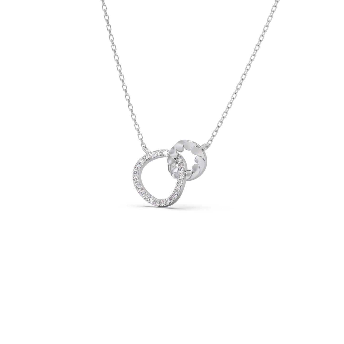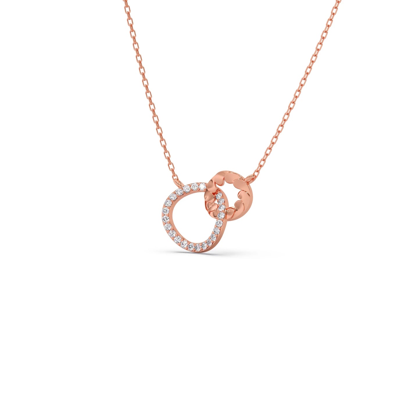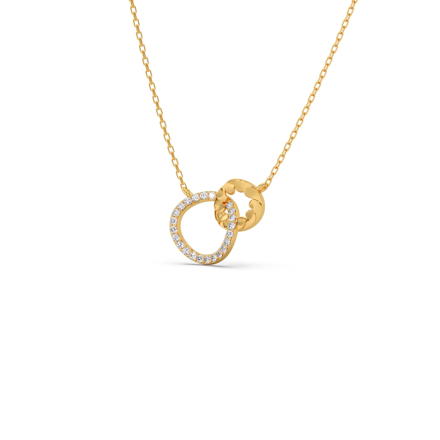 This striking pendant features two interlocking gold circles, one adorned with sparkling diamonds. The intertwined design symbolizes unity and connection, while the diamonds add a touch of luxury. Perfect for everyday elegance or special occasions, this pendant offers a modern and meaningful statement piece.