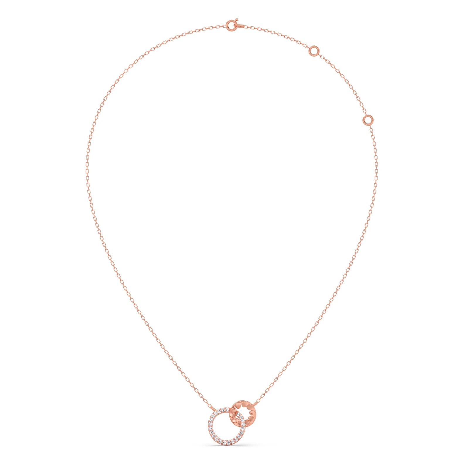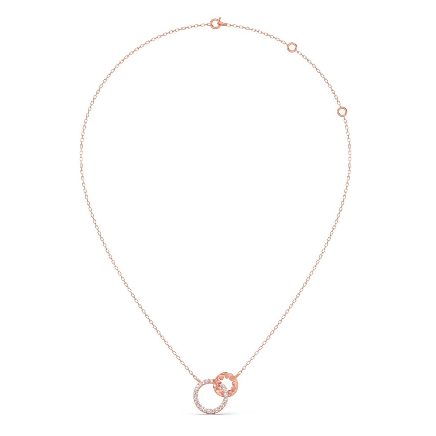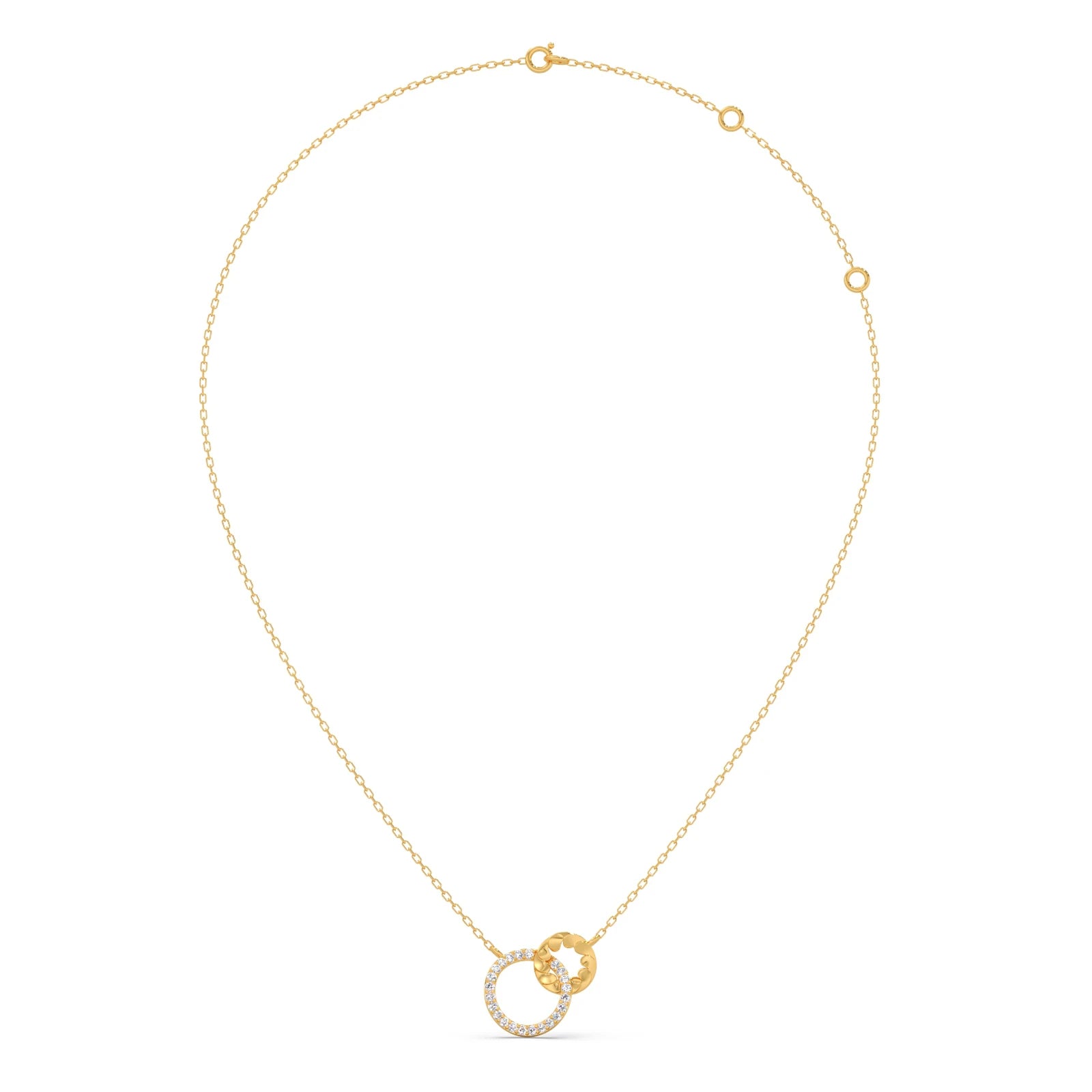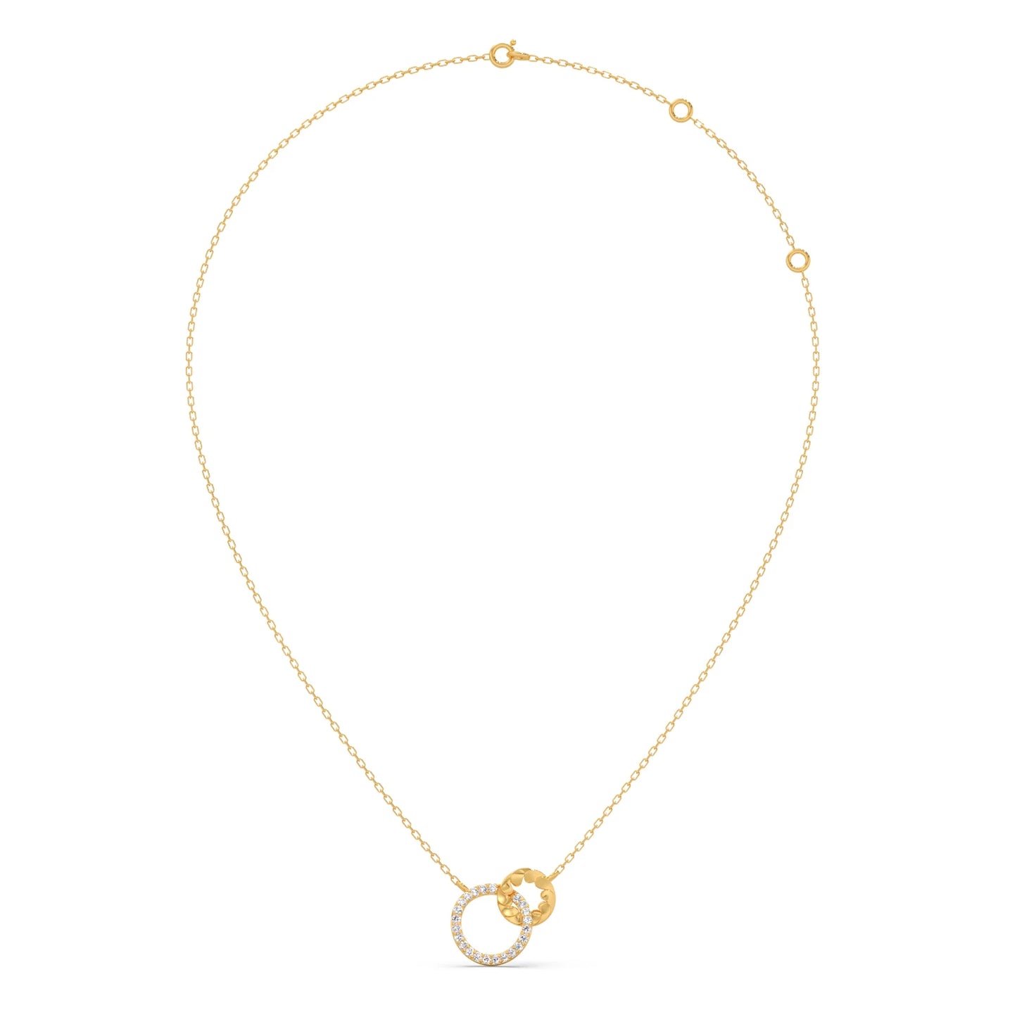 This striking pendant features two interlocking gold circles, one adorned with sparkling diamonds. The intertwined design symbolizes unity and connection, while the diamonds add a touch of luxury. Perfect for everyday elegance or special occasions, this pendant offers a modern and meaningful statement piece.