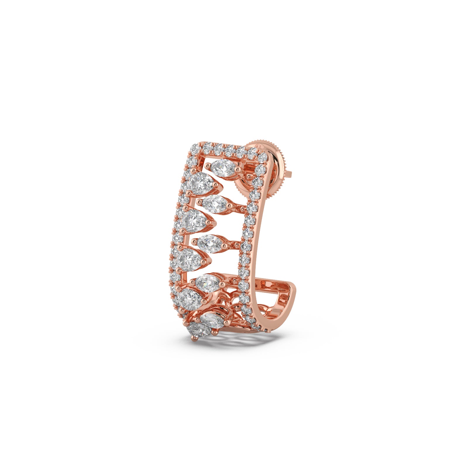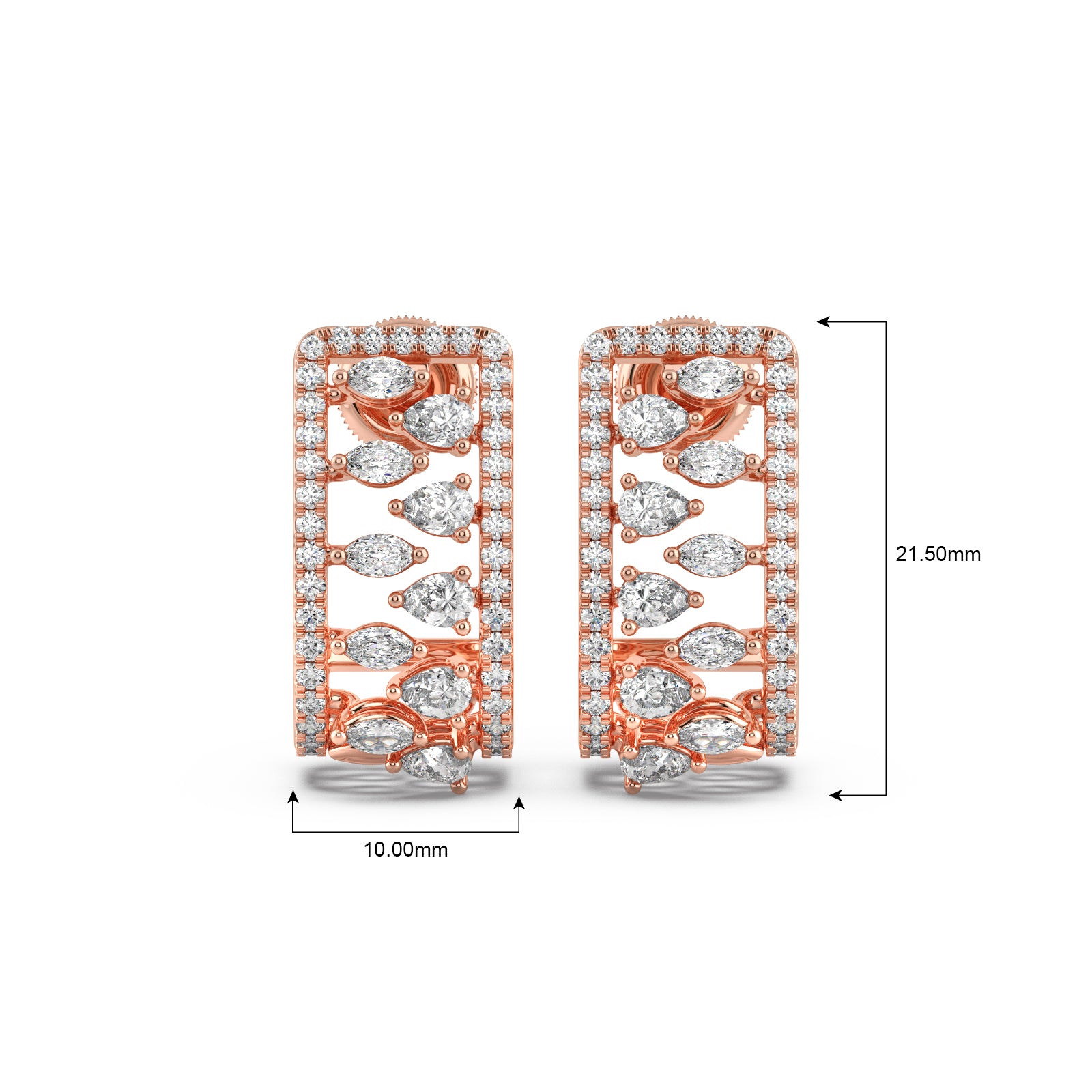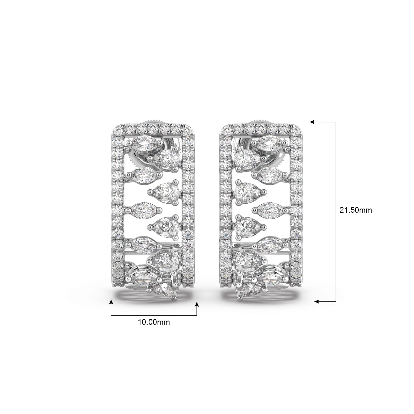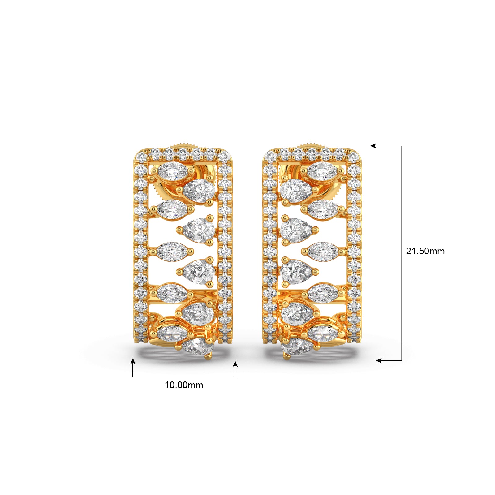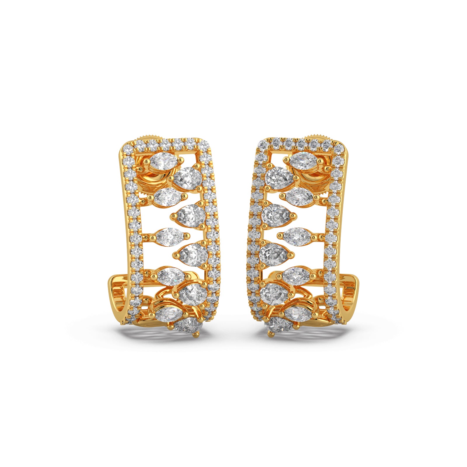 Bold and brilliant, these Gold and Diamond Rectangular Hoops Earrings are a modern marvel. The chic rectangular frame is adorned with a dazzling array of marquise-cut and round pave-set diamonds, creating a unique and intricate pattern. These earrings are a perfect fusion of contemporary design and timeless elegance, designed to make a sophisticated statement.