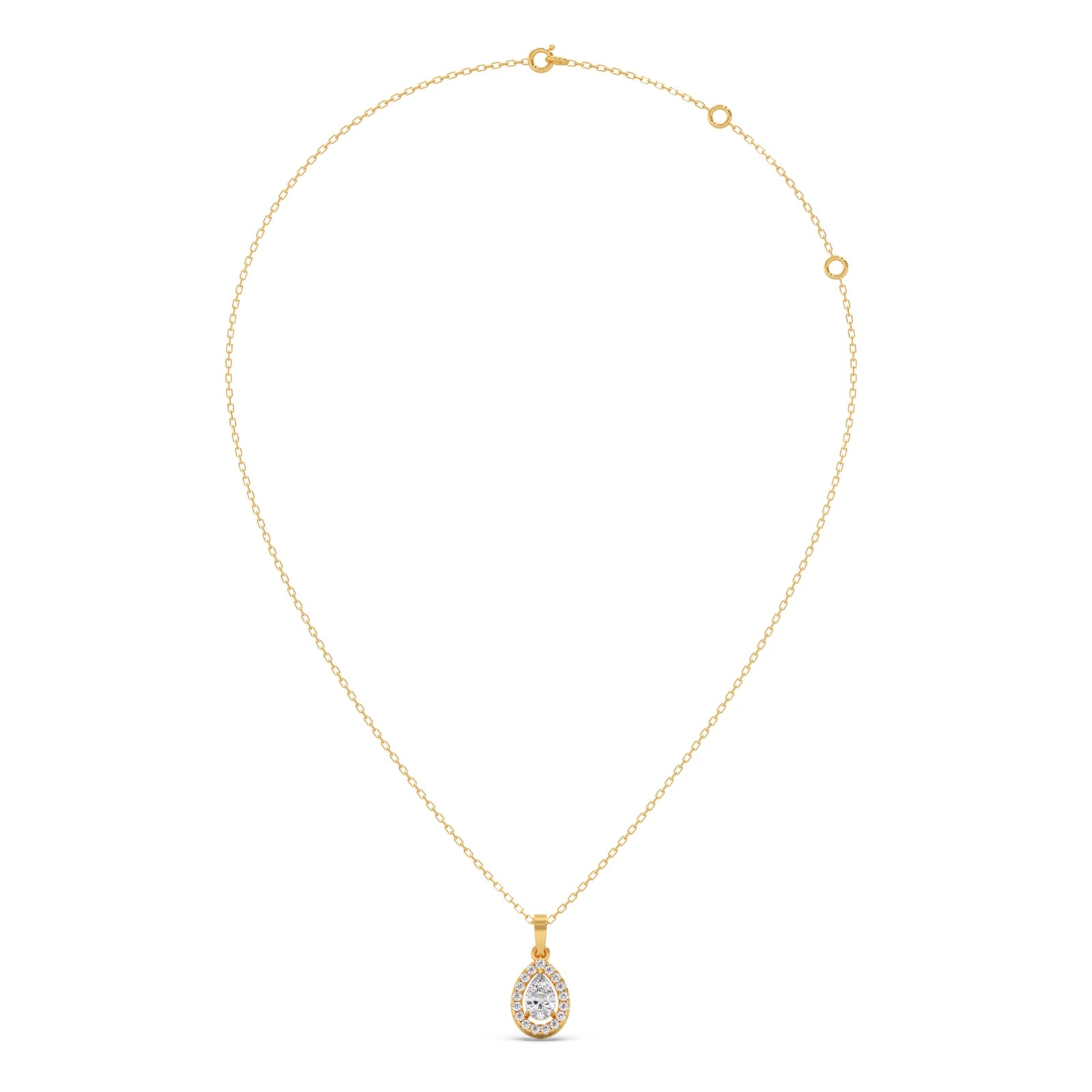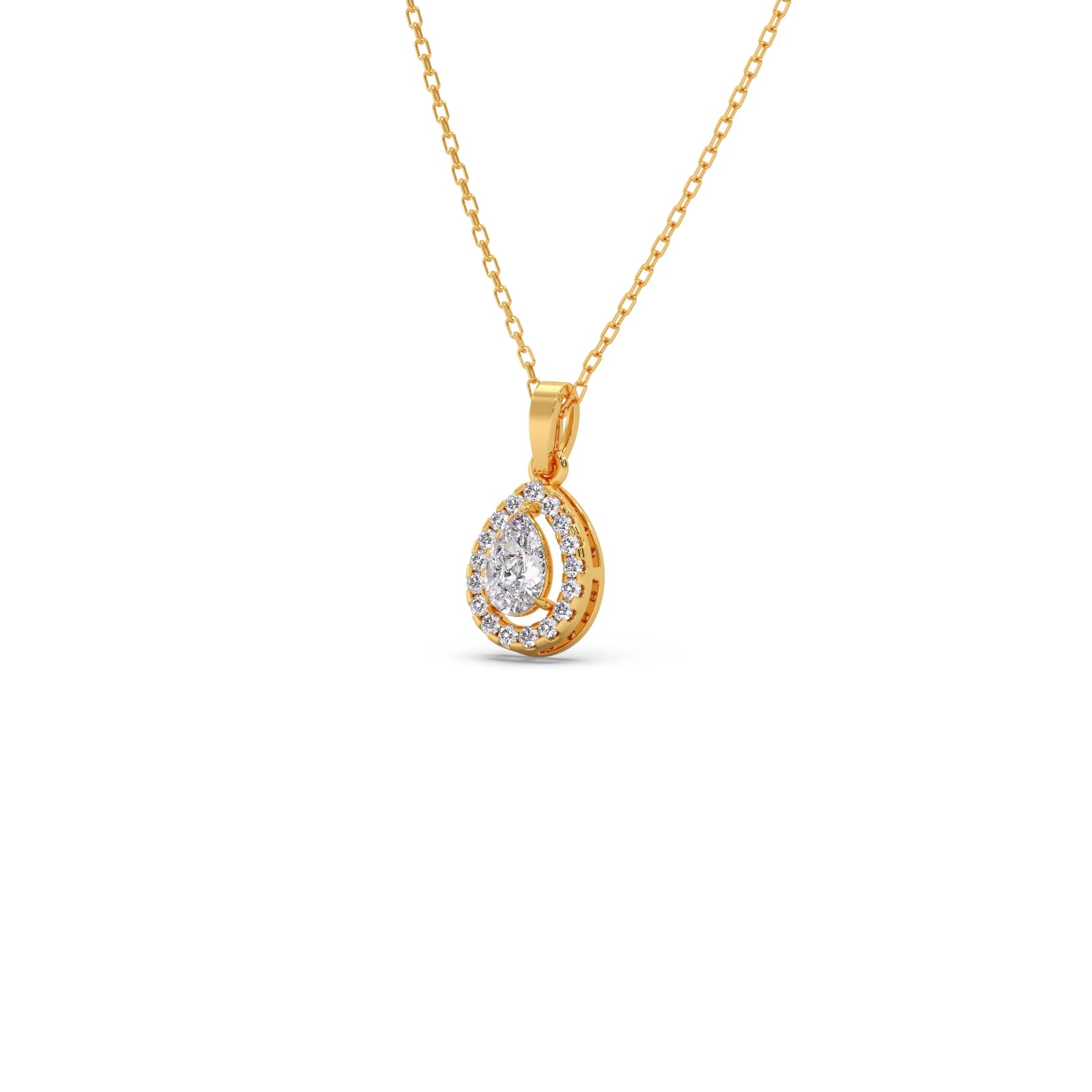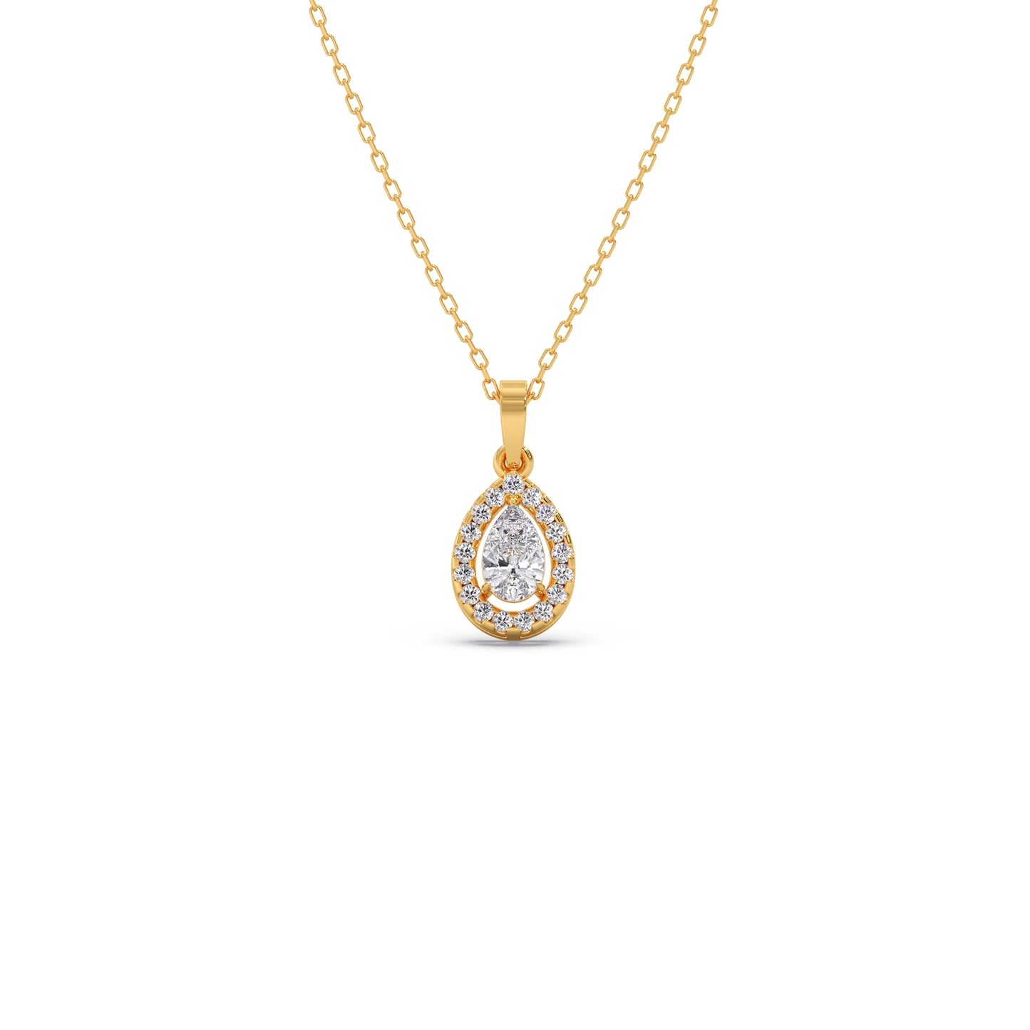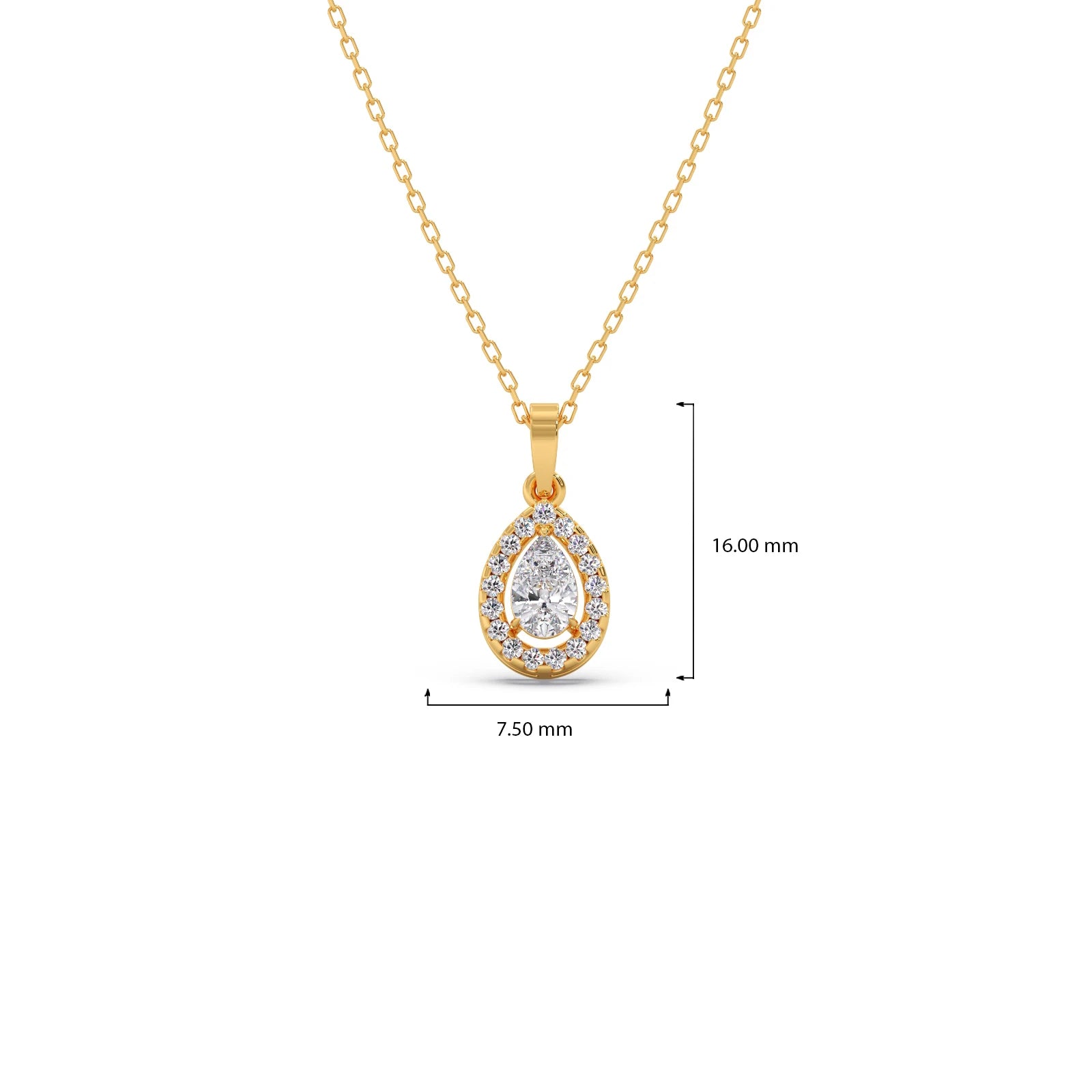 Dazzle with our Gold Pear Halo Diamond Pendant. A luminous pear-shaped center stone is encircled by a delicate diamond halo, enhancing its brilliance. Crafted in lustrous gold, this pendant adds a touch of timeless elegance to any ensemble, perfect for special occasions and everyday luxury.