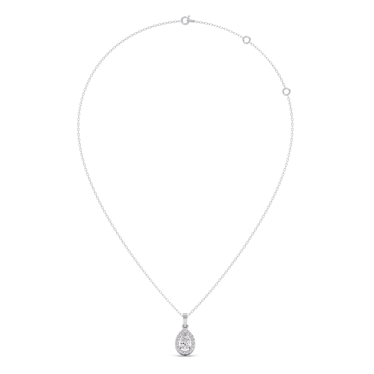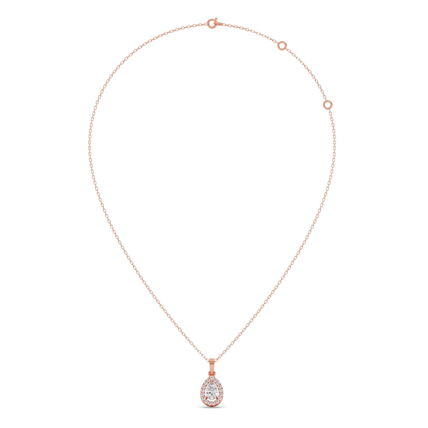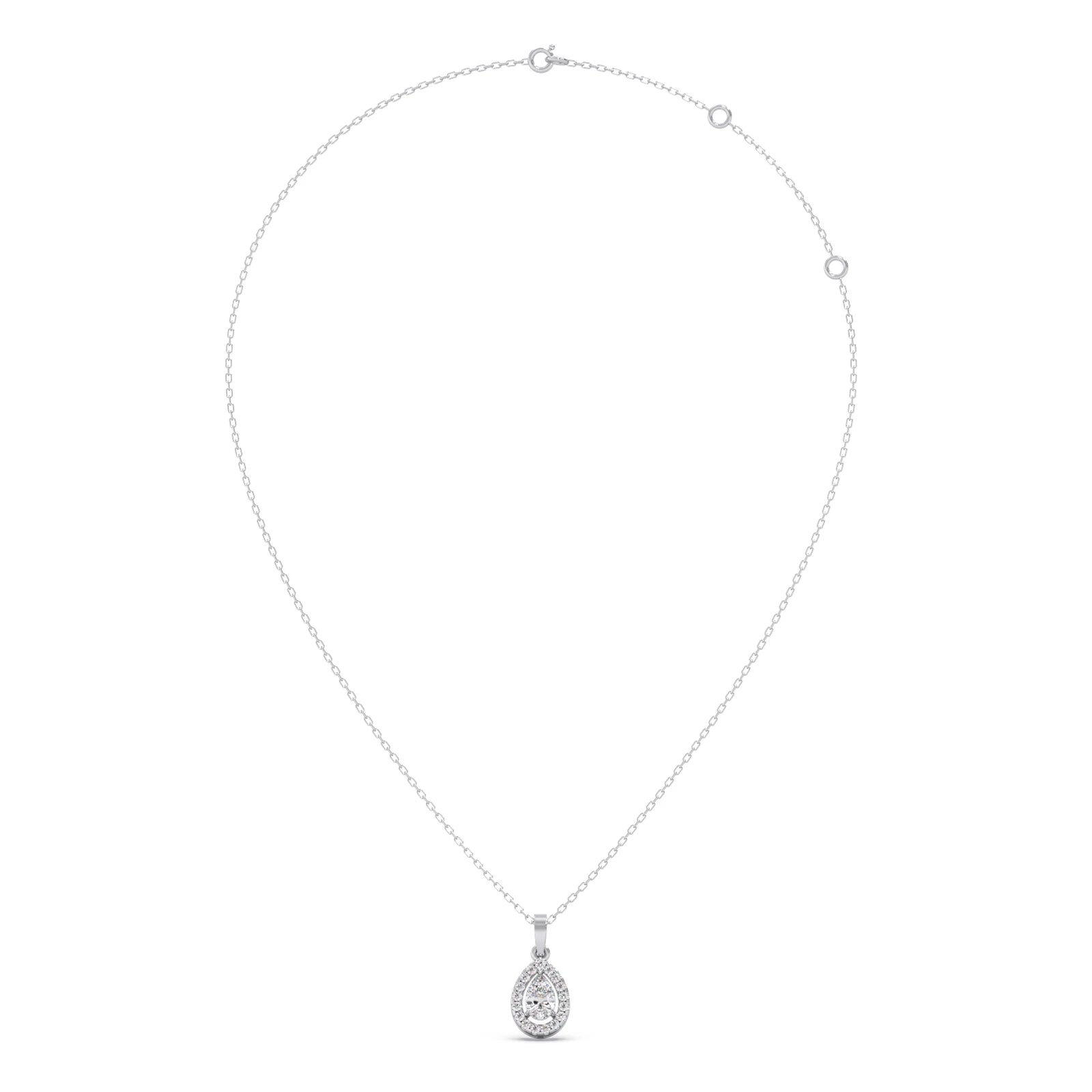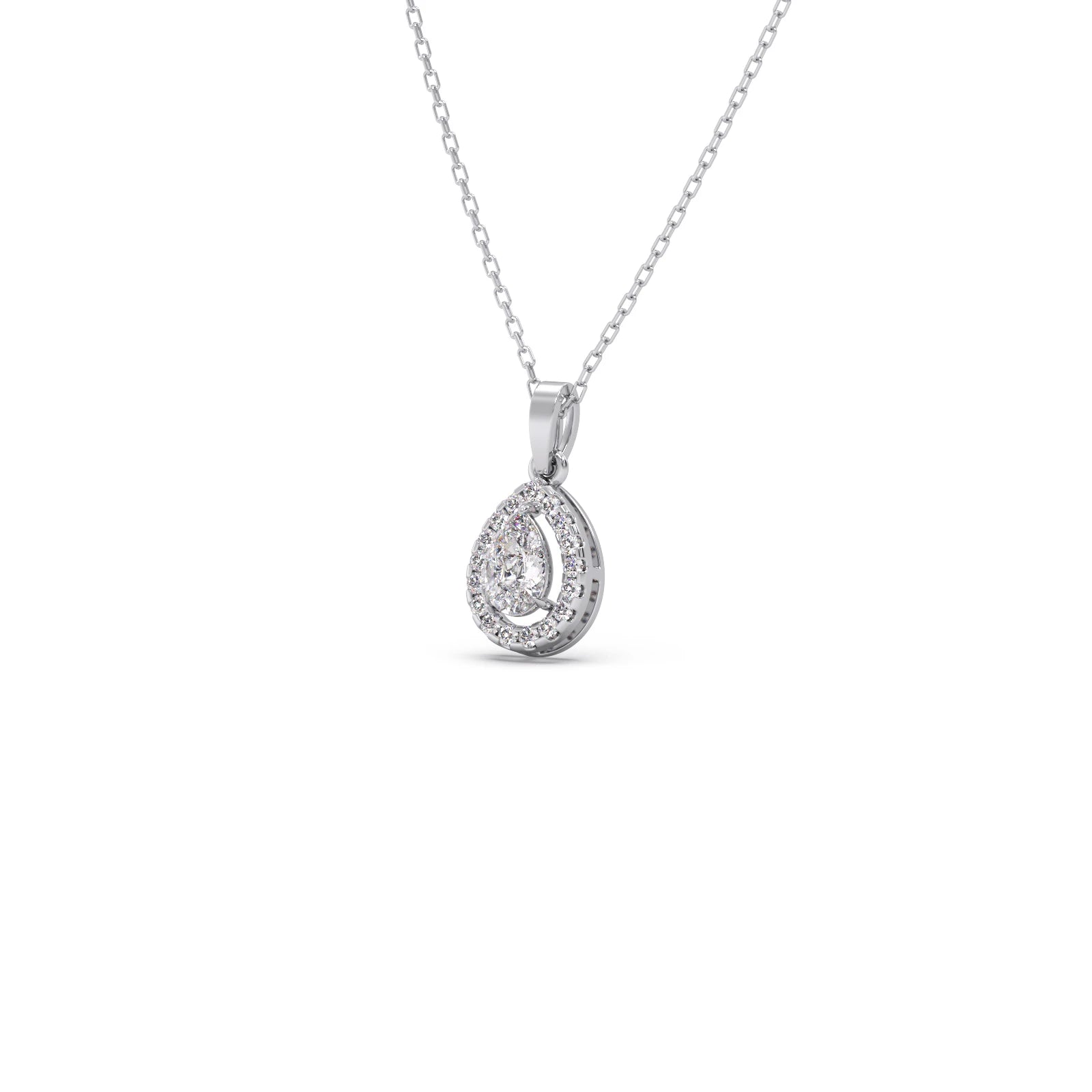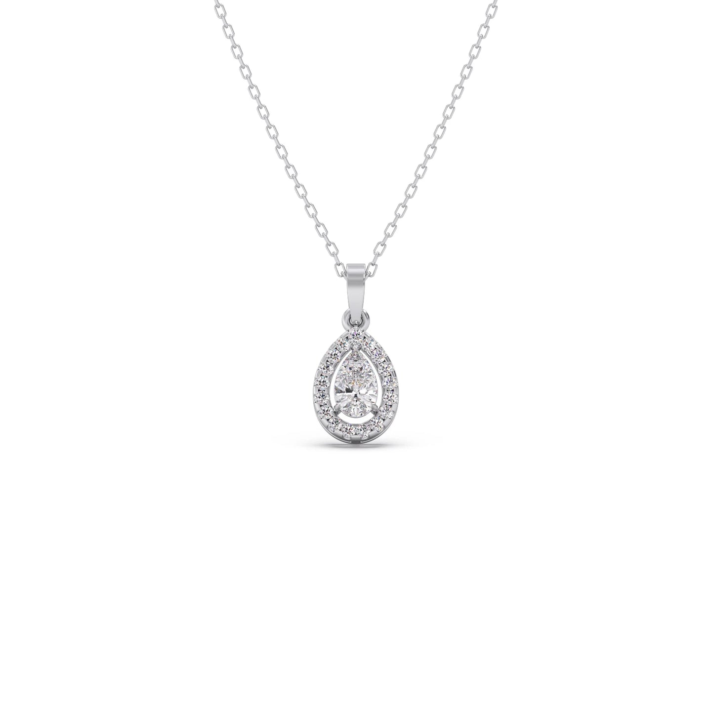 Dazzle with our Gold Pear Halo Diamond Pendant. A luminous pear-shaped center stone is encircled by a delicate diamond halo, enhancing its brilliance. Crafted in lustrous gold, this pendant adds a touch of timeless elegance to any ensemble, perfect for special occasions and everyday luxury.