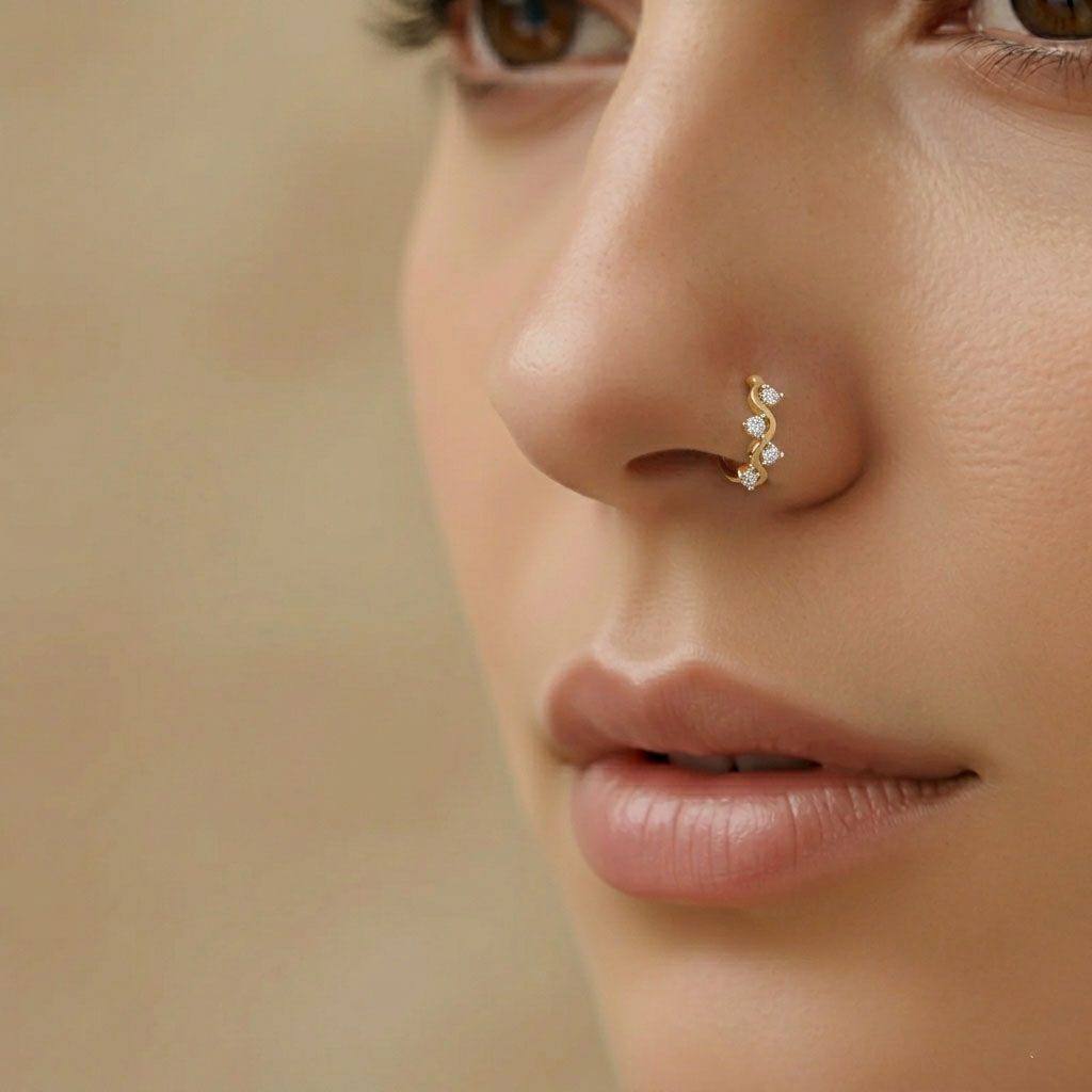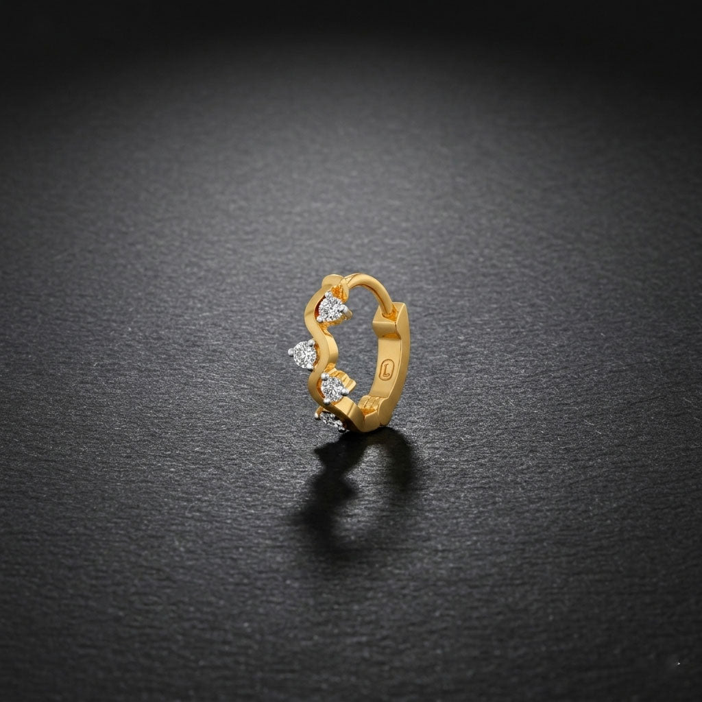 Inspired by fluid wave forms, this diamond-accented Bali nose pin blends soft curves with golden warmth, adding a modern yet graceful sparkle to everyday style.