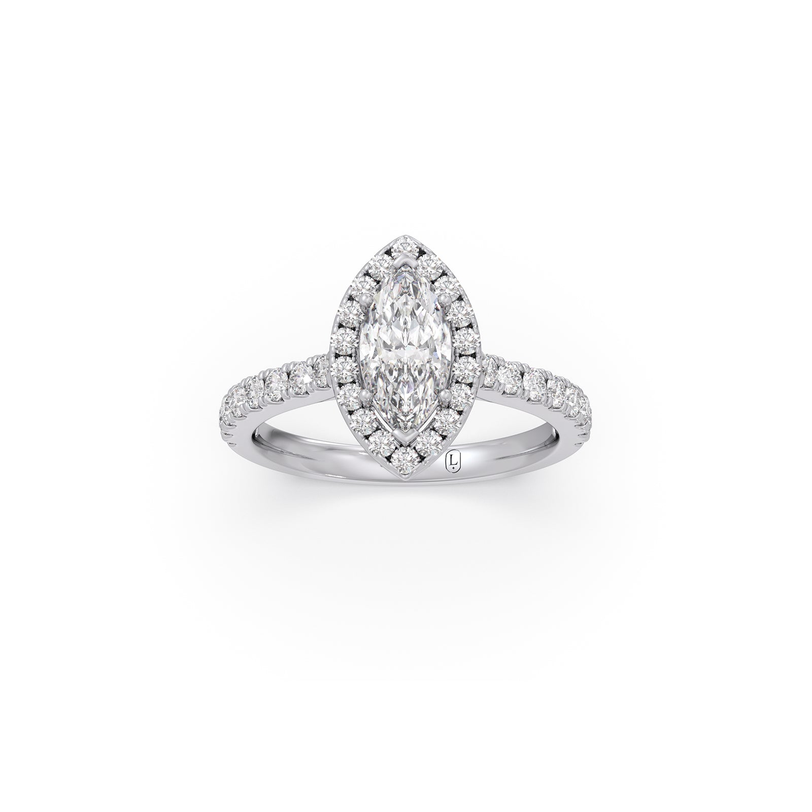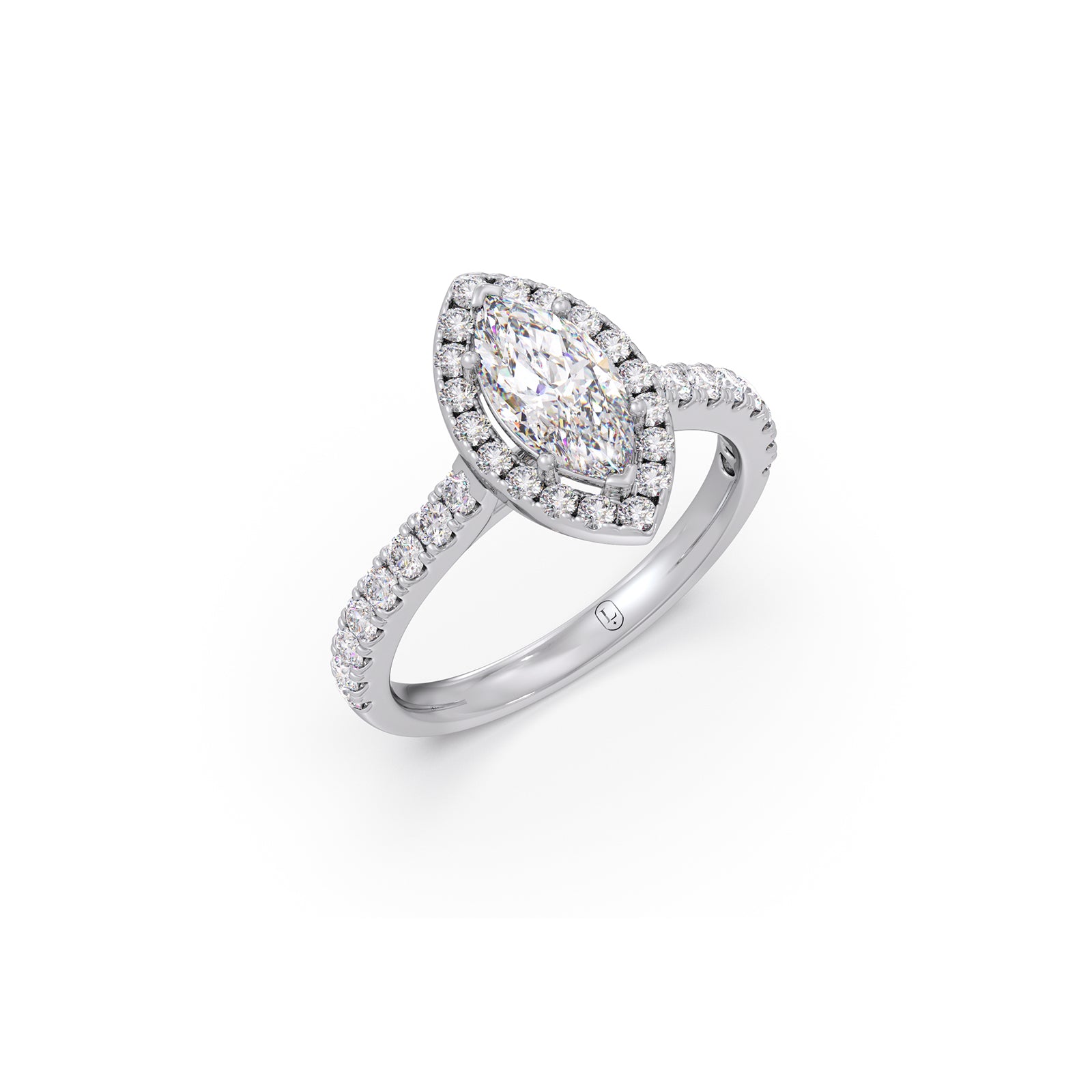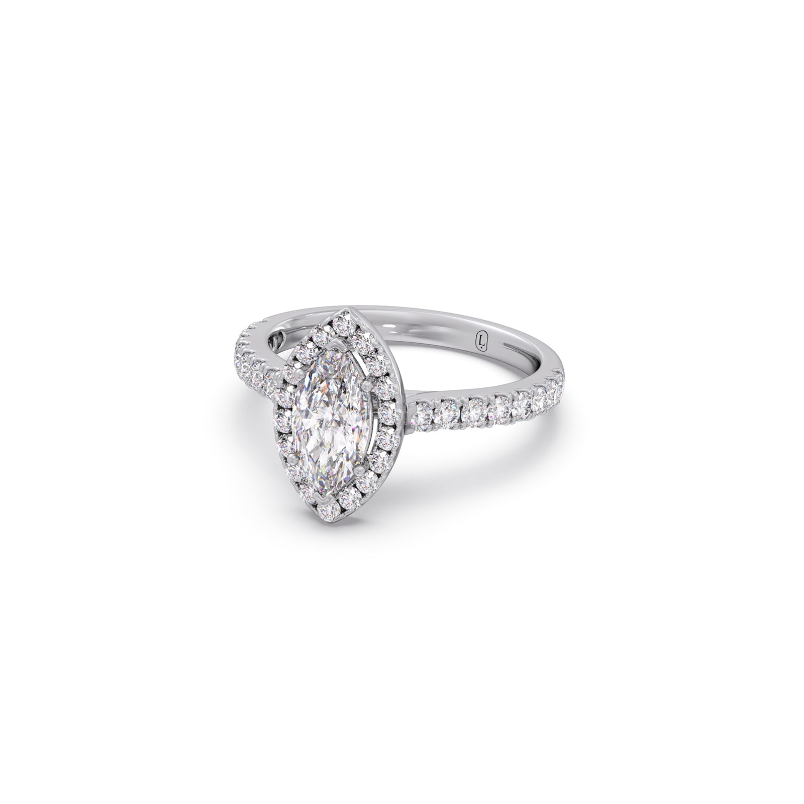 This engagement ring showcases a stunning Marquise-cut diamond at its centre, encircled by a delicate halo of pave-set diamonds. The pave diamonds extend along the band, adding extra sparkle. The ring's design balances classic elegance with a touch of modern sophistication, making it a captivating symbol of love and commitment.