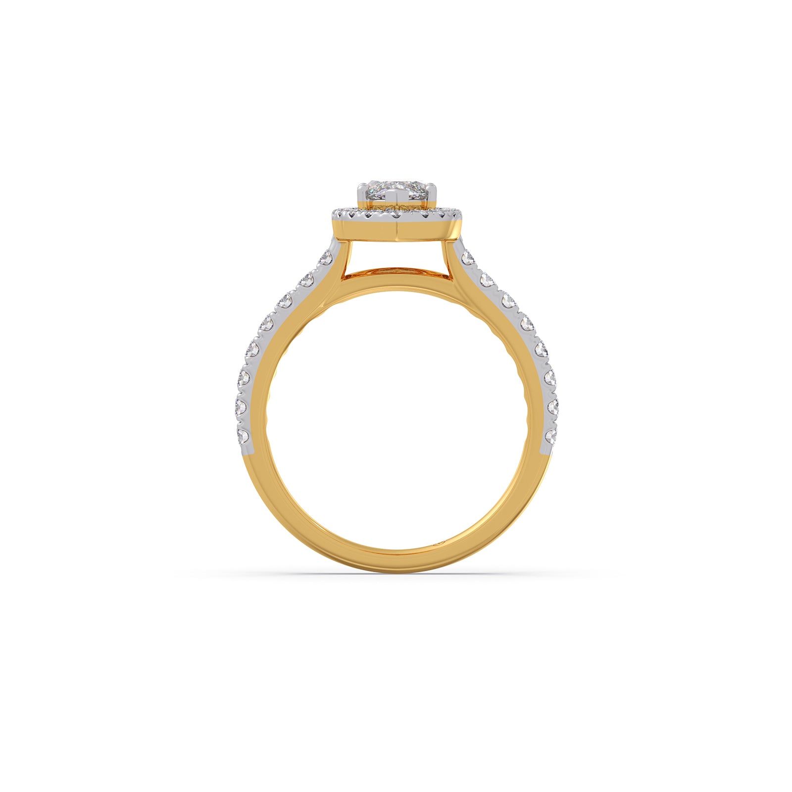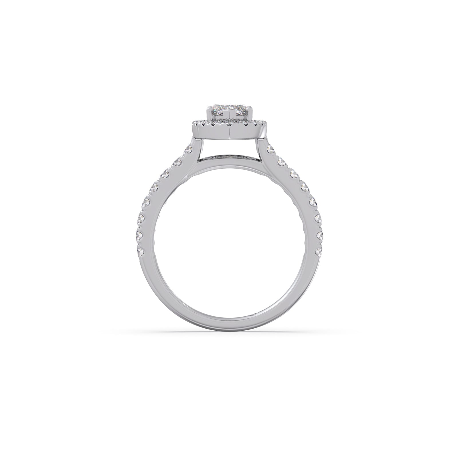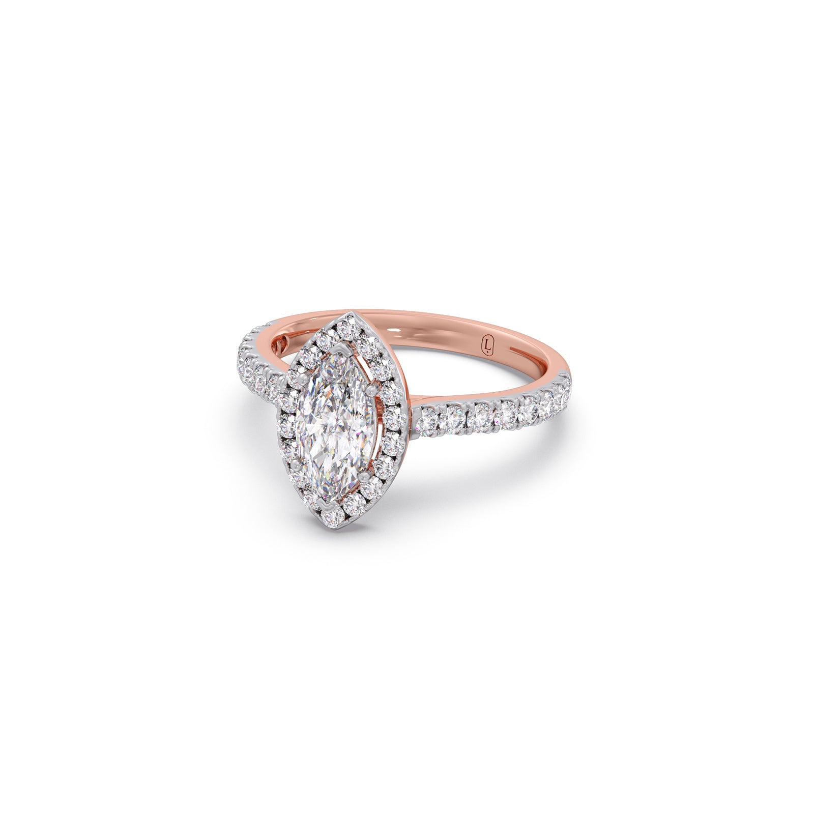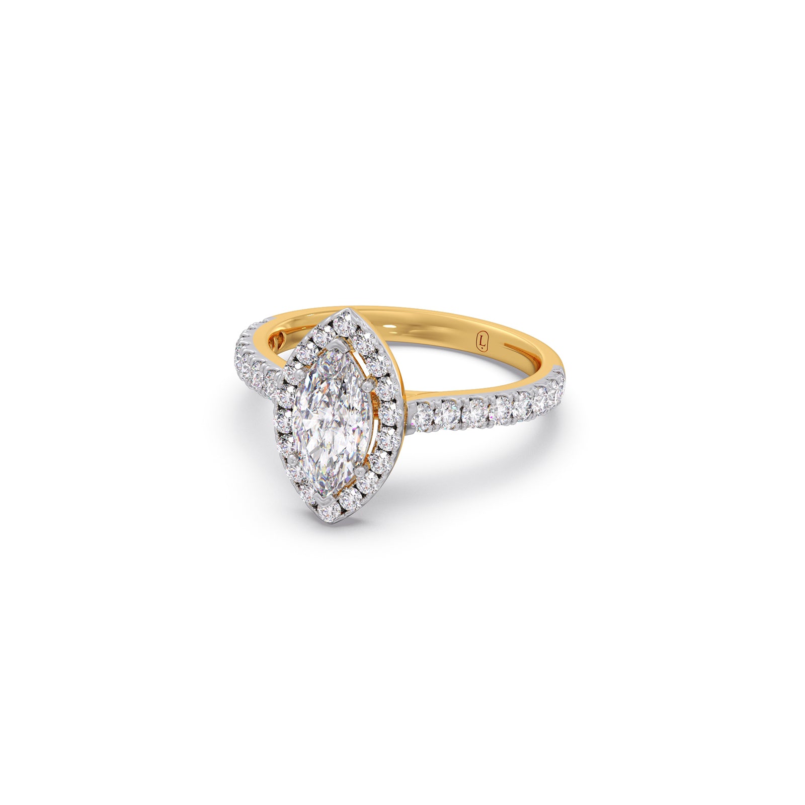 This engagement ring showcases a stunning Marquise-cut diamond at its centre, encircled by a delicate halo of pave-set diamonds. The pave diamonds extend along the band, adding extra sparkle. The ring's design balances classic elegance with a touch of modern sophistication, making it a captivating symbol of love and commitment.