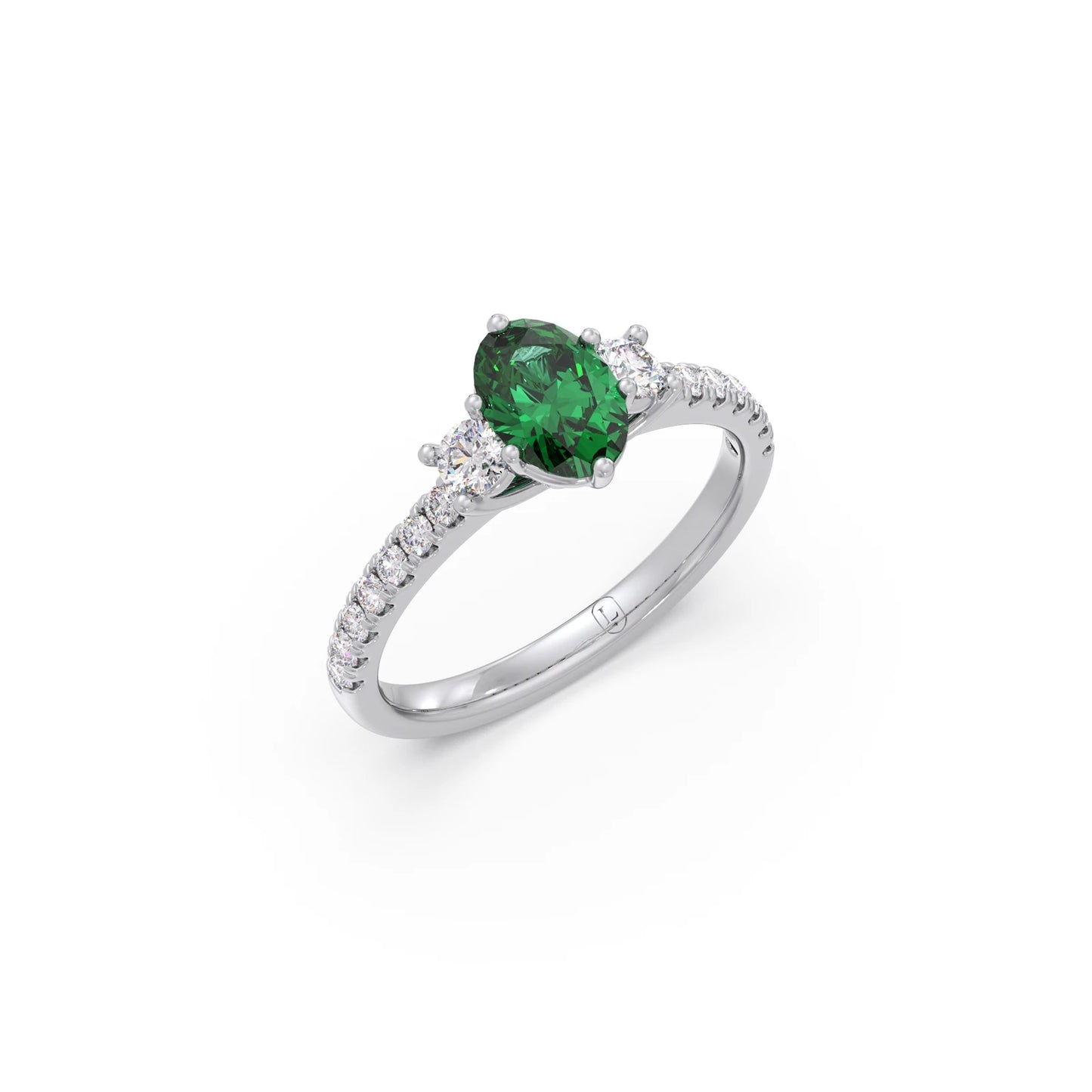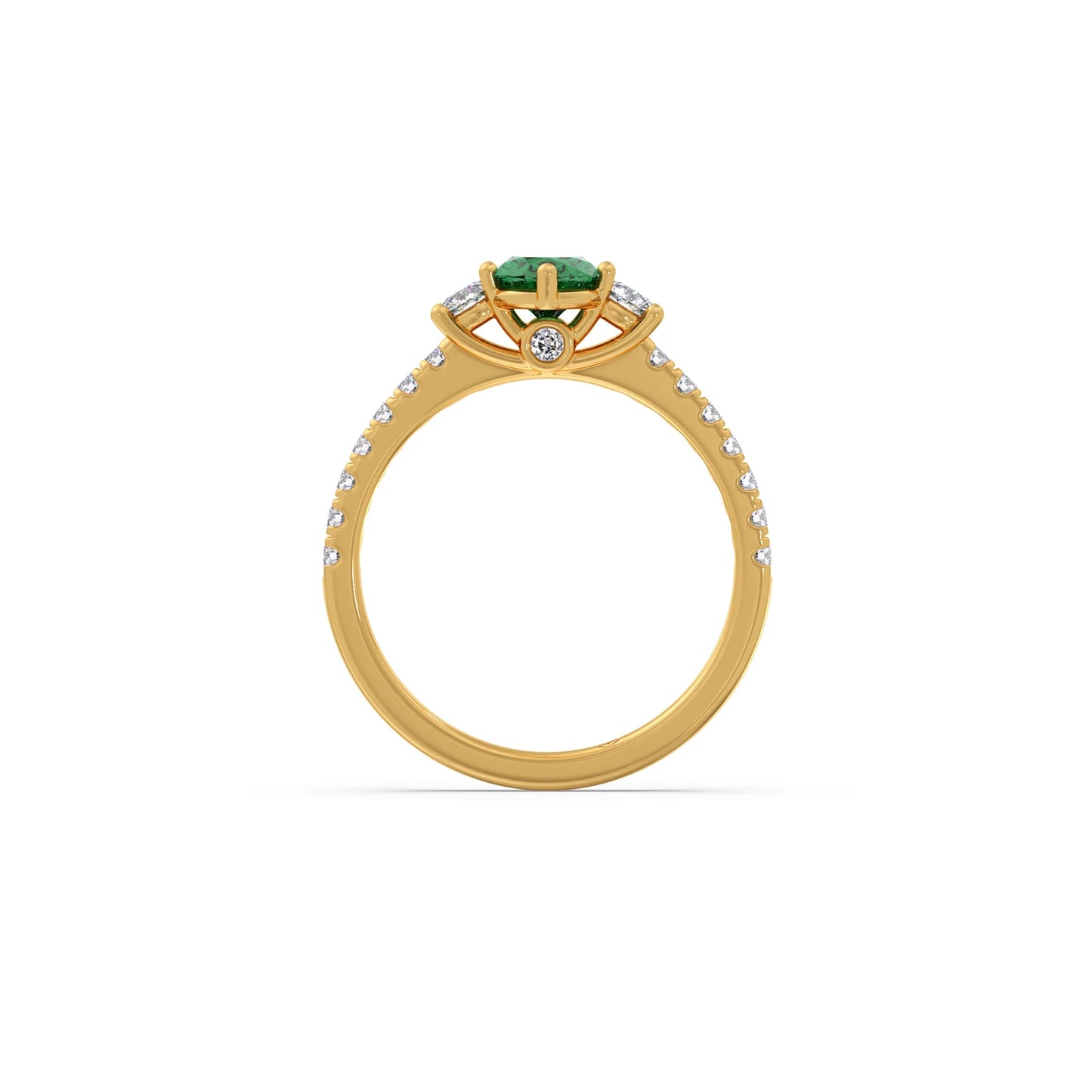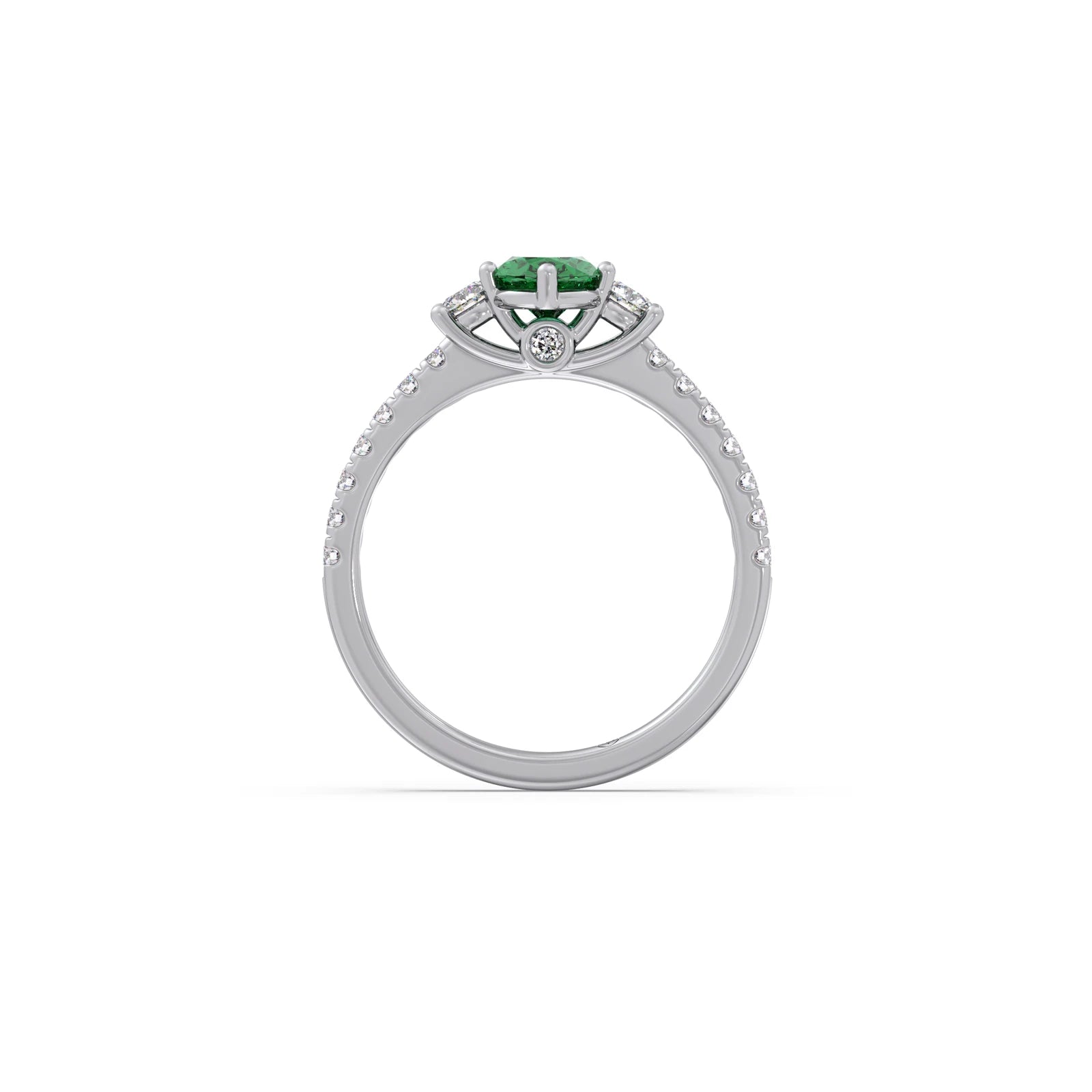 "Embrace vibrant elegance with this captivating trilogy ring, showcasing a lush green gemstone flanked by two brilliant round diamonds. Symbolizing past, present, and future, this exquisite piece offers a unique blend of rich color and dazzling sparkle. A truly distinctive and meaningful ring for those who cherish both beauty and sentiment."