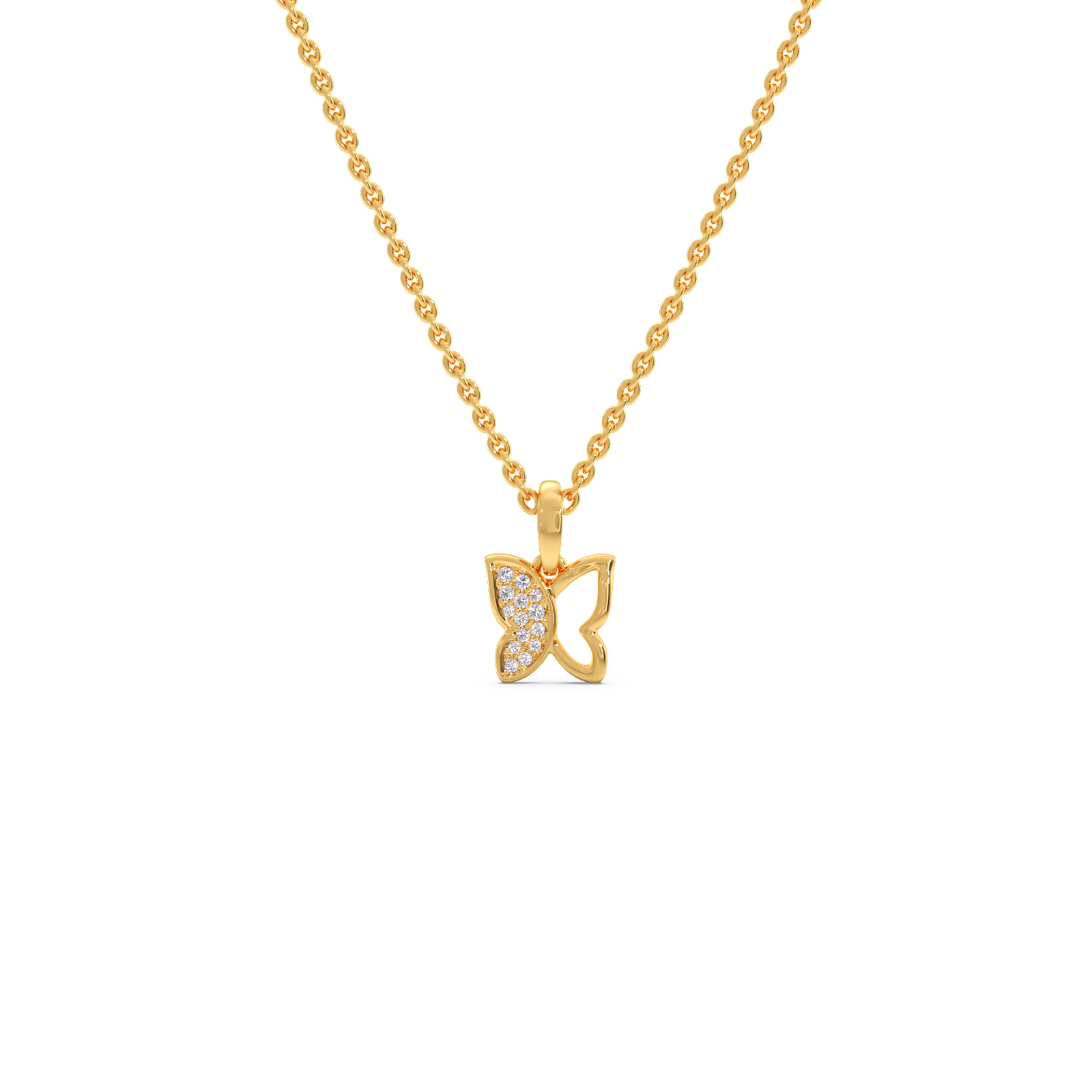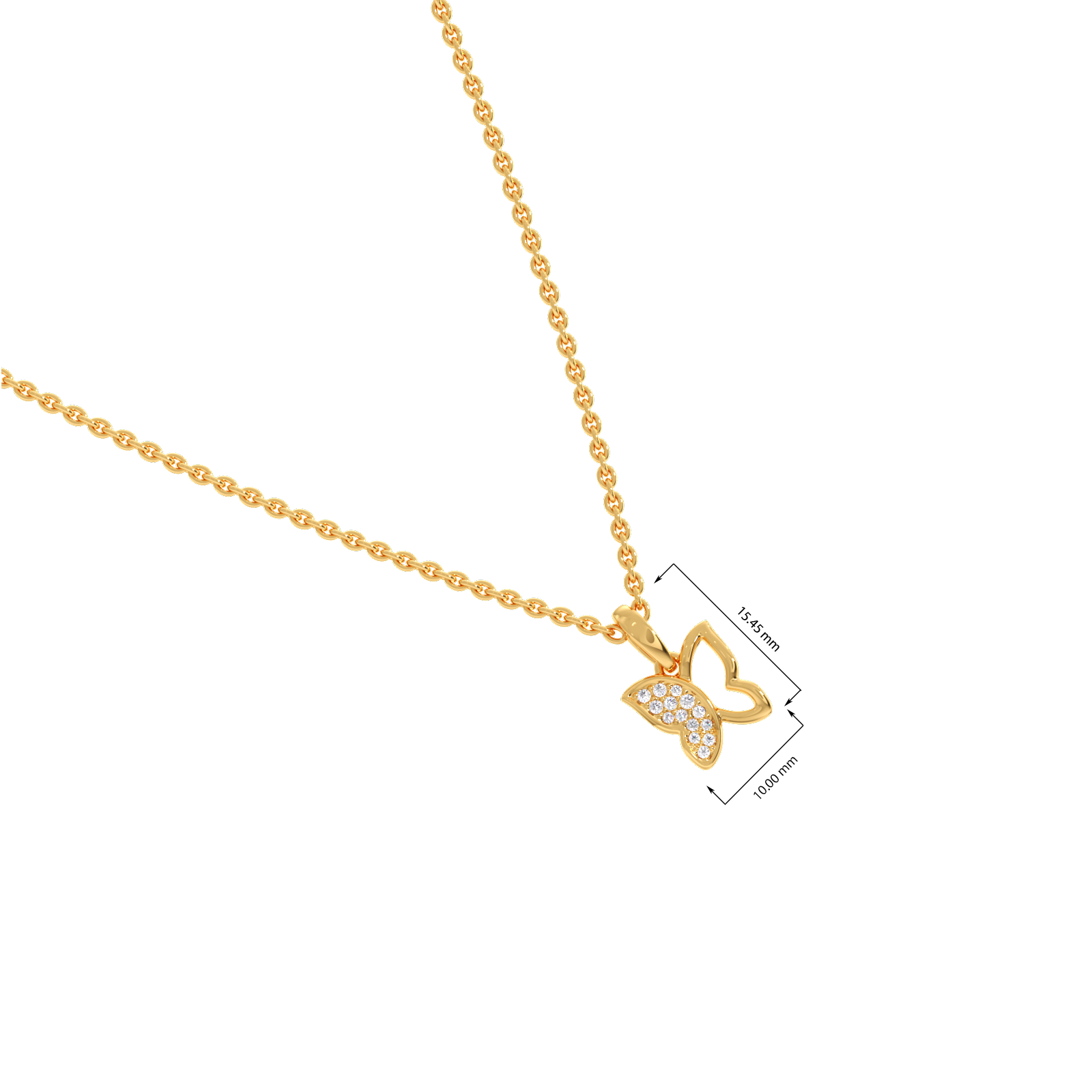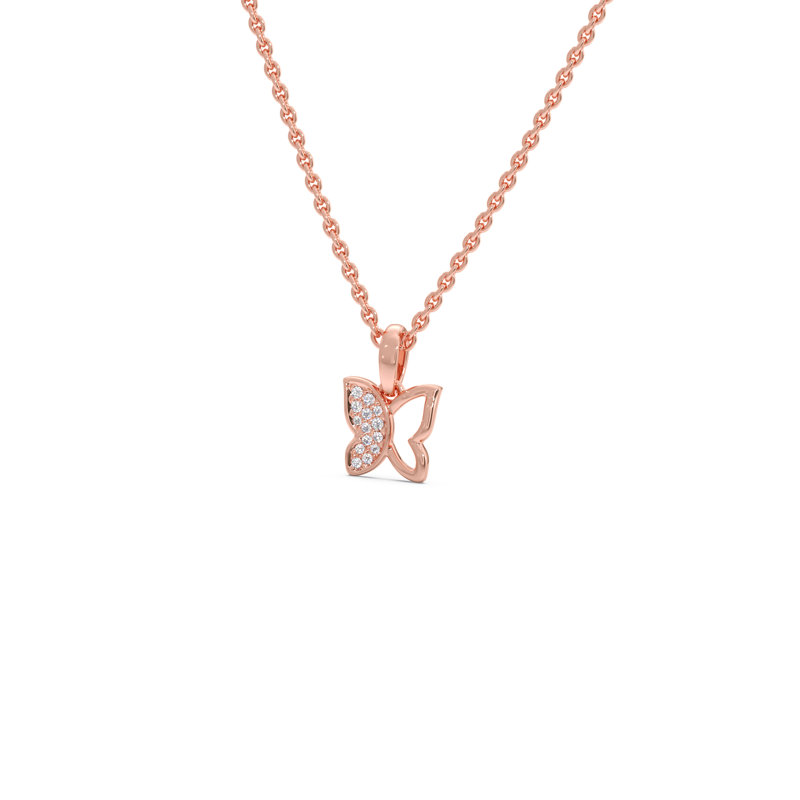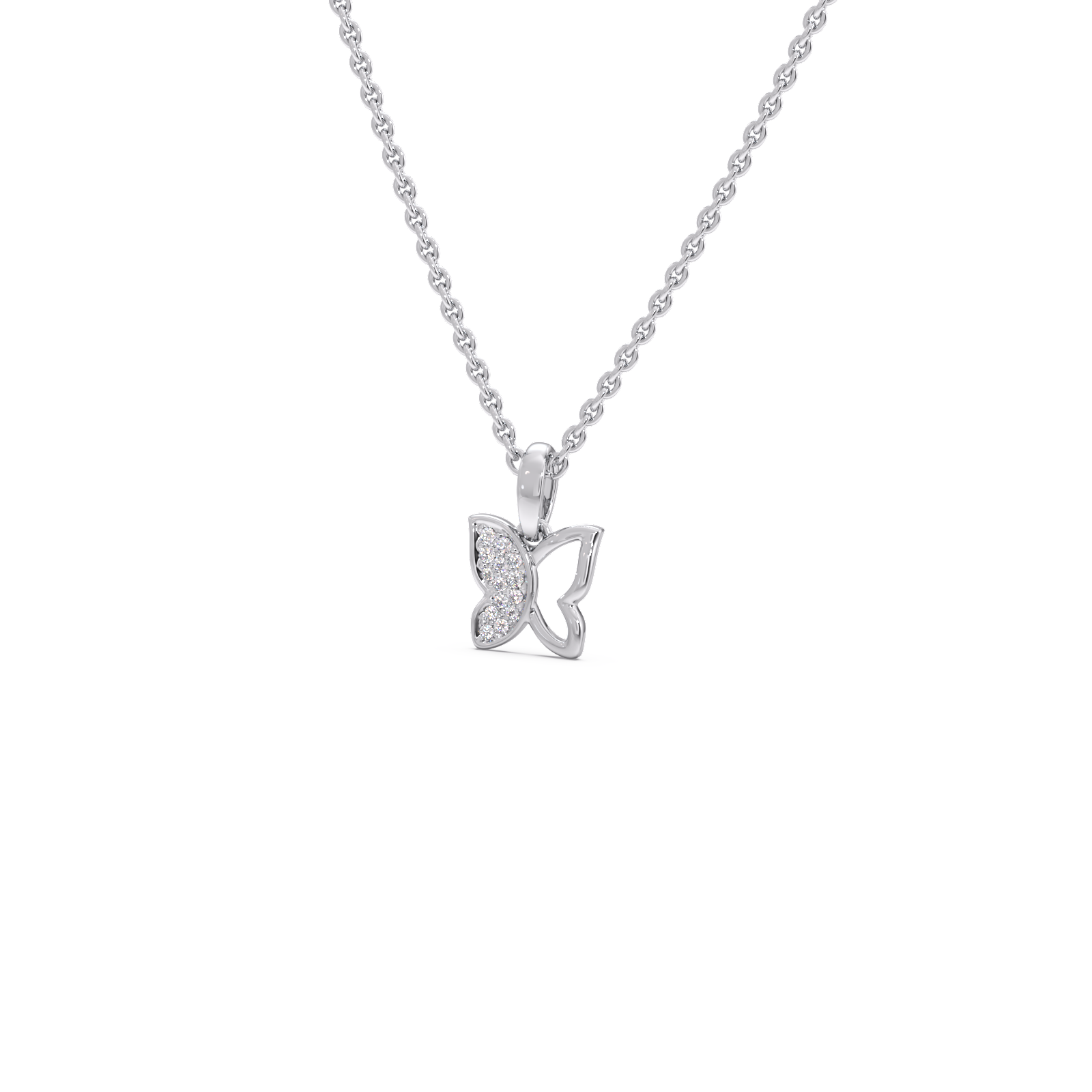 This Half Diamond Butterfly Pendant features a delicate butterfly design with one half adorned in shimmering Round Diamonds and the other in a sleek, open hollow style. Light and elegant, it adds a graceful charm and modern twist to any outfit.