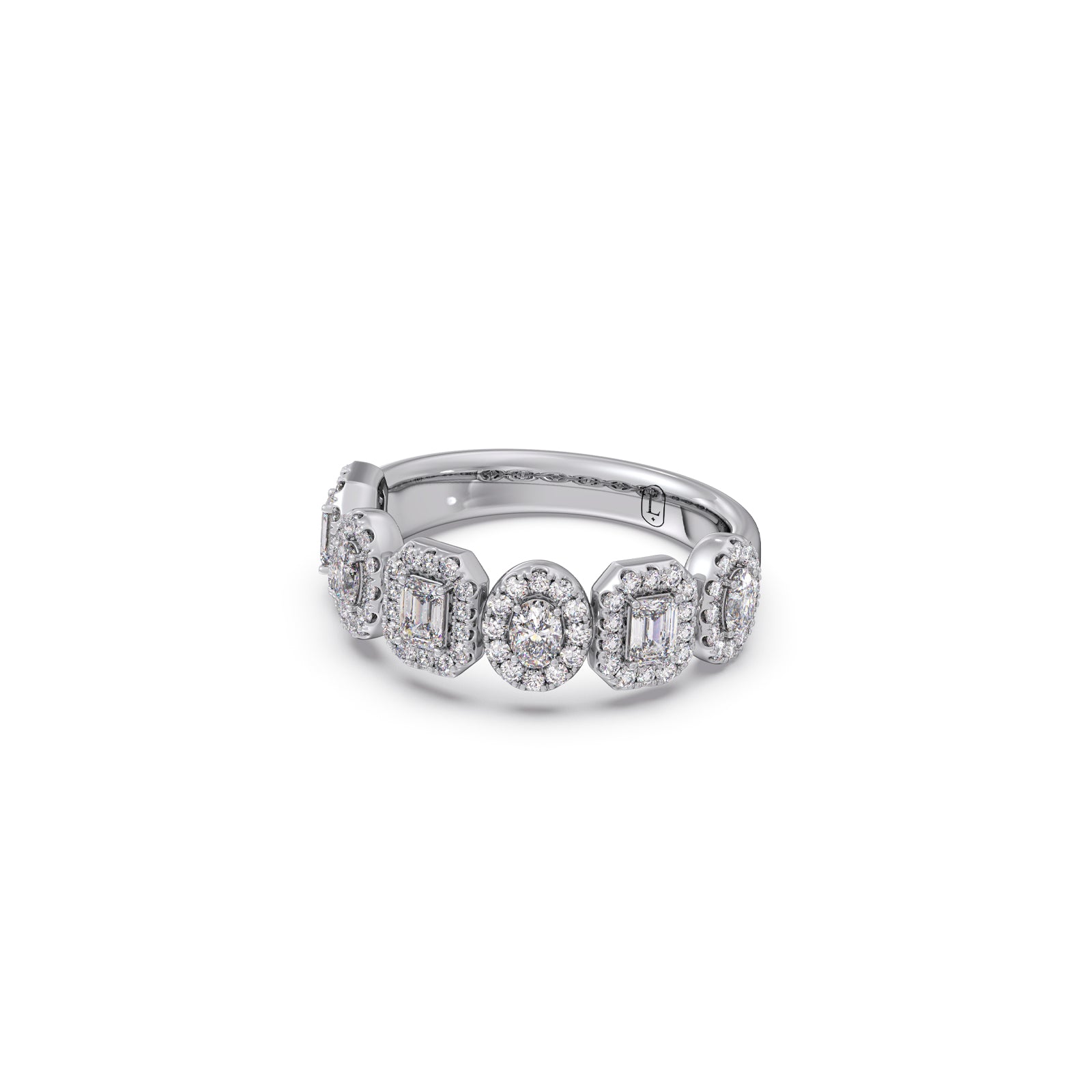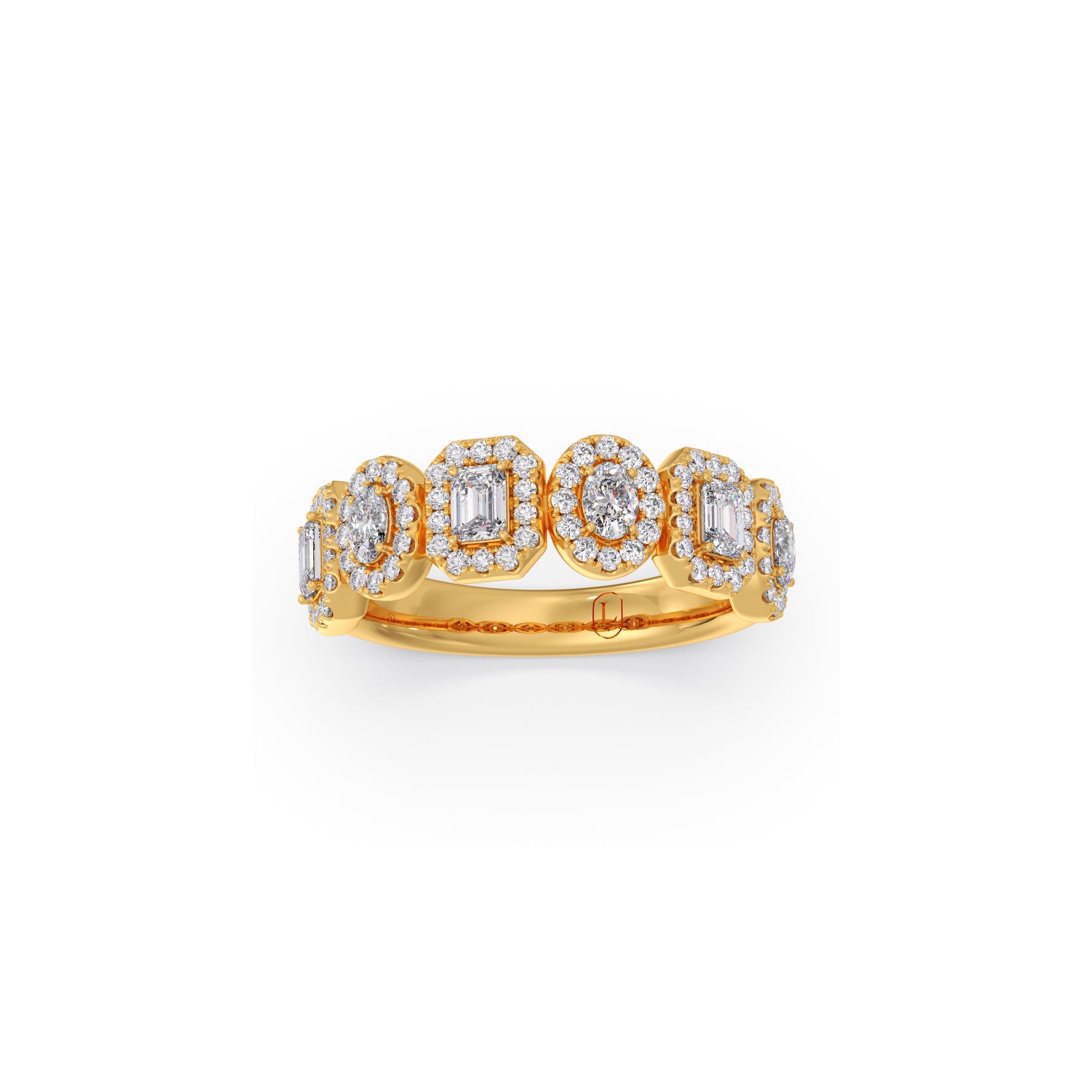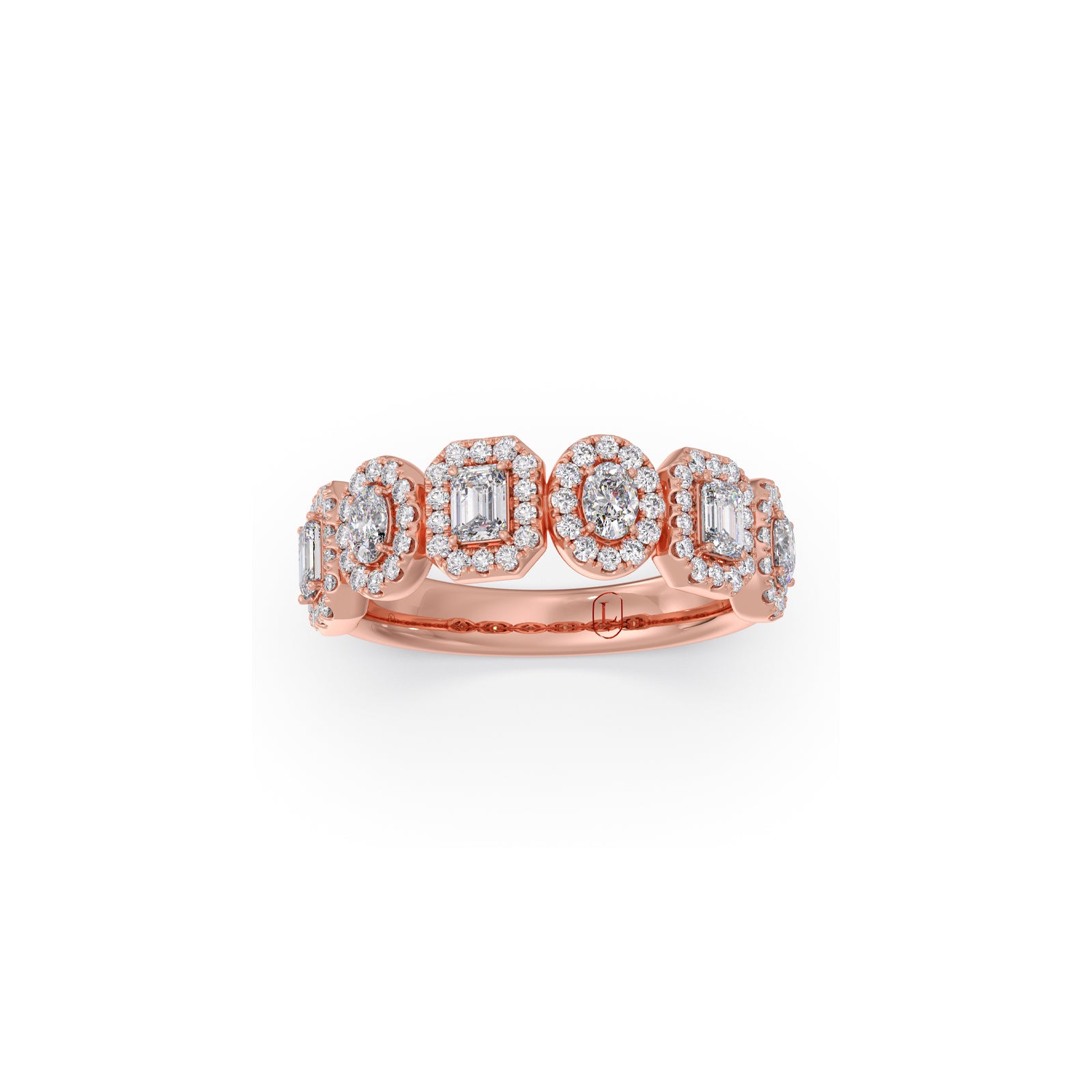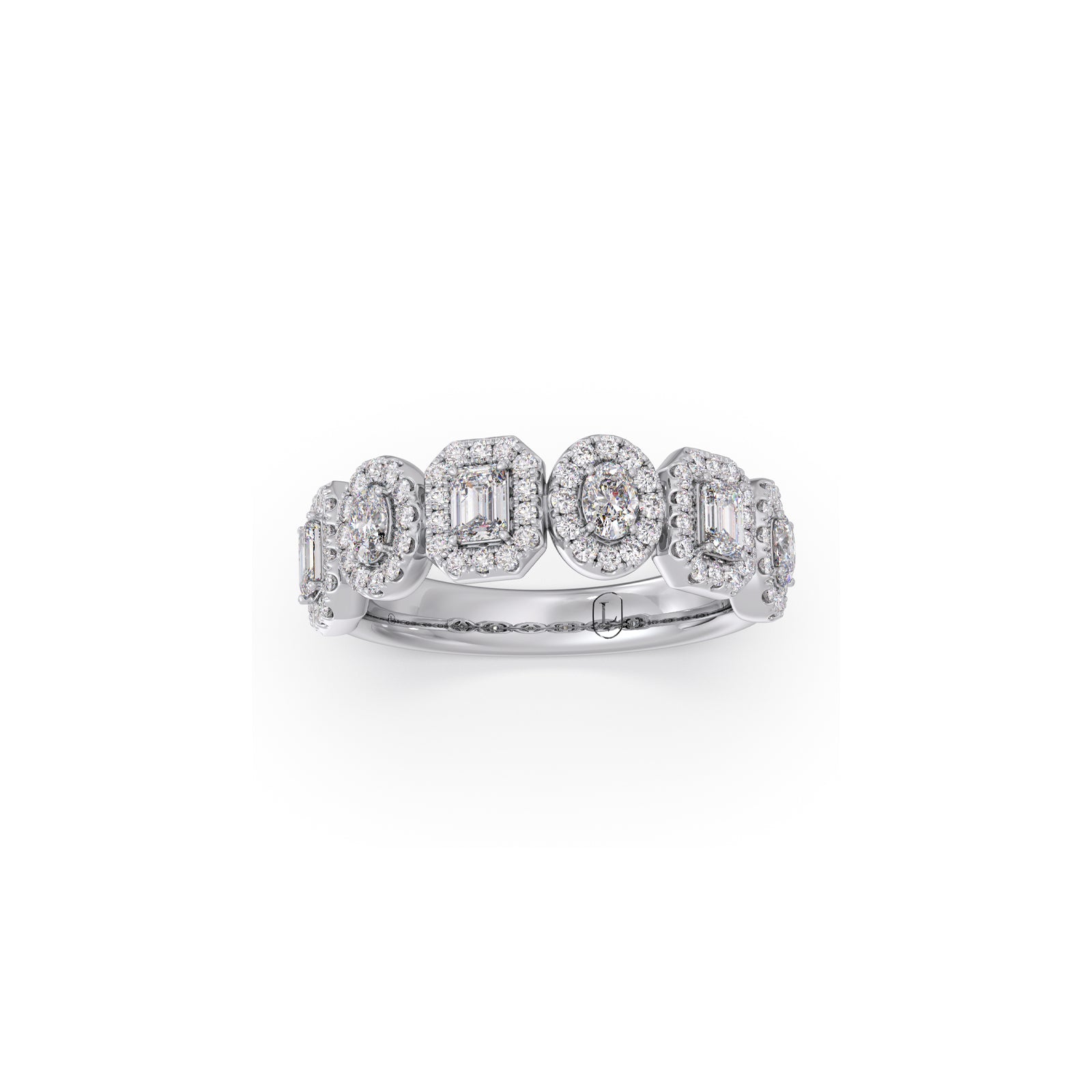 Discover unique brilliance with our Halo Emerald & Oval Diamond Half Eternity Ring. This captivating piece showcases alternating emerald and oval-cut diamonds, each embraced by a shimmering halo. Set elegantly along a half-eternity band, it creates a symphony of shapes and an exquisite display of continuous sparkle, truly an eye-catching treasure.