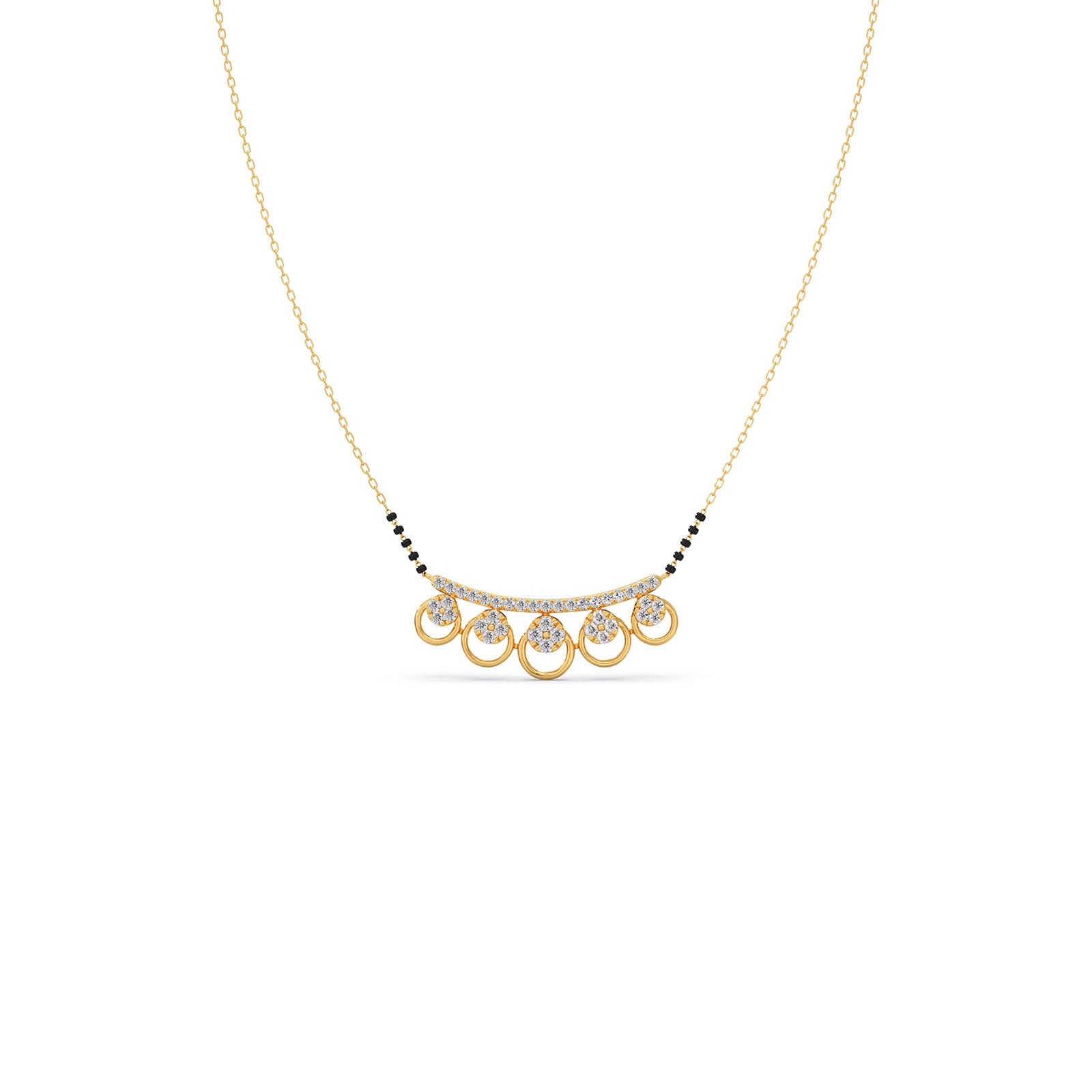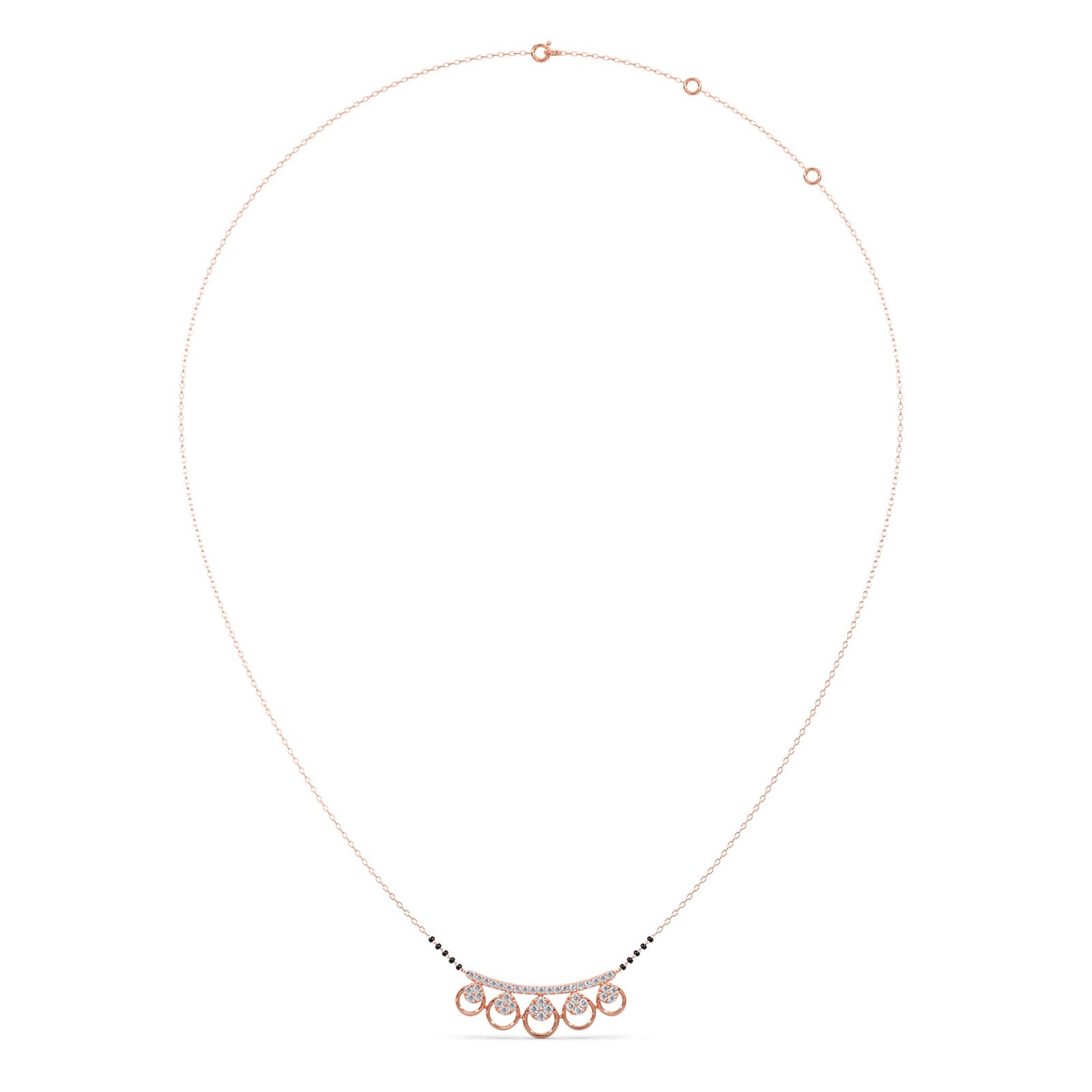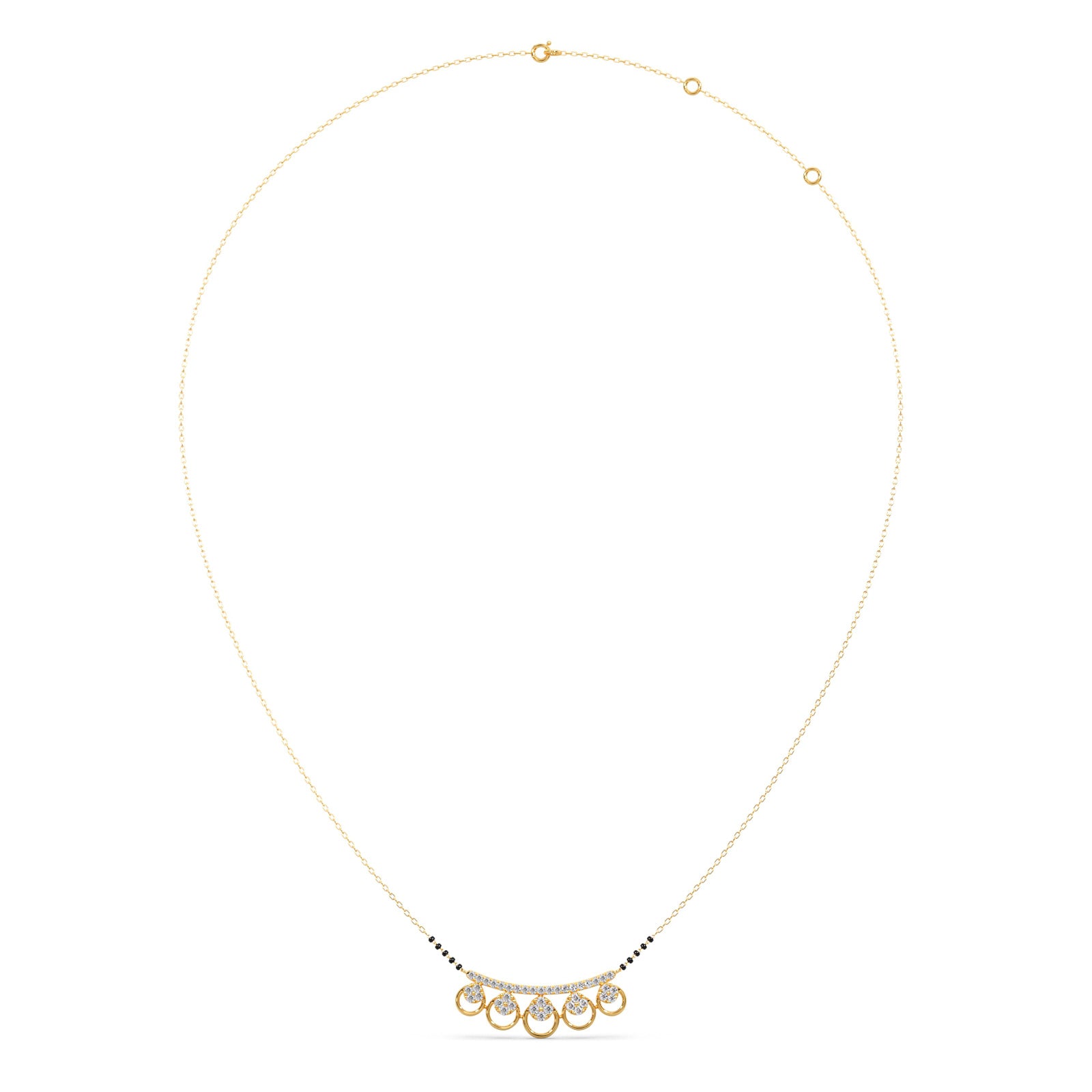 The Halo Flow Tanmaniya is a modern interpretation of tradition, featuring a delicate line of black beads leading to a crescent of graduating metal circles. Each circle cradles shimmering round diamonds, creating a graceful flow of light and form-minimal yet striking, designed for everyday elegance and timeless symbolism.
