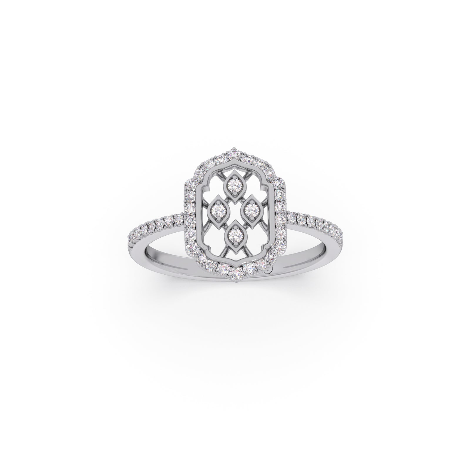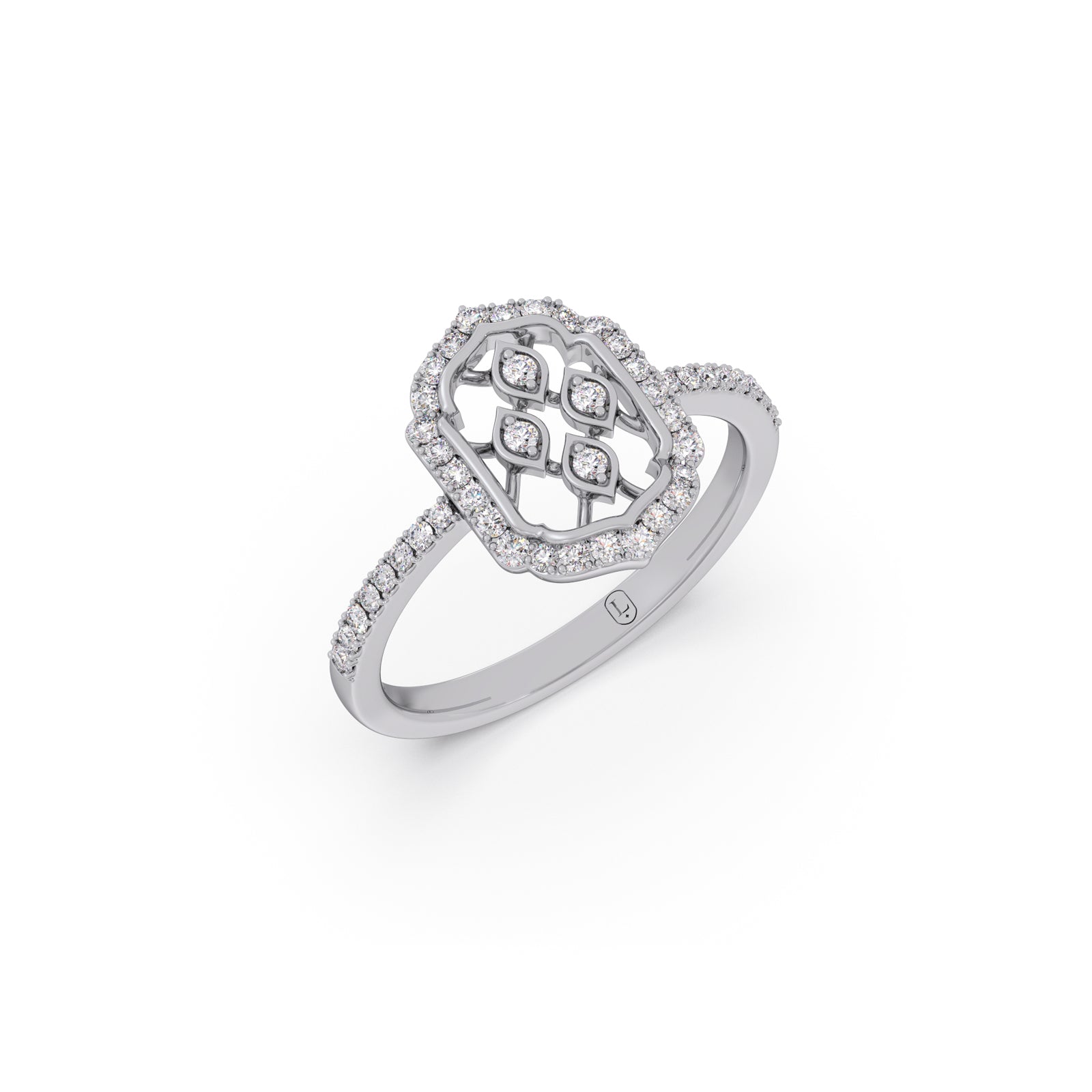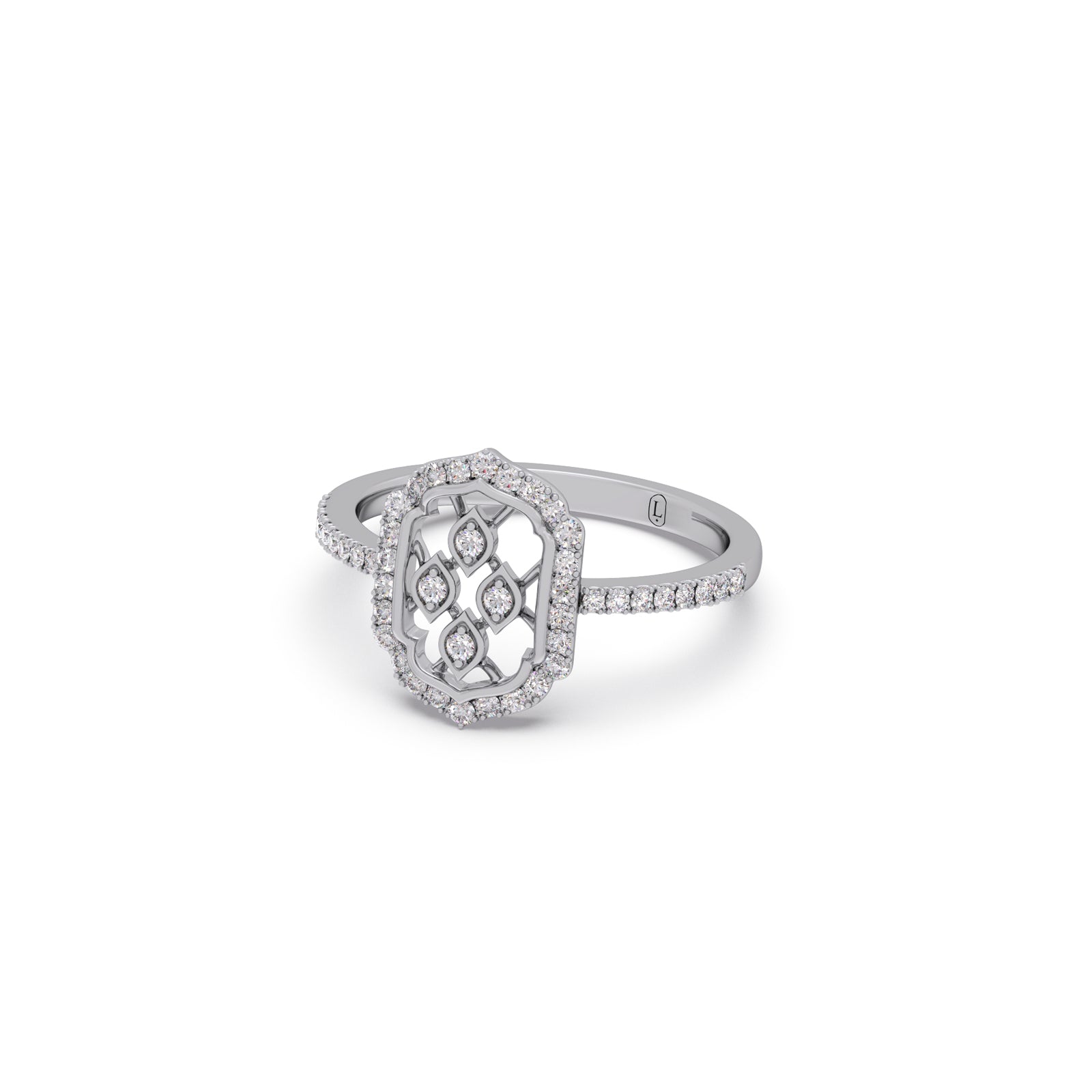 Timeless regality meets modern sparkle. A diamond halo frames an intricate geometric lattice, giving this ring the feel of a precious antique casket. A statement piece of heirloom quality and dazzling brilliance, designed to be cherished forever.