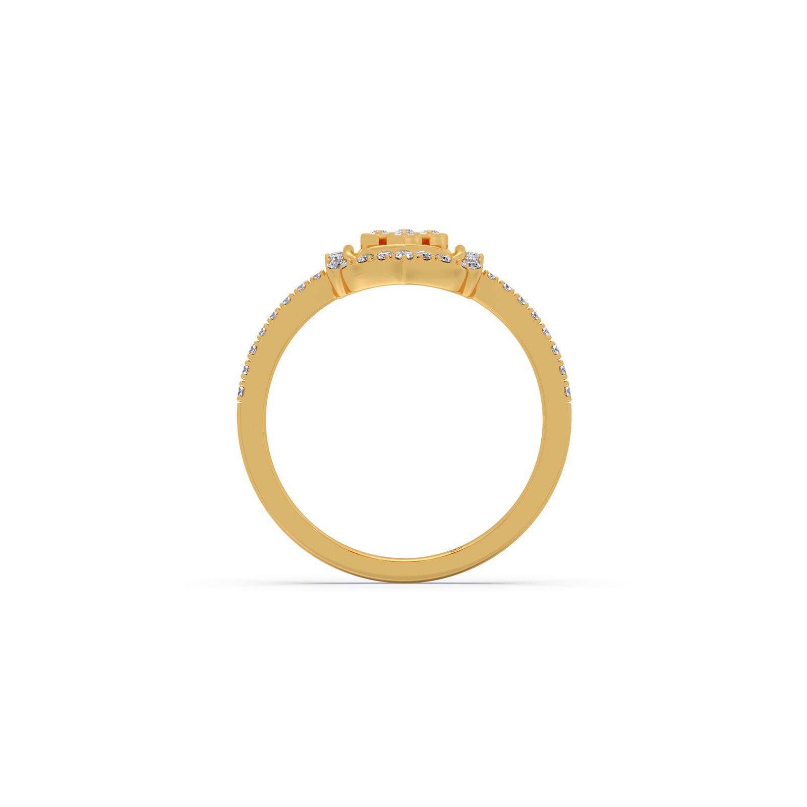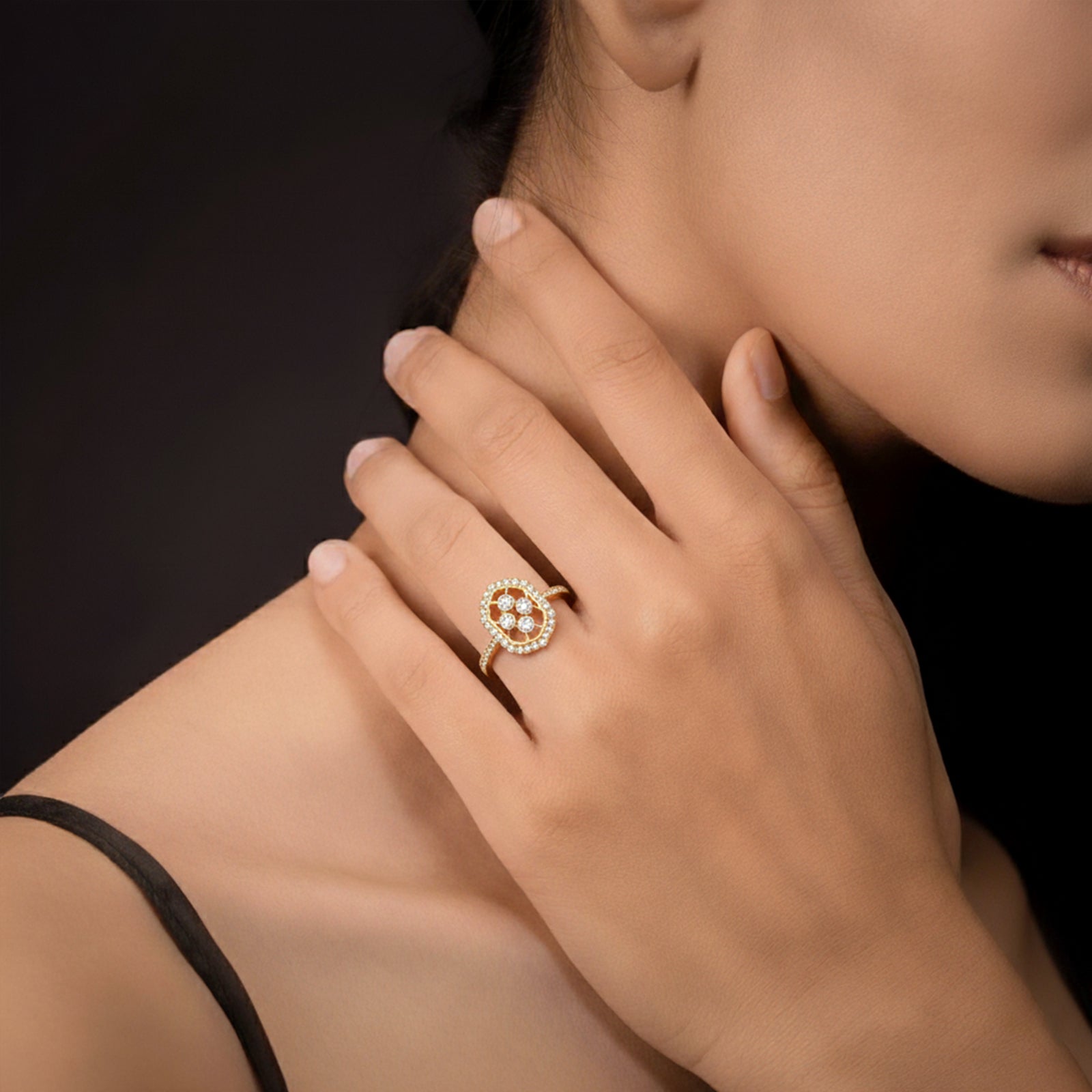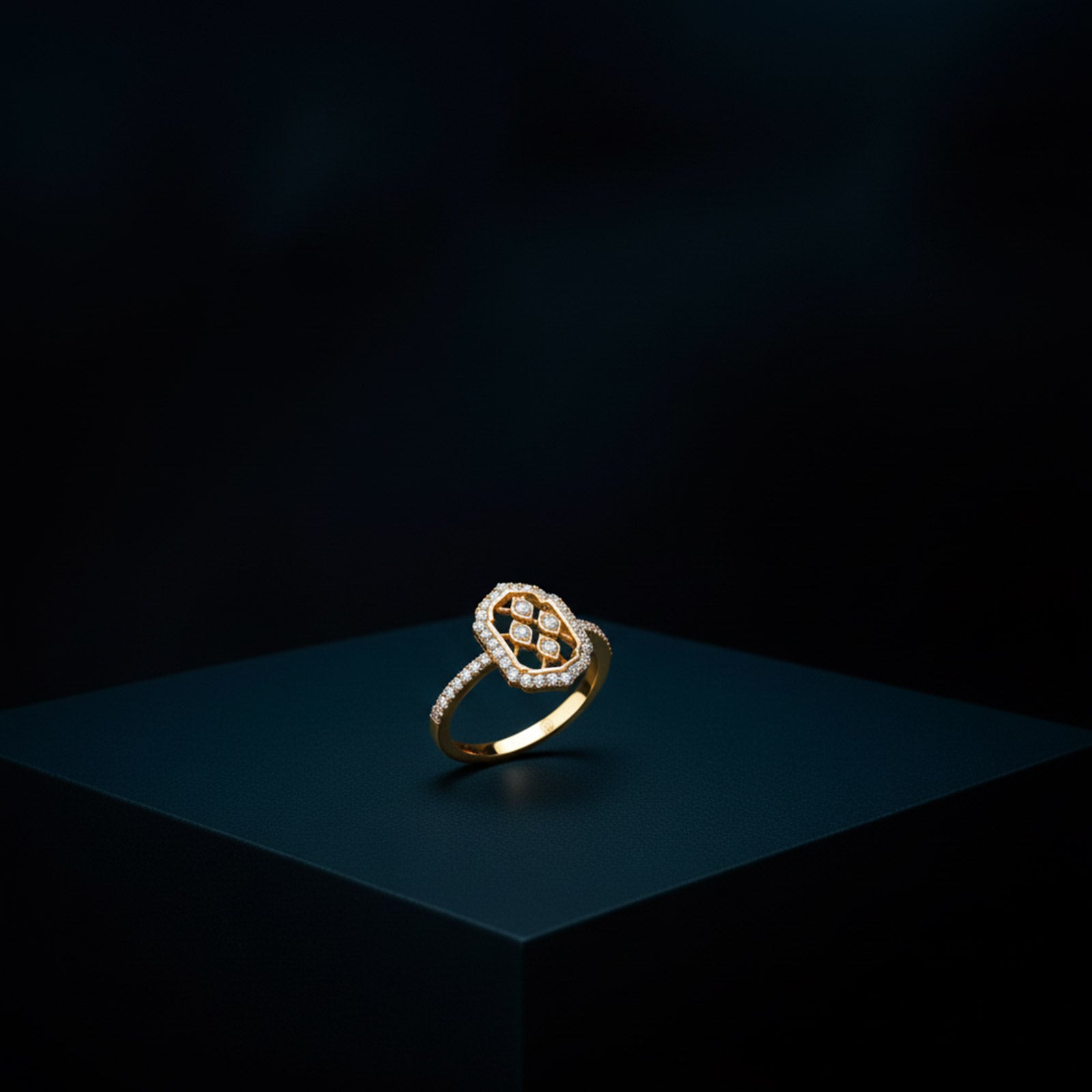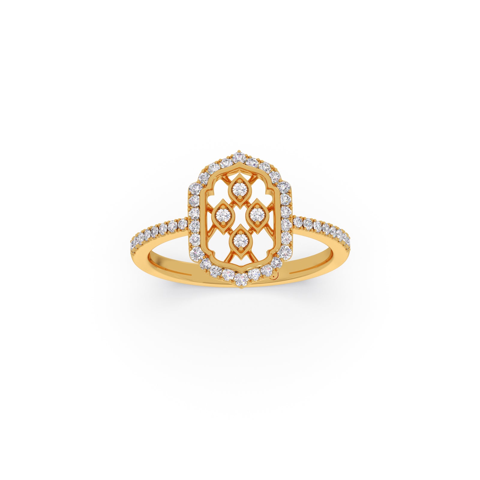 Timeless regality meets modern sparkle. A diamond halo frames an intricate geometric lattice, giving this ring the feel of a precious antique casket. A statement piece of heirloom quality and dazzling brilliance, designed to be cherished forever.