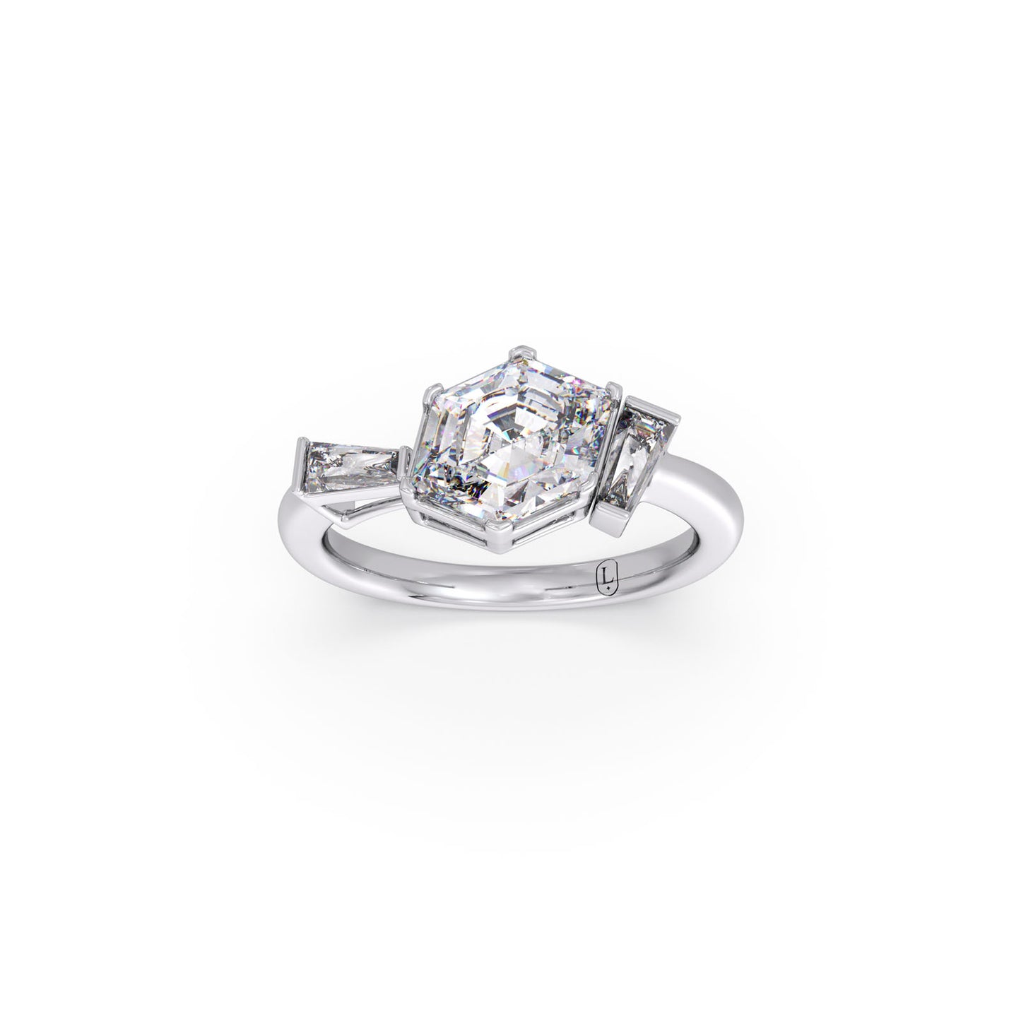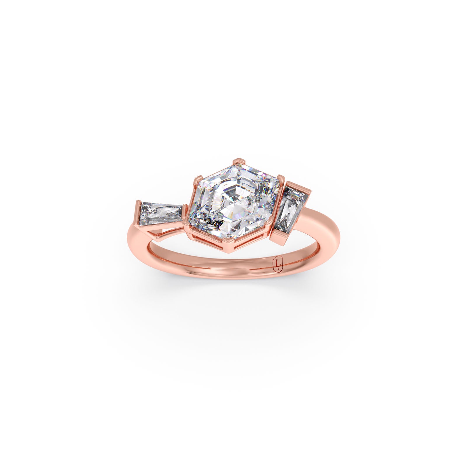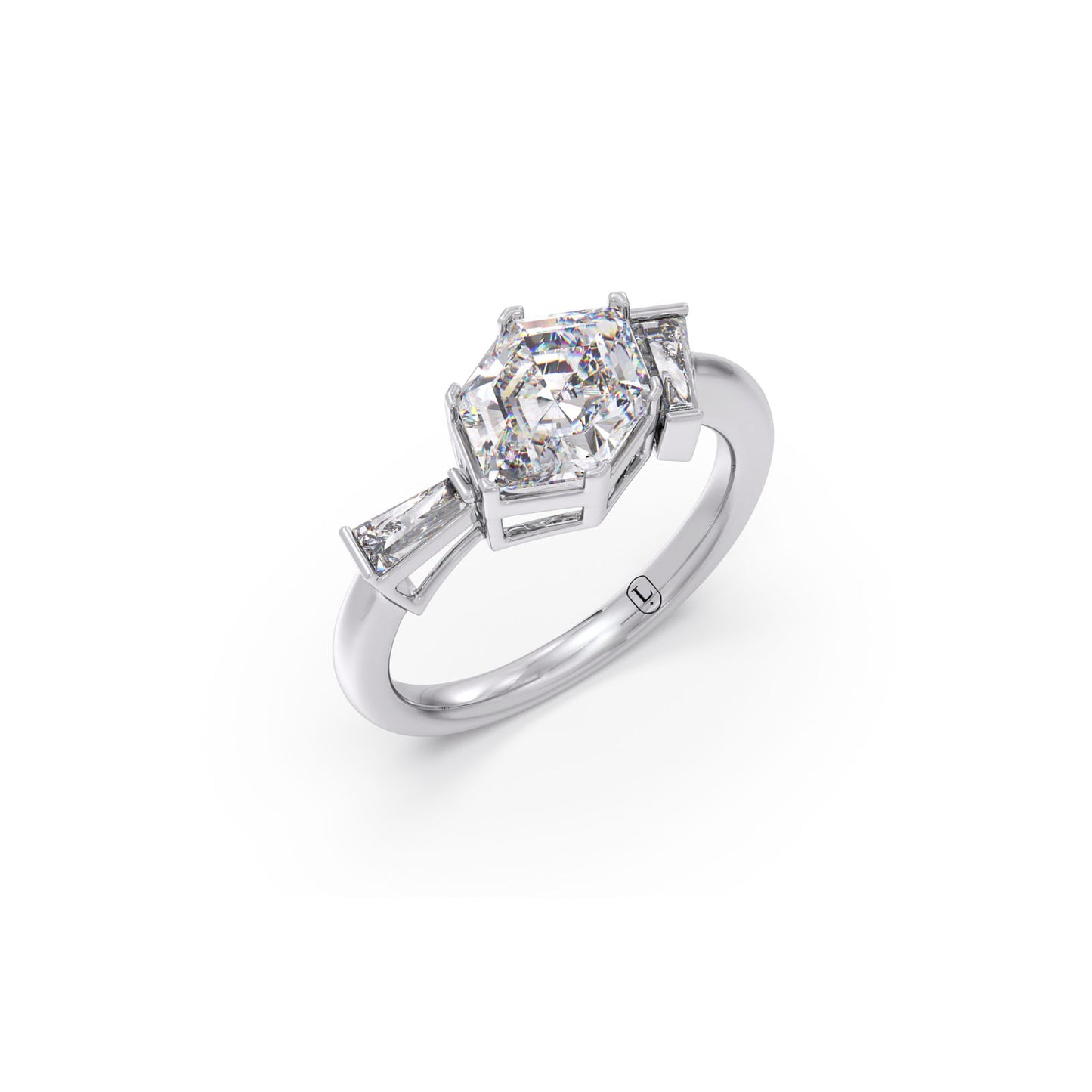 A Hexa Solitaire rises at the center, its facets reflecting strength through change. Two Baguettes on either side echo clarity and direction, forming a path of balance. Together, they embody transformation—a journey of resilience, renewal, and the beauty of emerging stronger.