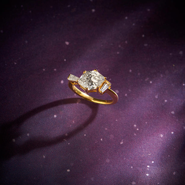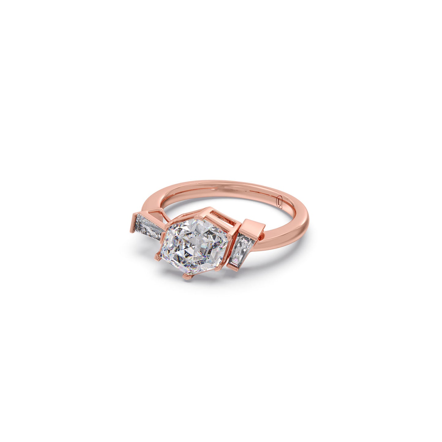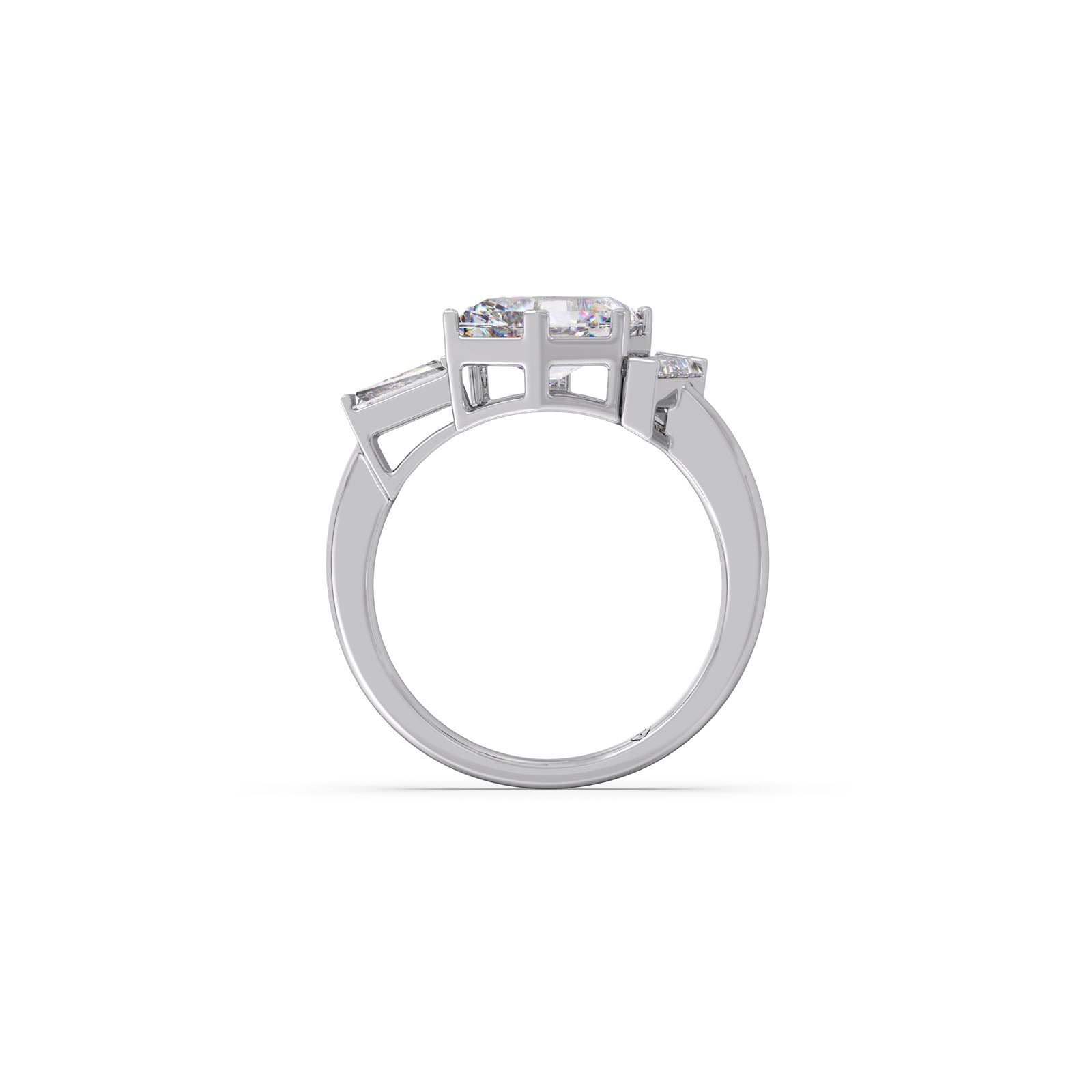 A Hexa Solitaire rises at the center, its facets reflecting strength through change. Two Baguettes on either side echo clarity and direction, forming a path of balance. Together, they embody transformation—a journey of resilience, renewal, and the beauty of emerging stronger.