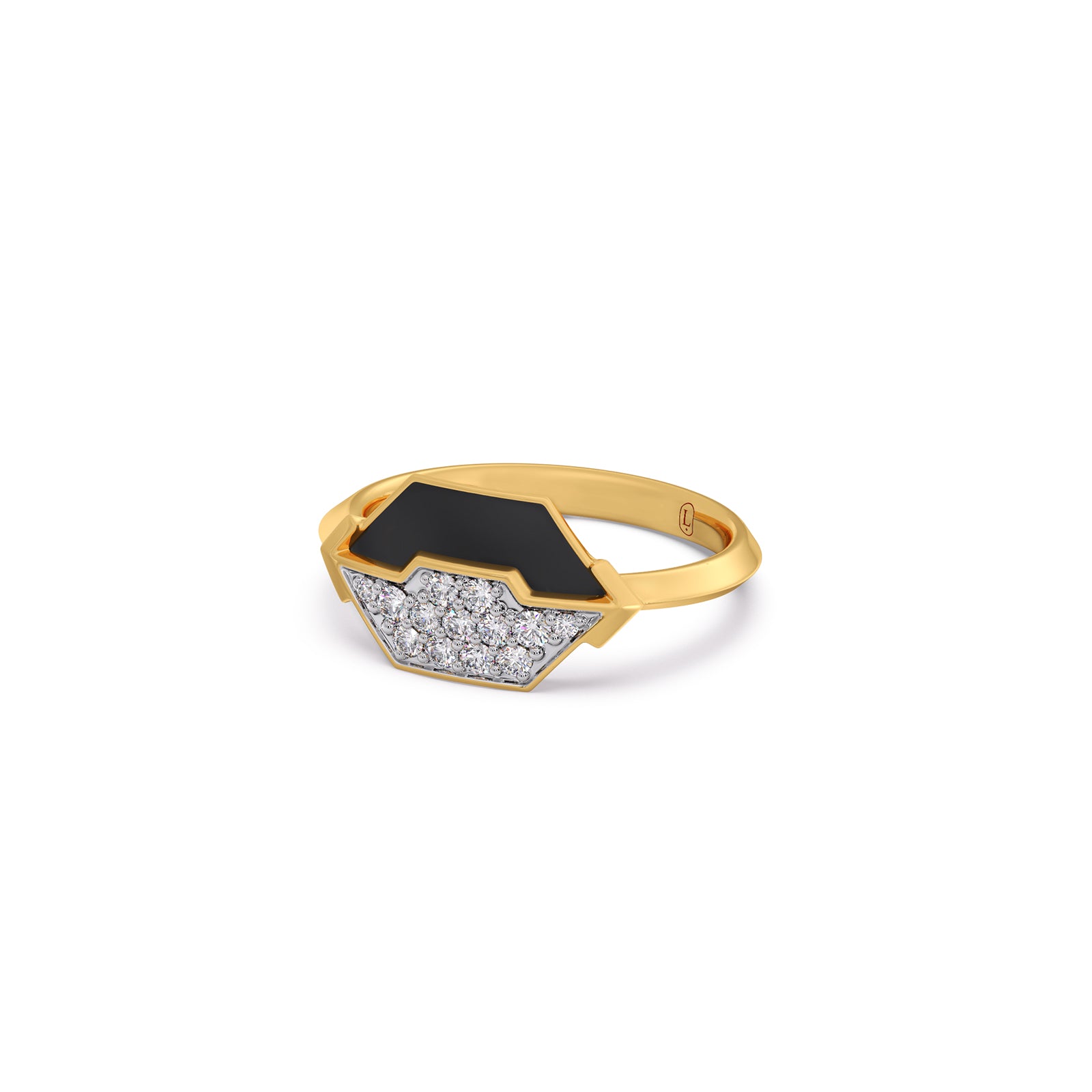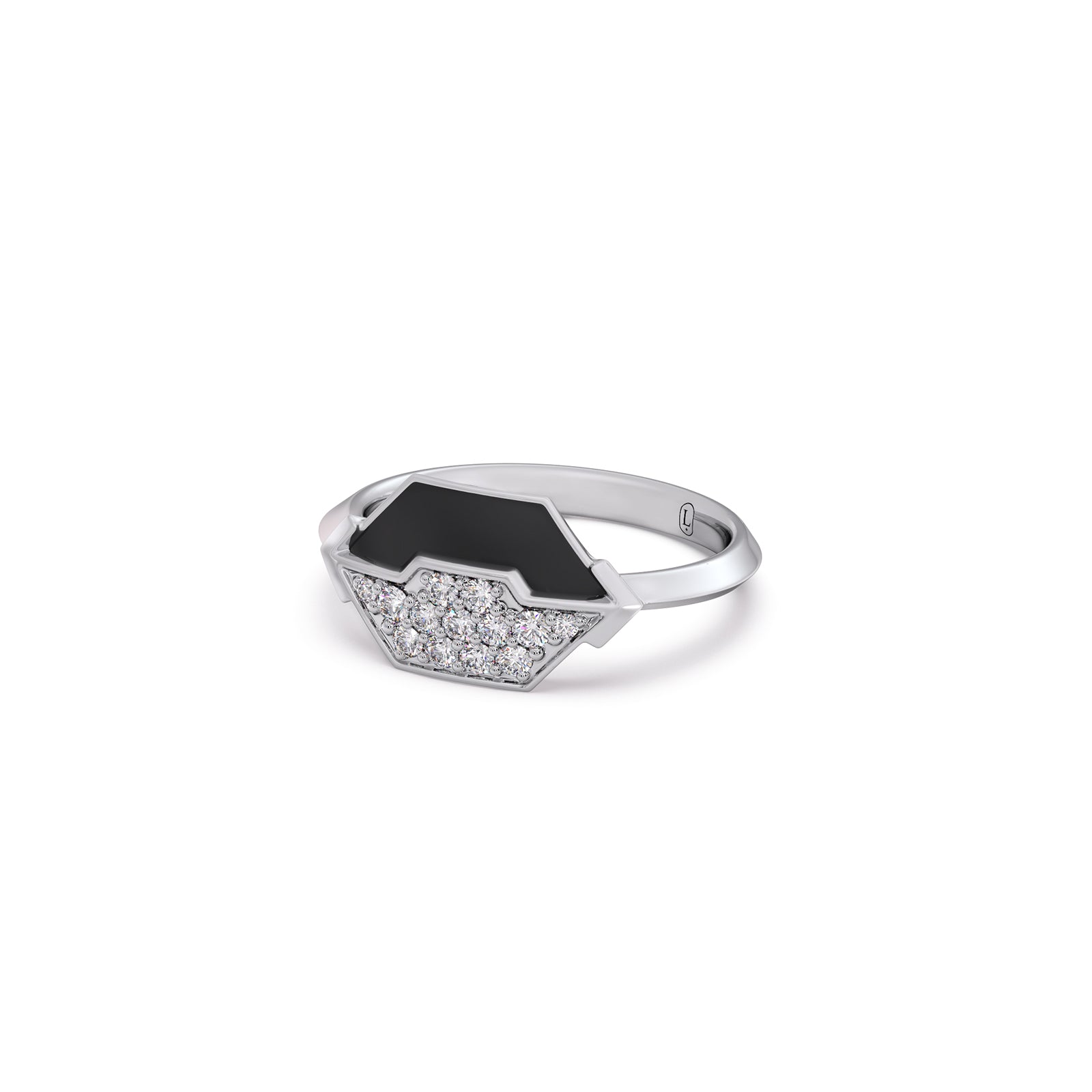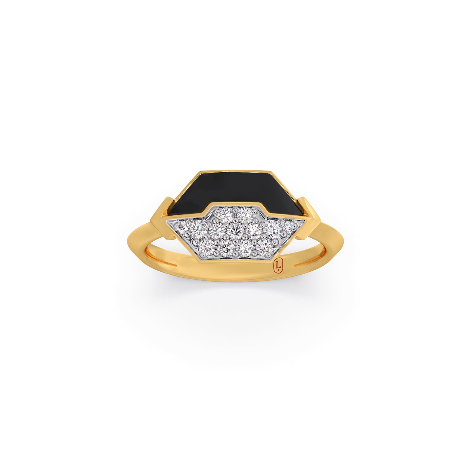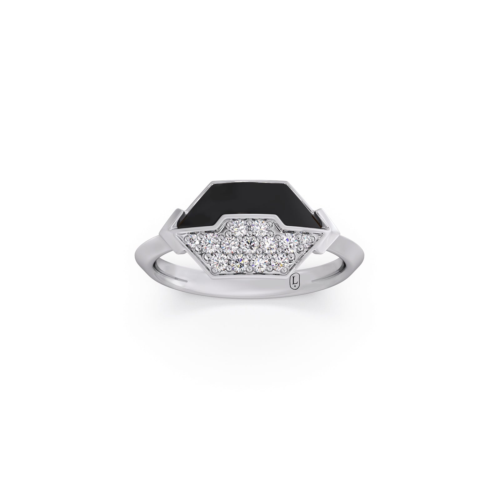 This Hexa-Enamel Round Diamond Ring features a black enamel side frame with shimmering field of round-cut diamonds set in a prong setting. It offers a "modern luxury" look, making it a sophisticated choice for both formal occasions and elevated daily wear.