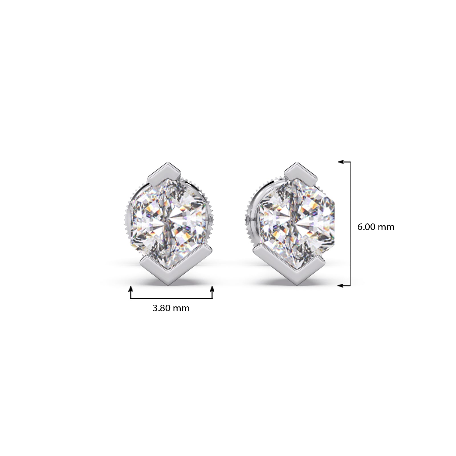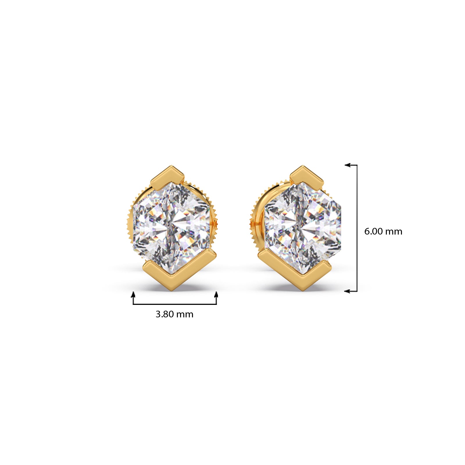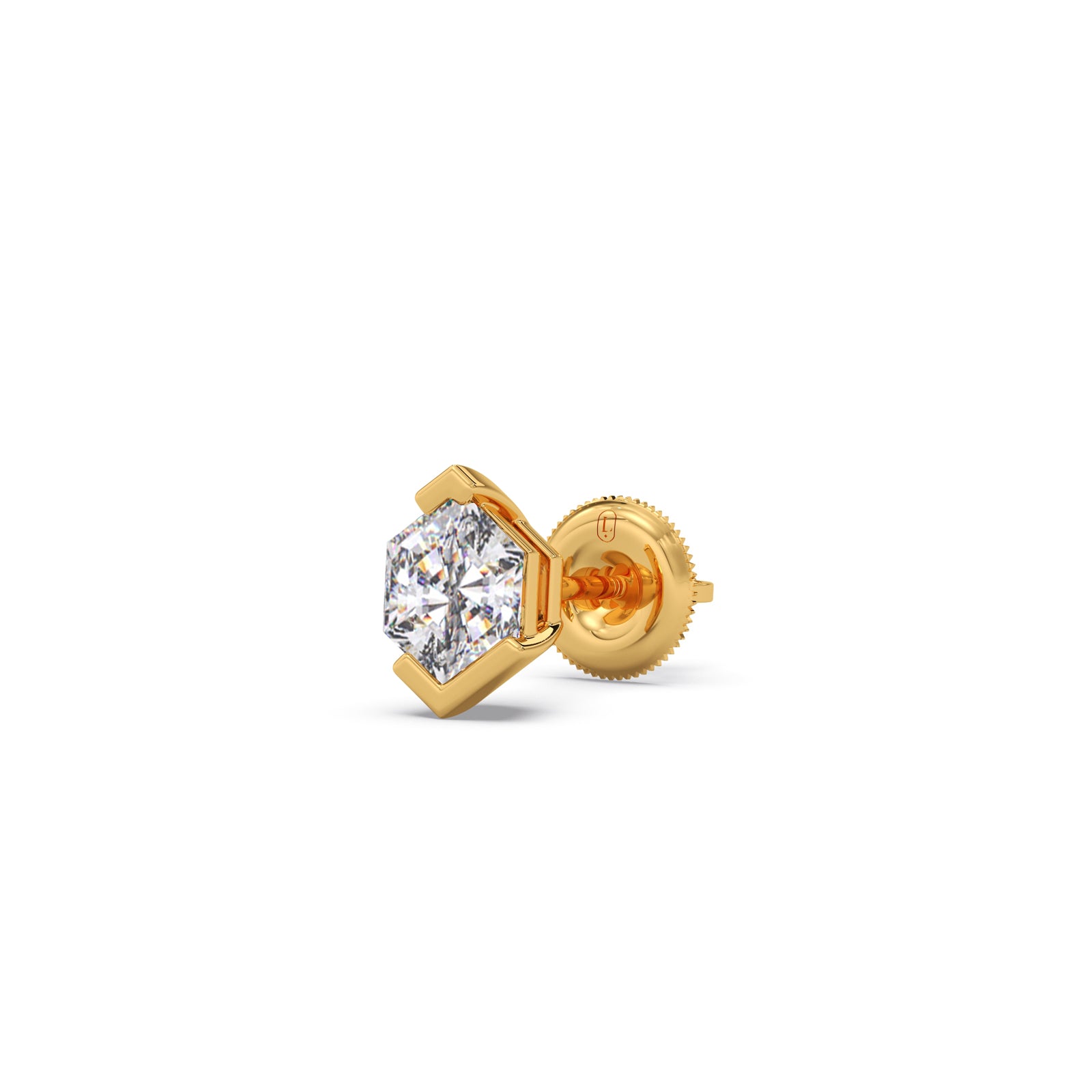 The Hexa Smallitaires Half Bezel Earrings features a unique hexa-cut diamond, securely nestled in a sleek half bezel setting. With its modern geometric shape and minimalist design, this earring offers a bold yet refined look—perfect for adding contemporary elegance to any ensemble.