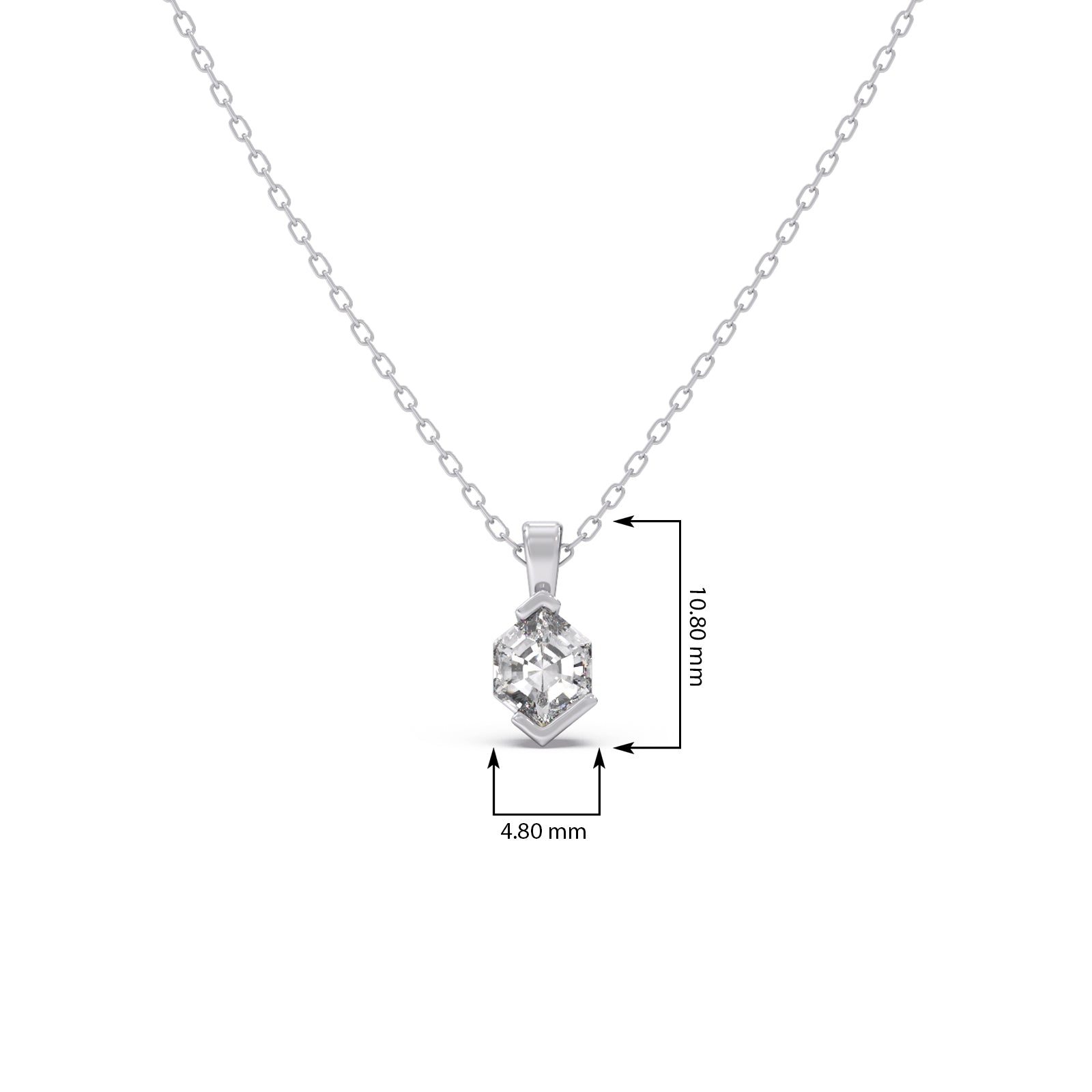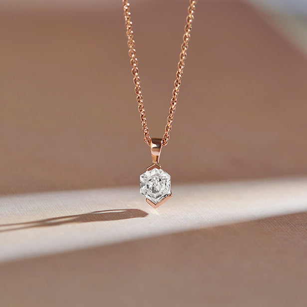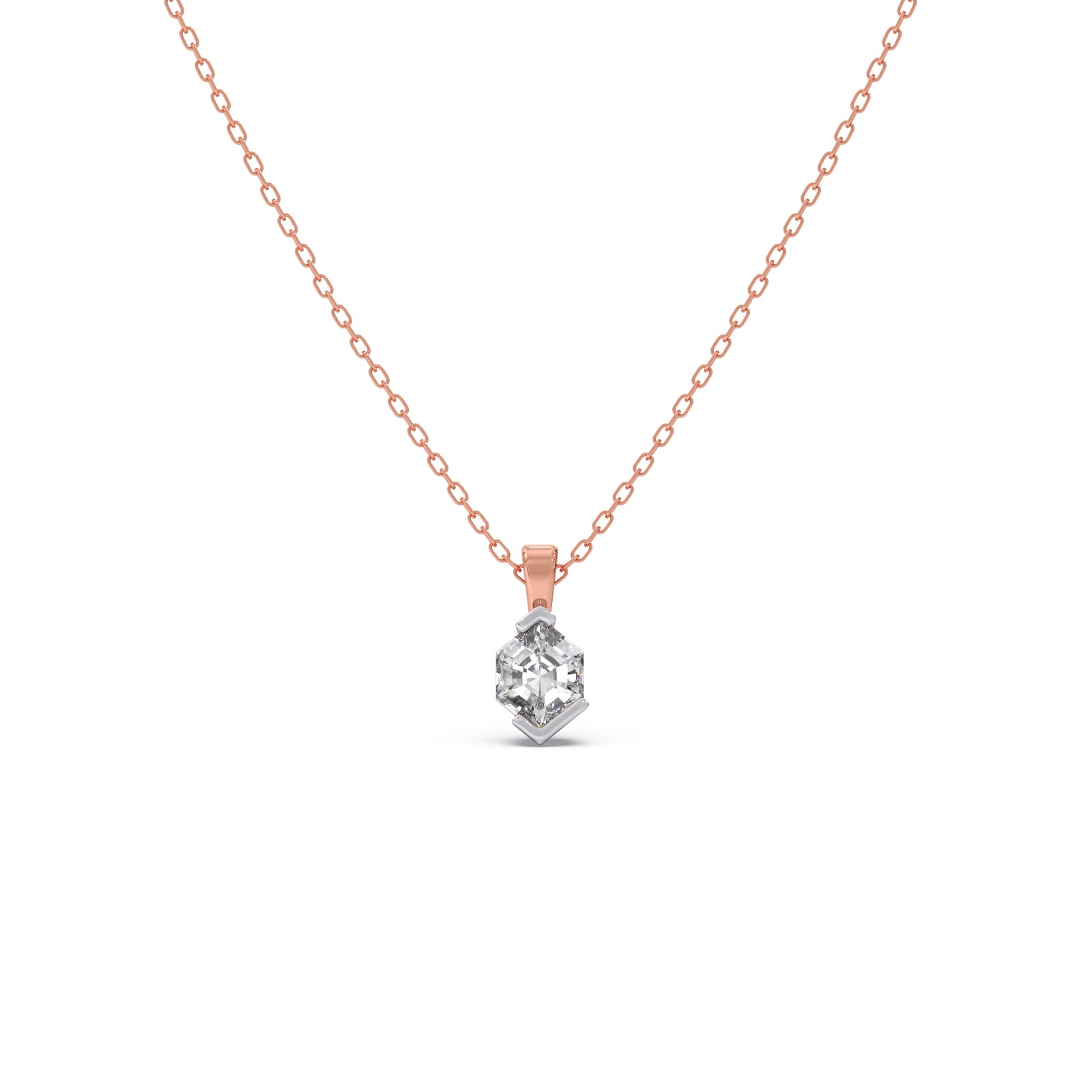 The Hexa Solitaire Half Bezel Pendant Necklace features a striking hexa-cut diamond, elegantly framed in a sleek half bezel setting. Suspended from a delicate chain, this modern pendant blends geometric charm with minimalist sophistication—perfect for everyday elegance or a bold yet refined statement.