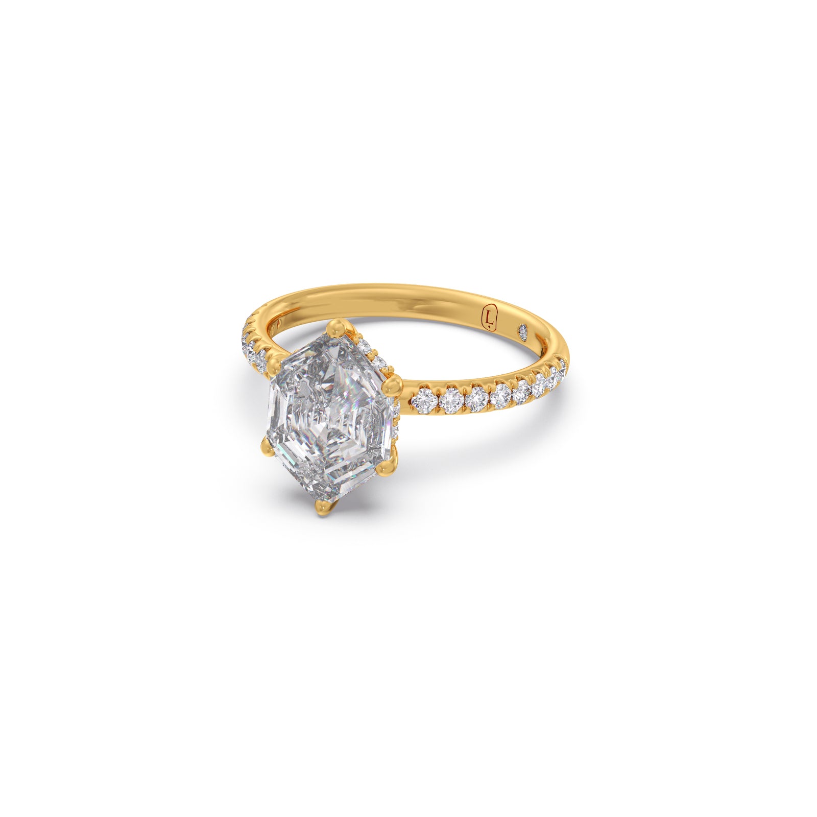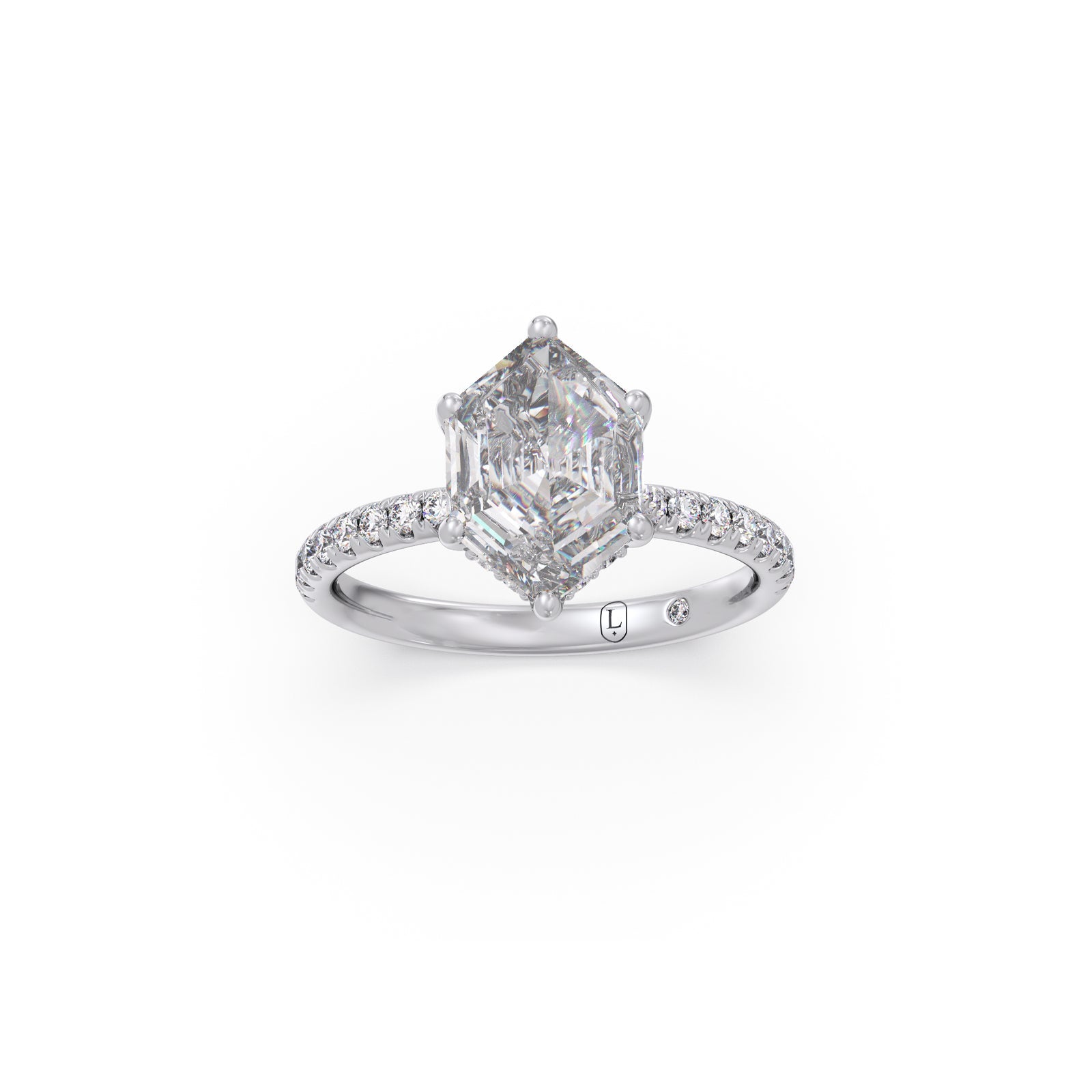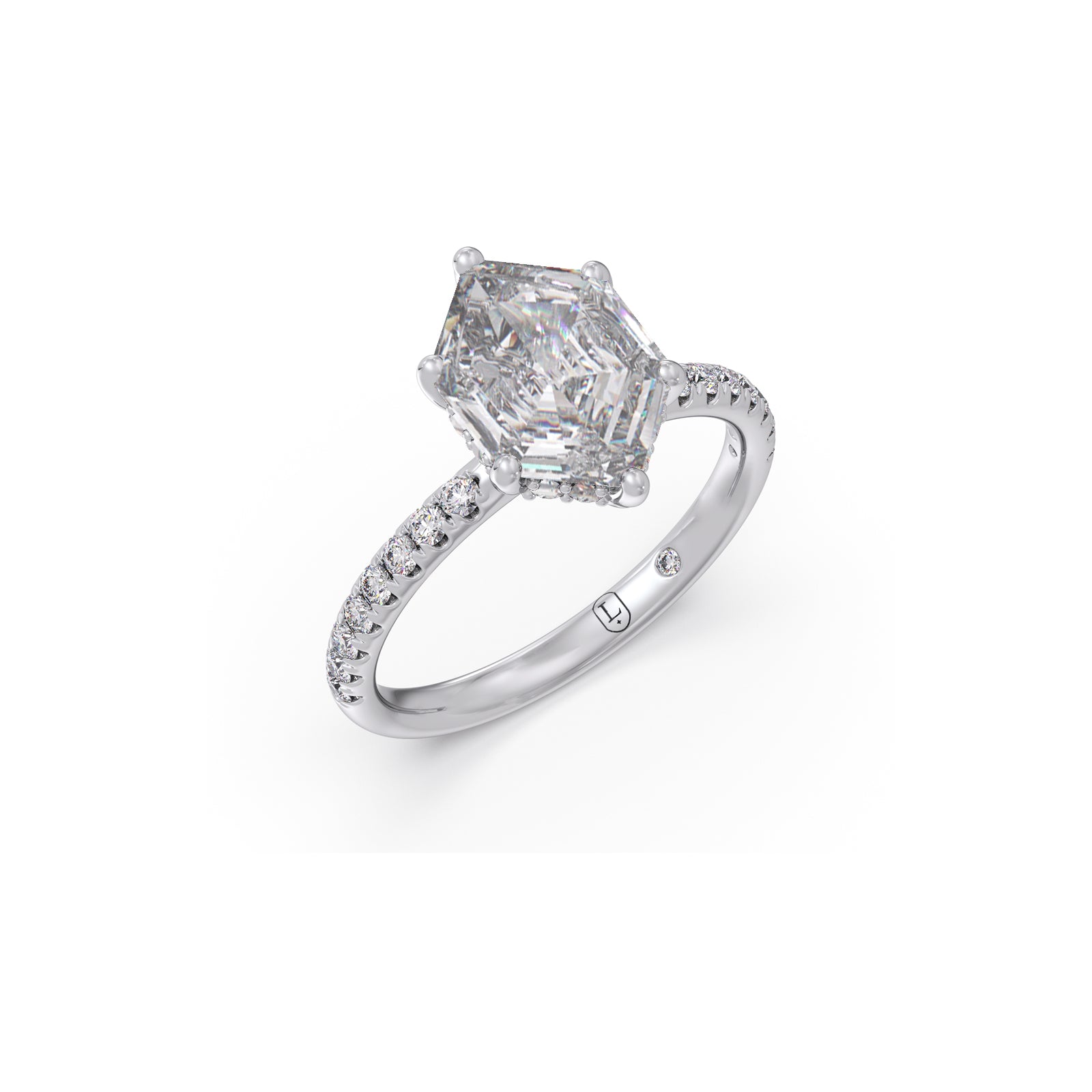 Crafted for the moment you choose forever. A 2.5 ct. Hexa solitaire radiates from a shank adorned with 28 round diamonds—each a reflection of the path you walked to love. One hidden diamond within, for the quiet strength that led you here.